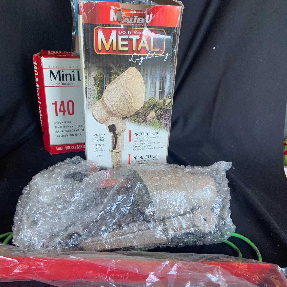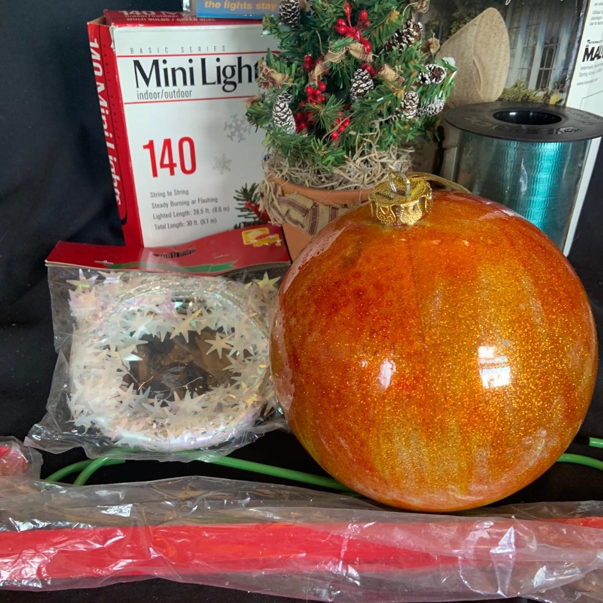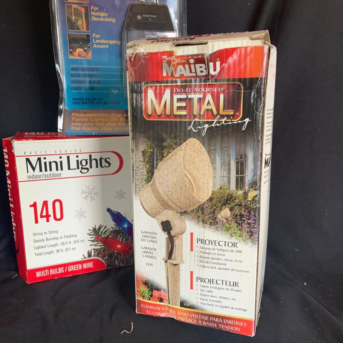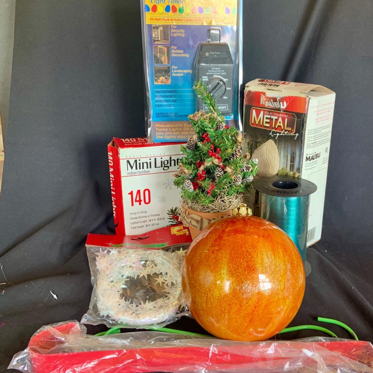 LOT:114: Holiday Indoor/Outdoor Decorations Including Mini Lights, Light Timer, Spot Light Wreath Hanger, and More