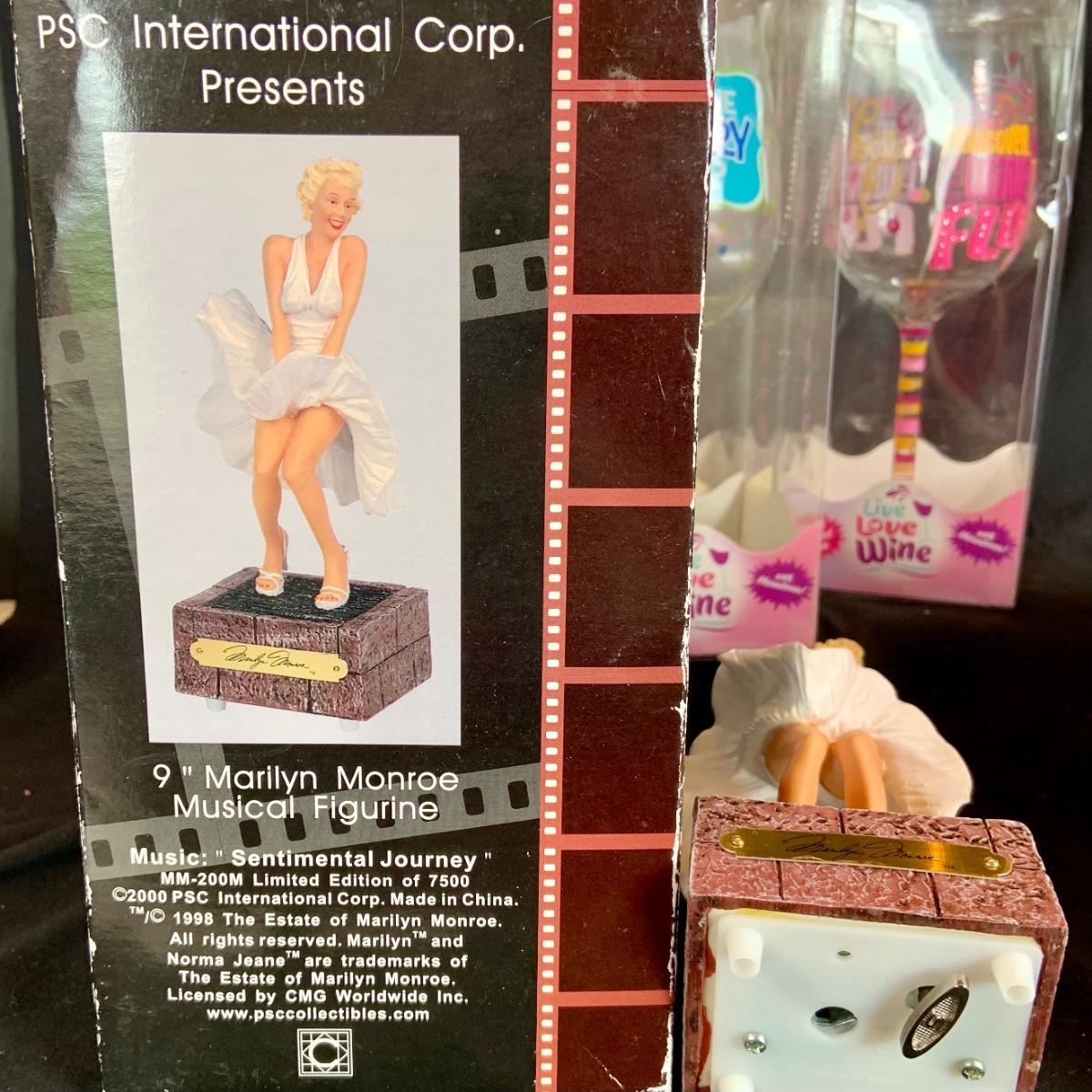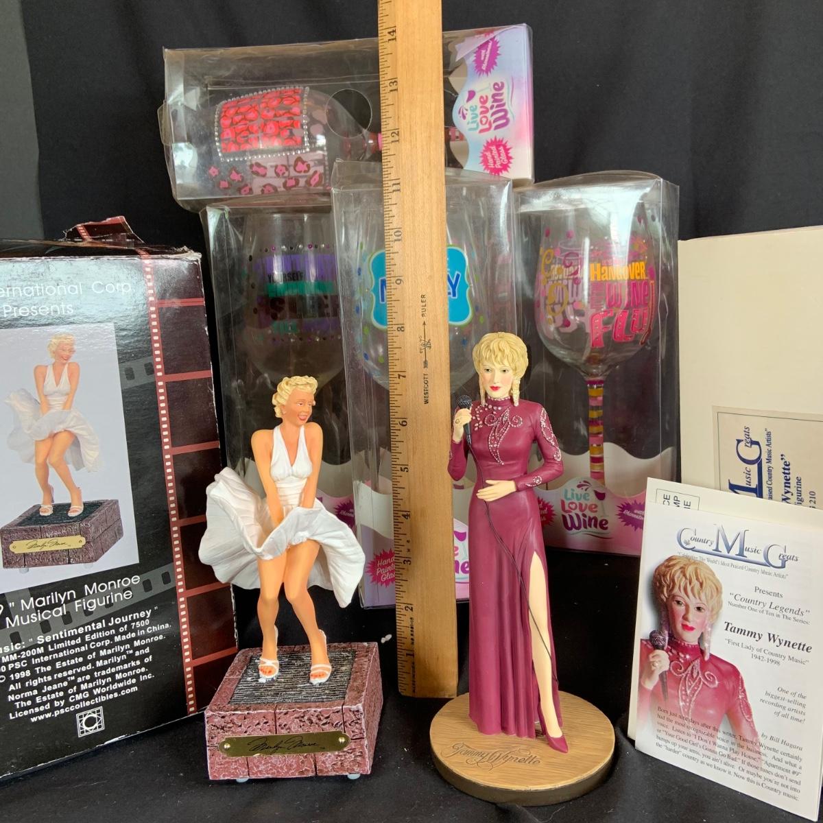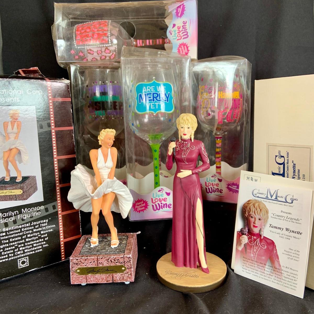 LOT:121: Cheers to Marilyn and Tammy- Rare Marilyn Monroe Music Box, a Tammy Wynette Numbered Statue and Whimsical Wine Glasses- All In Original Boxes