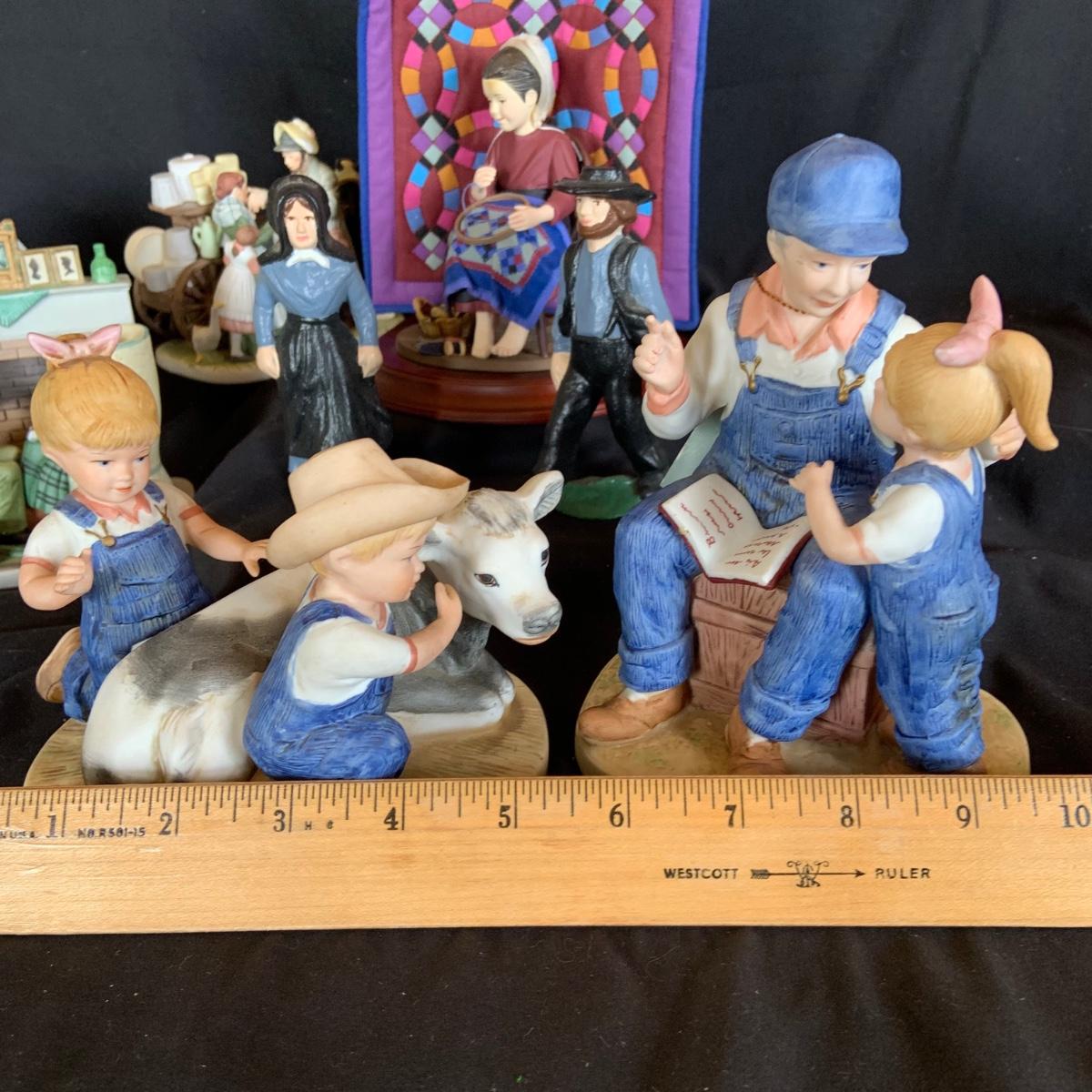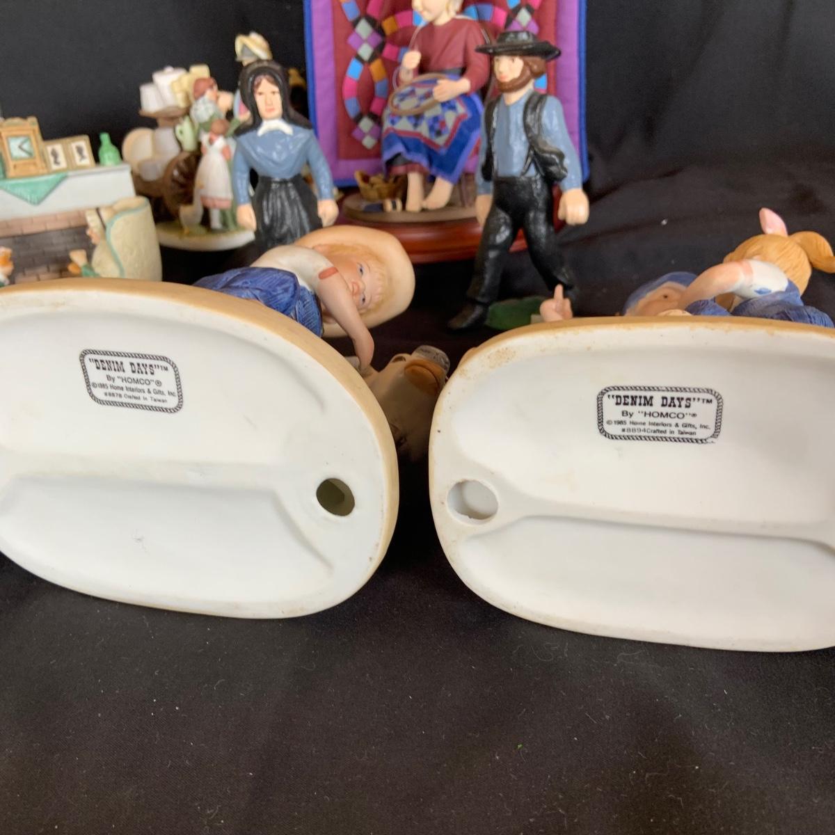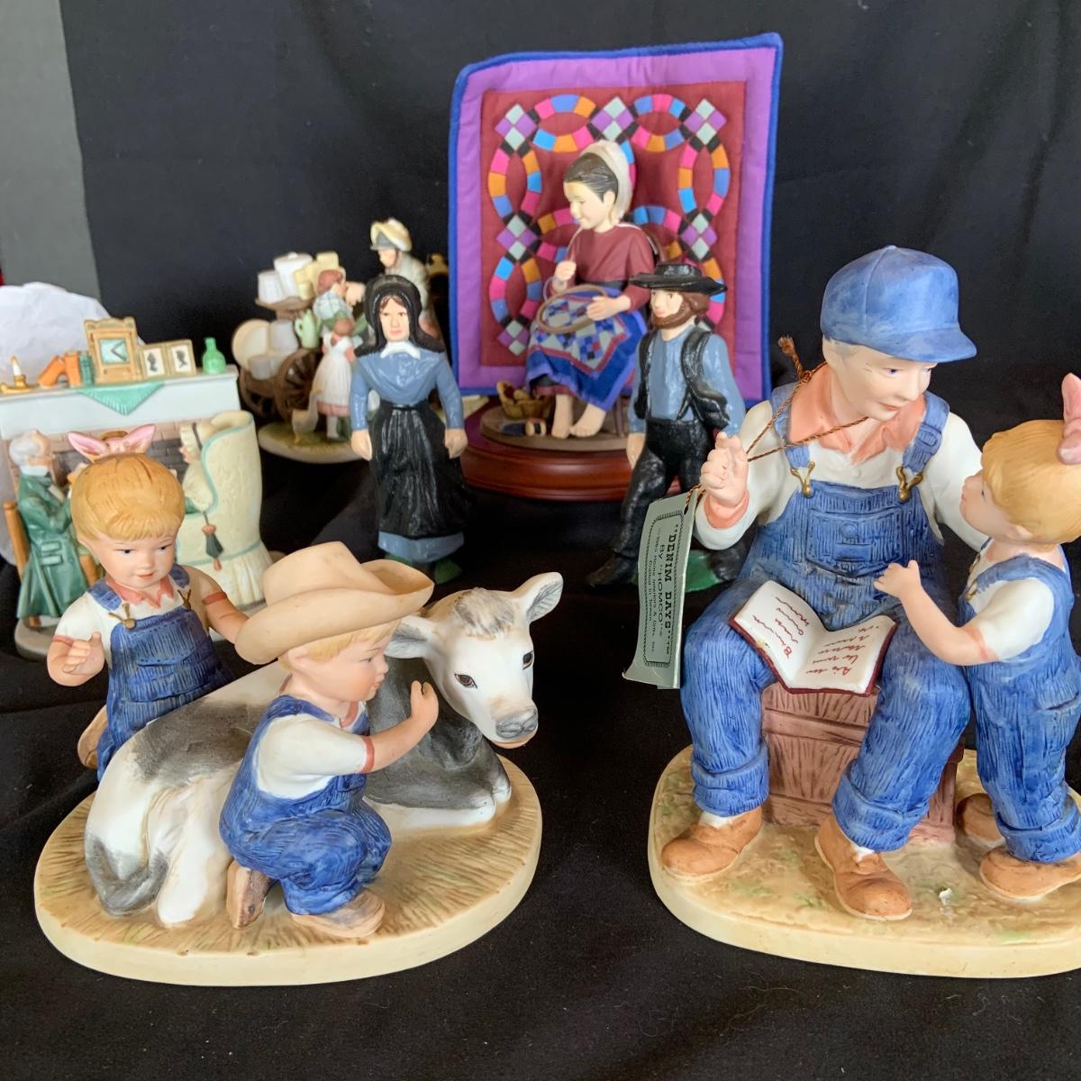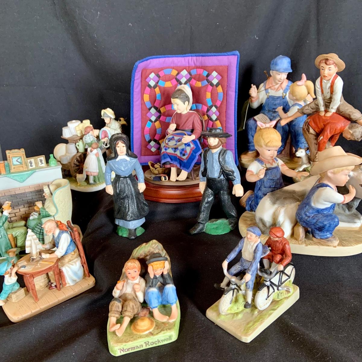 LOT:122: Country Living Collection Including Cast Iron Amish Couple, Amish Girl Quilting Figurine, Norman Rockwell Figurines, Homco Denim Day Figurines and More