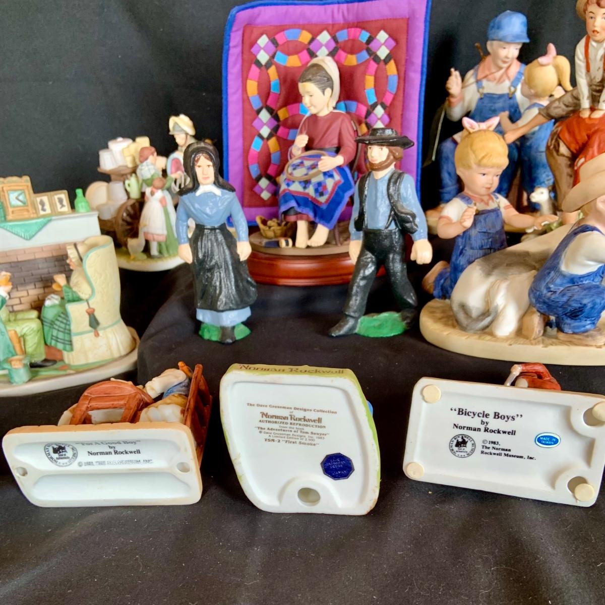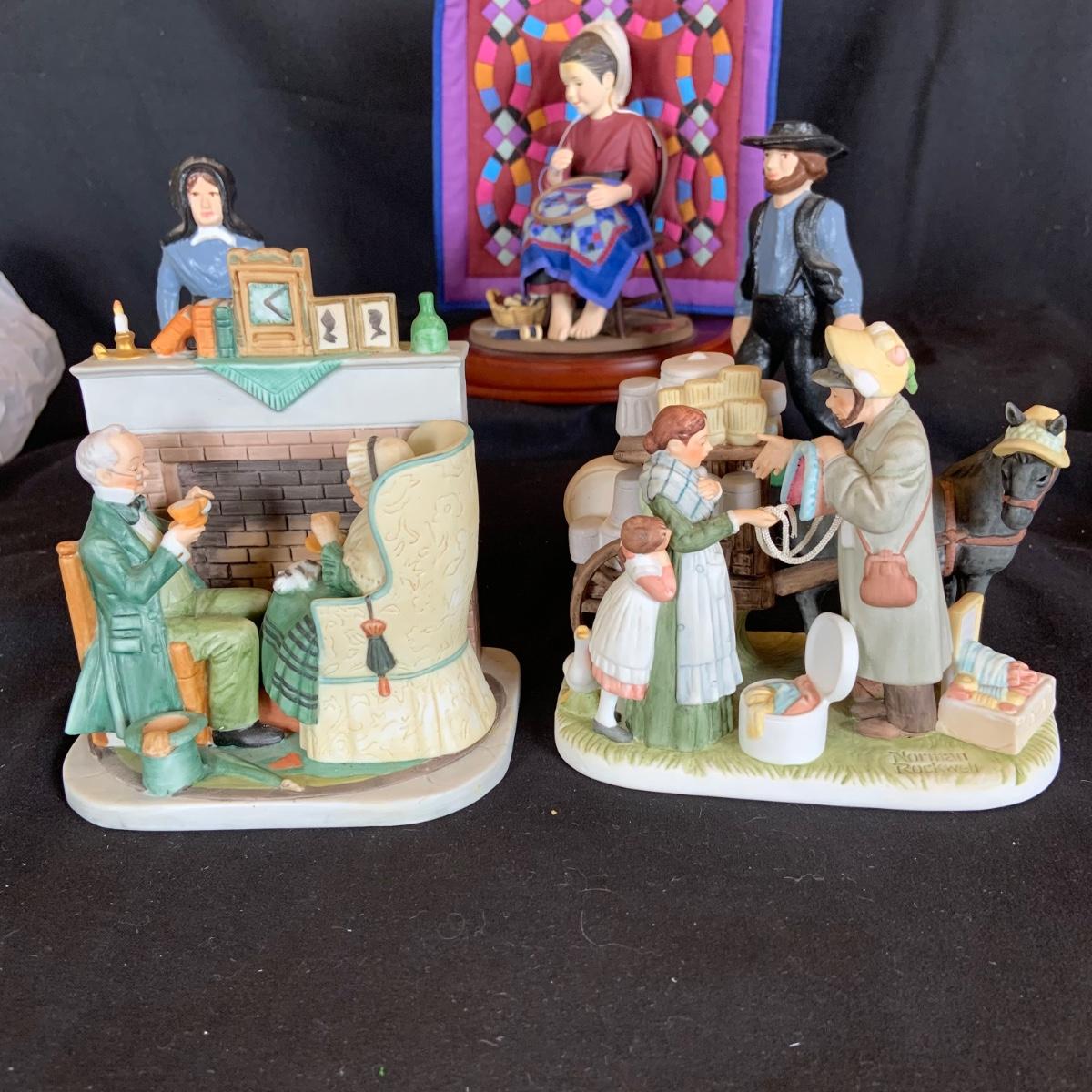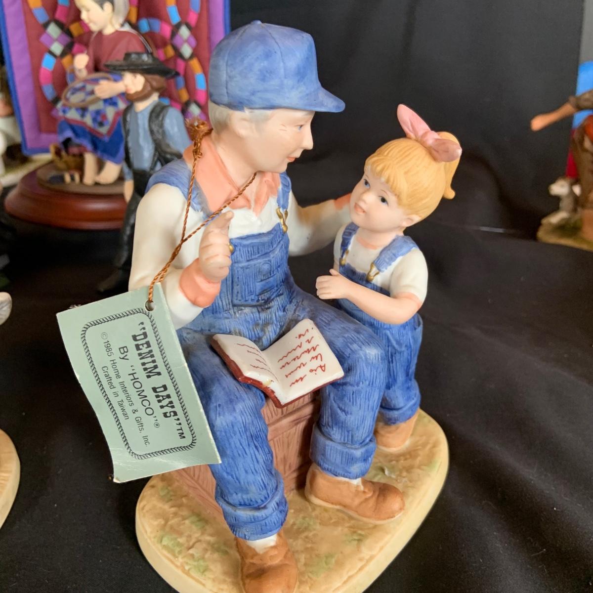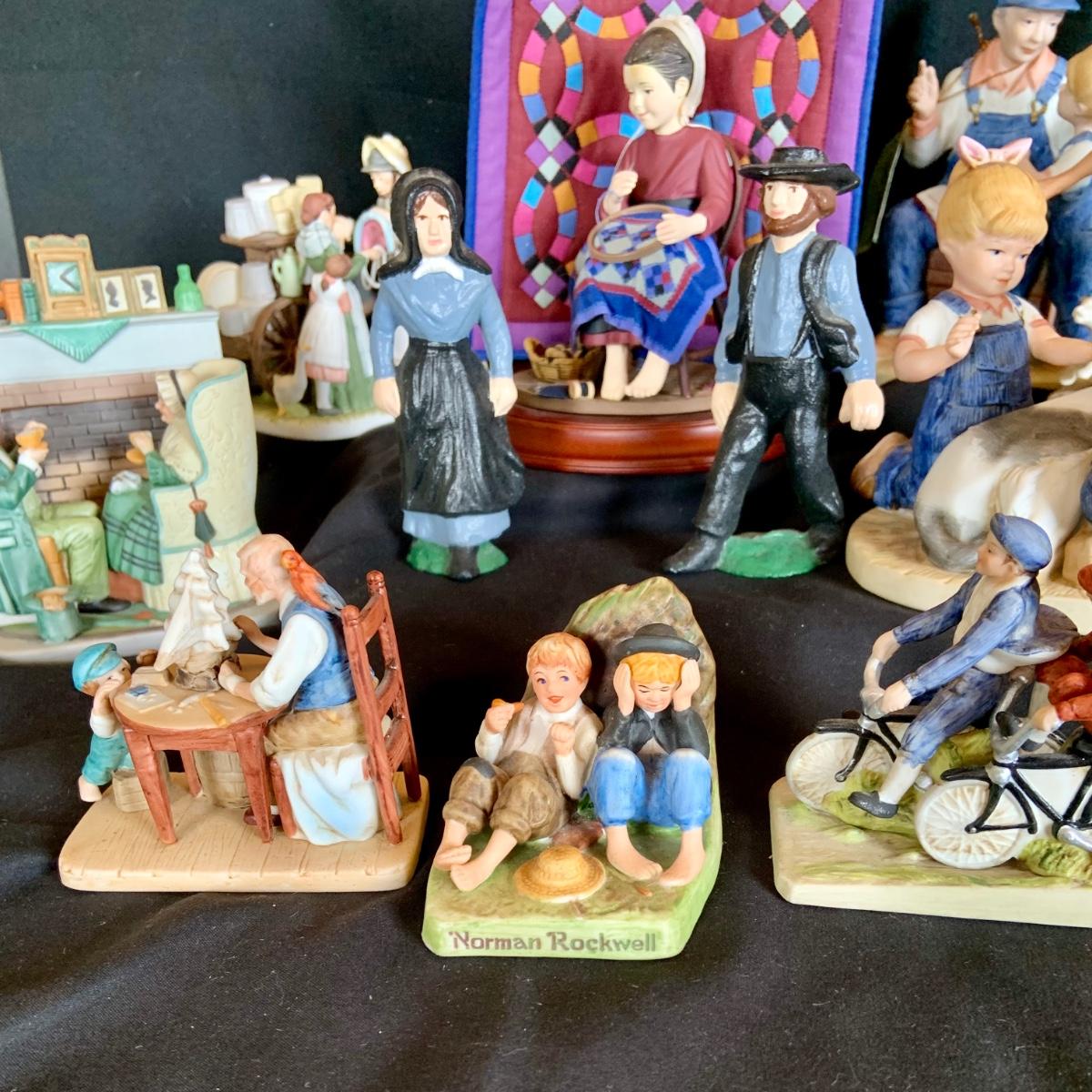 LOT:122: Country Living Collection Including Cast Iron Amish Couple, Amish Girl Quilting Figurine, Norman Rockwell Figurines, Homco Denim Day Figurines and More