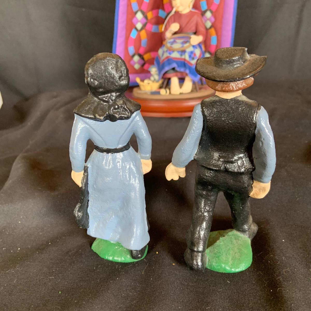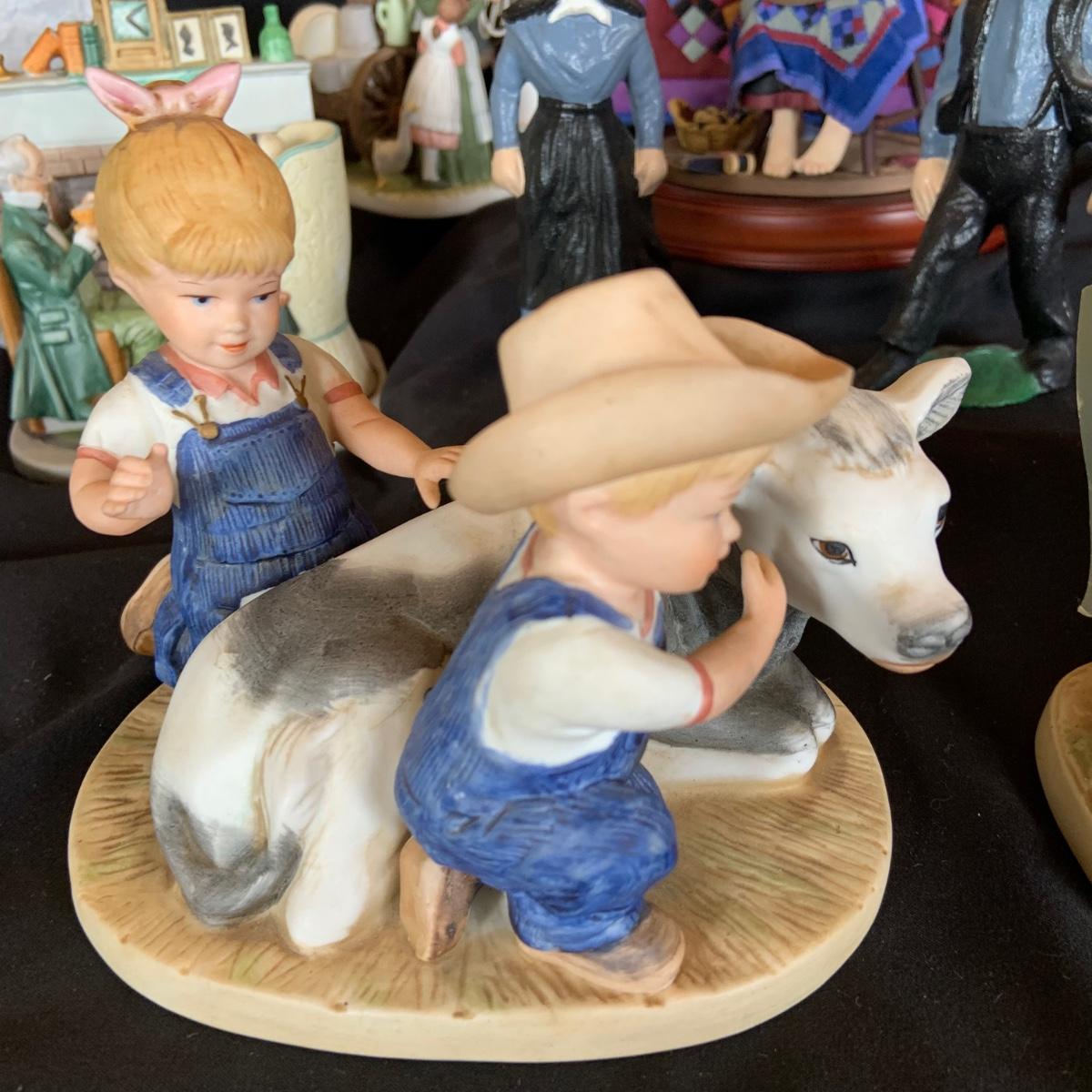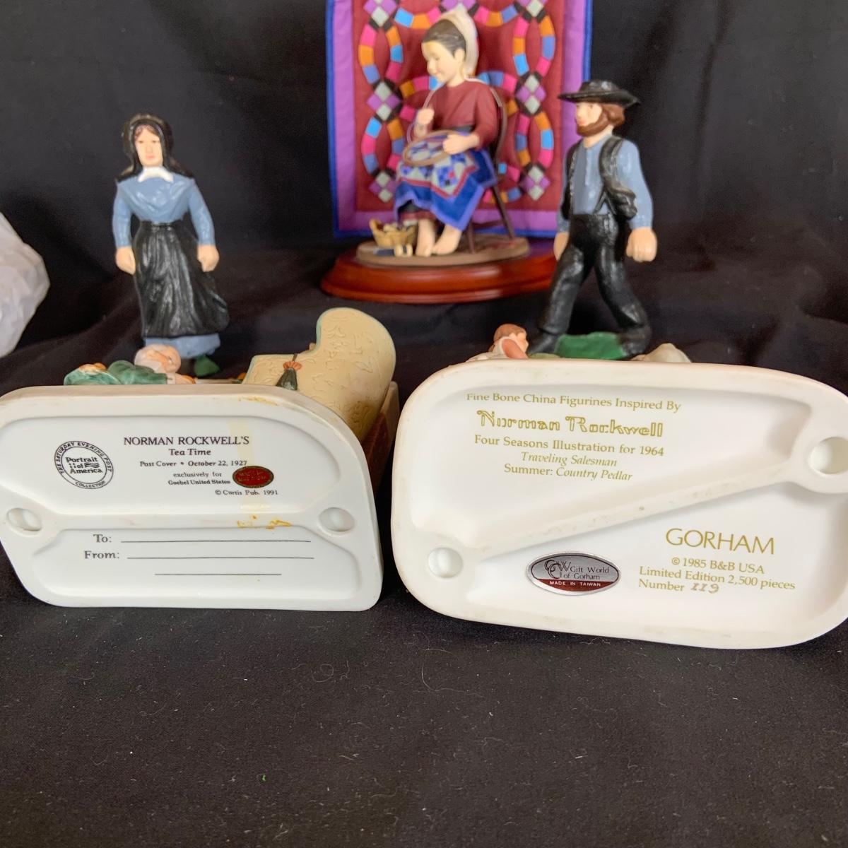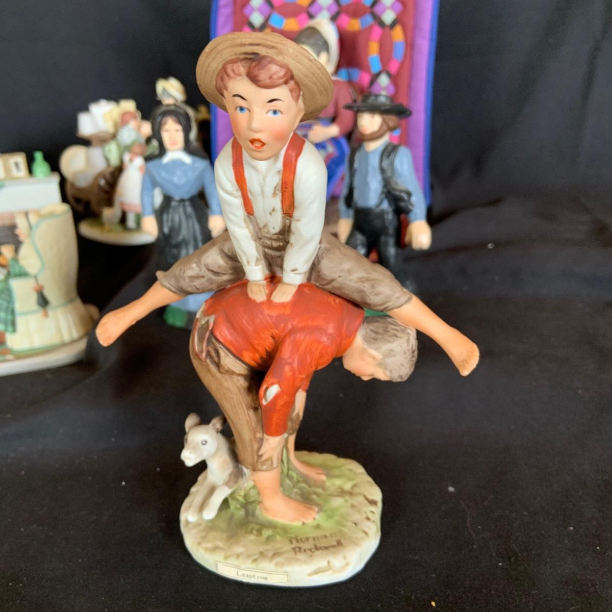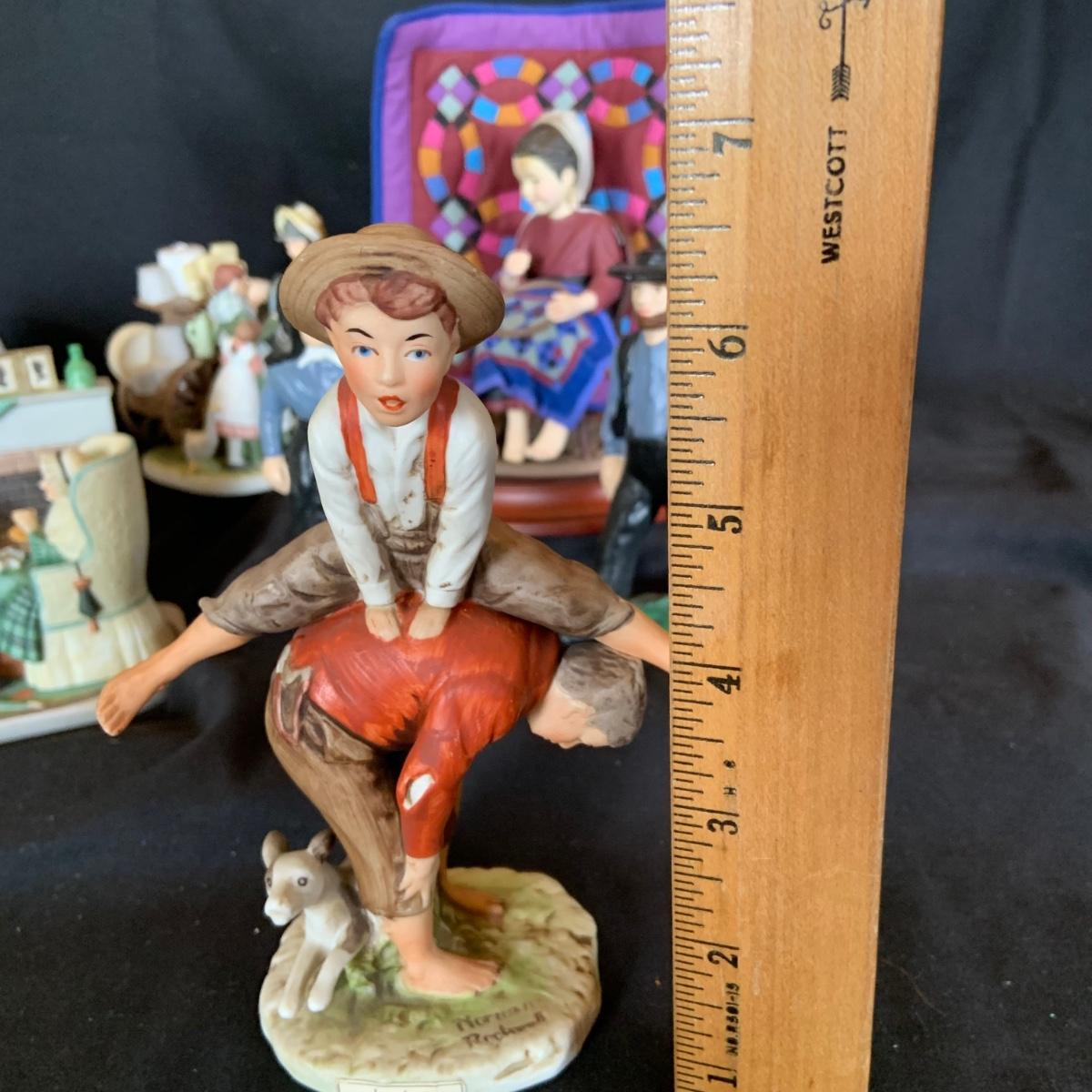 LOT:122: Country Living Collection Including Cast Iron Amish Couple, Amish Girl Quilting Figurine, Norman Rockwell Figurines, Homco Denim Day Figurines and More
