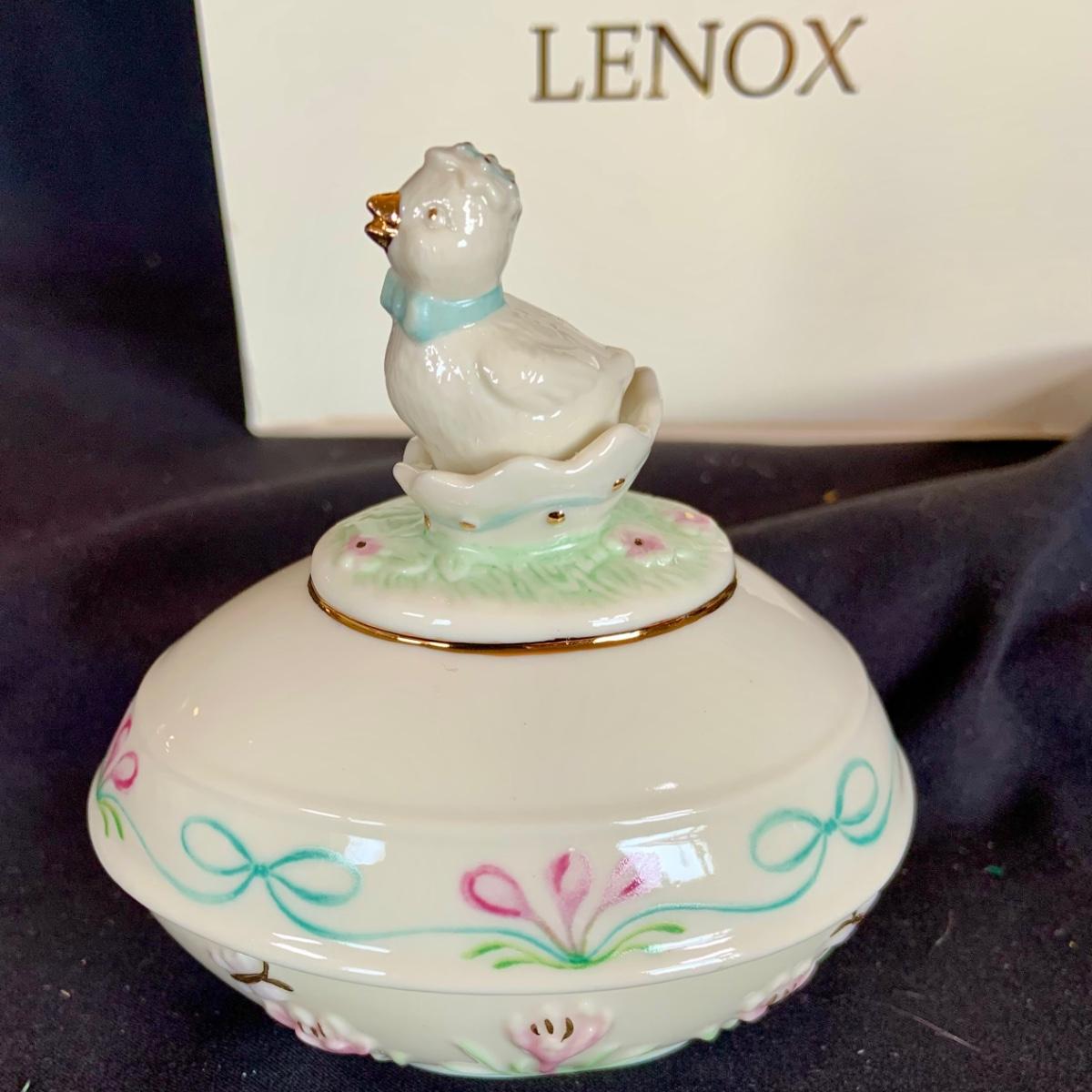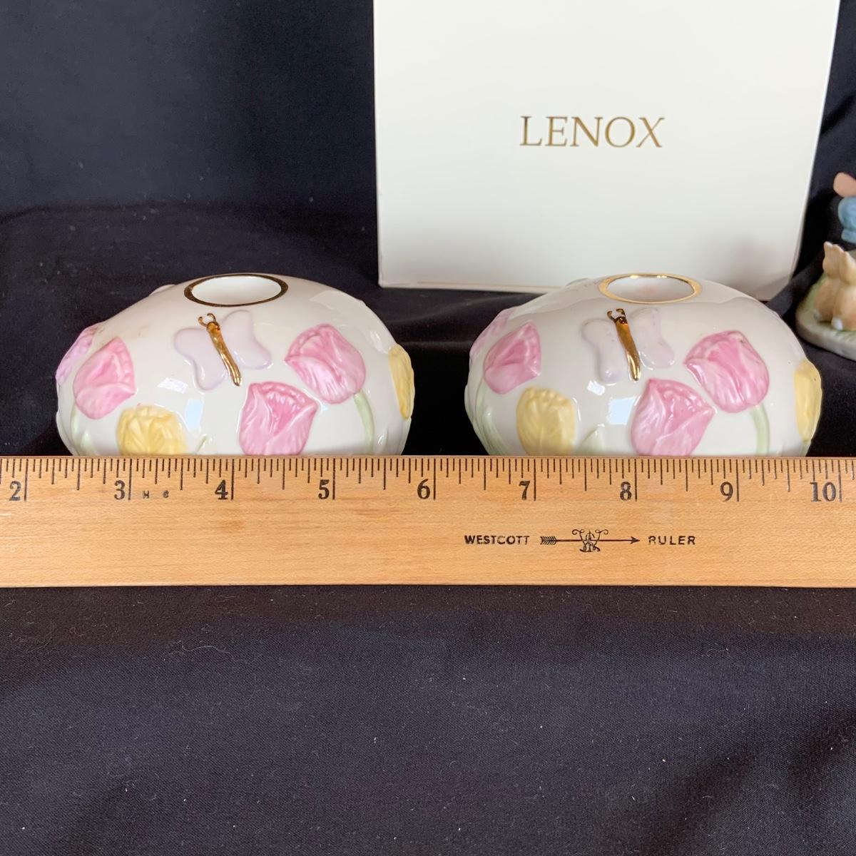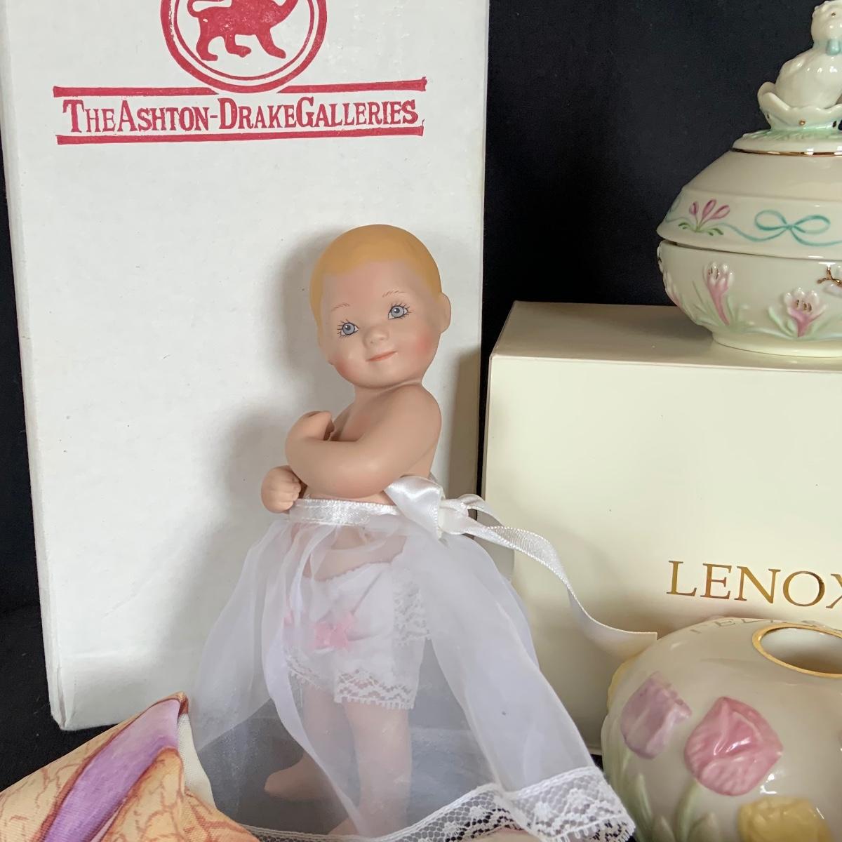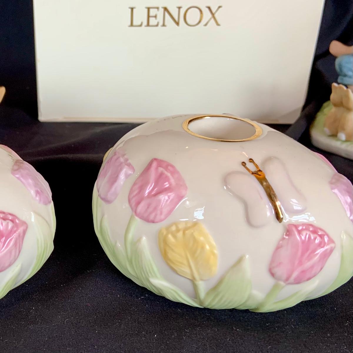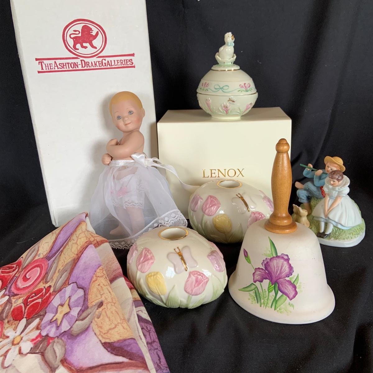 LOT:124: Think Spring - Lenox Spring Egg Shaped Candle Holders, Lenox Egg Shaped Trinket Box with Chick In Original Box, Ashton Drake June Bride Doll, Flag, Bell and More