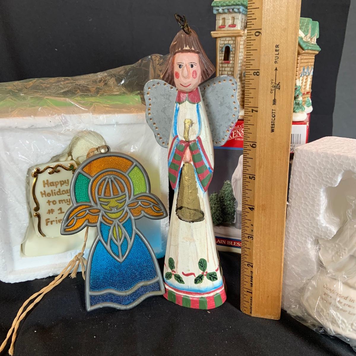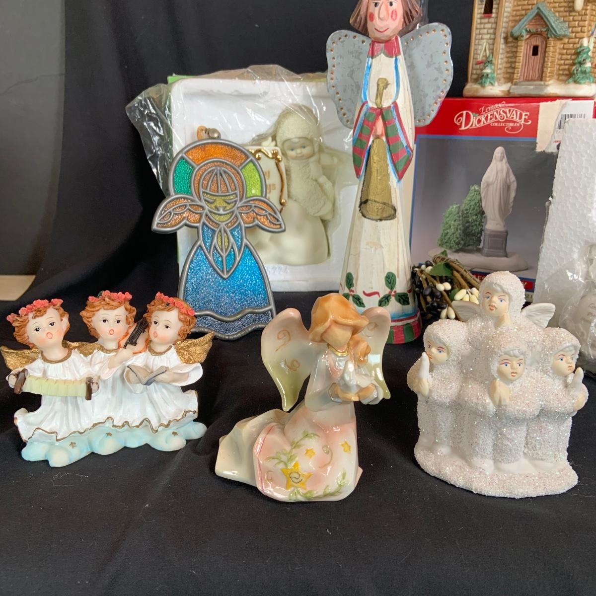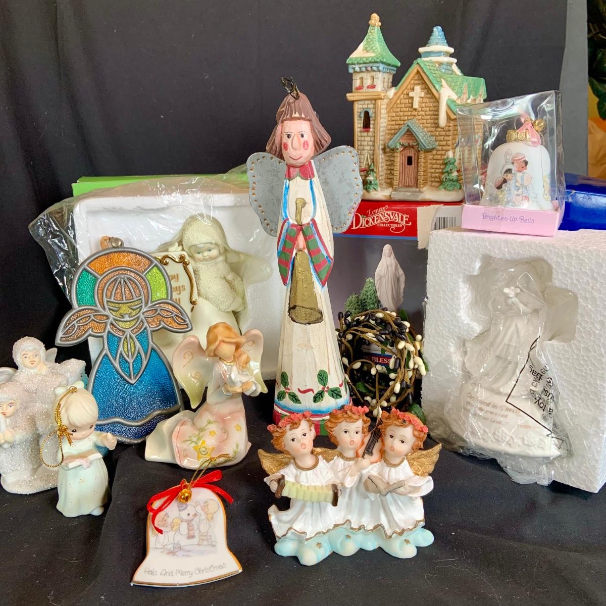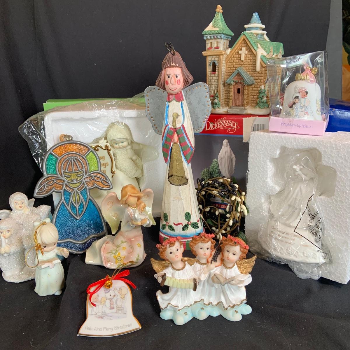 LOT:126: Angels Among Us Collection of Precious Moments Ornaments, Snowbaby, Dickensville Madonna, and Village Church