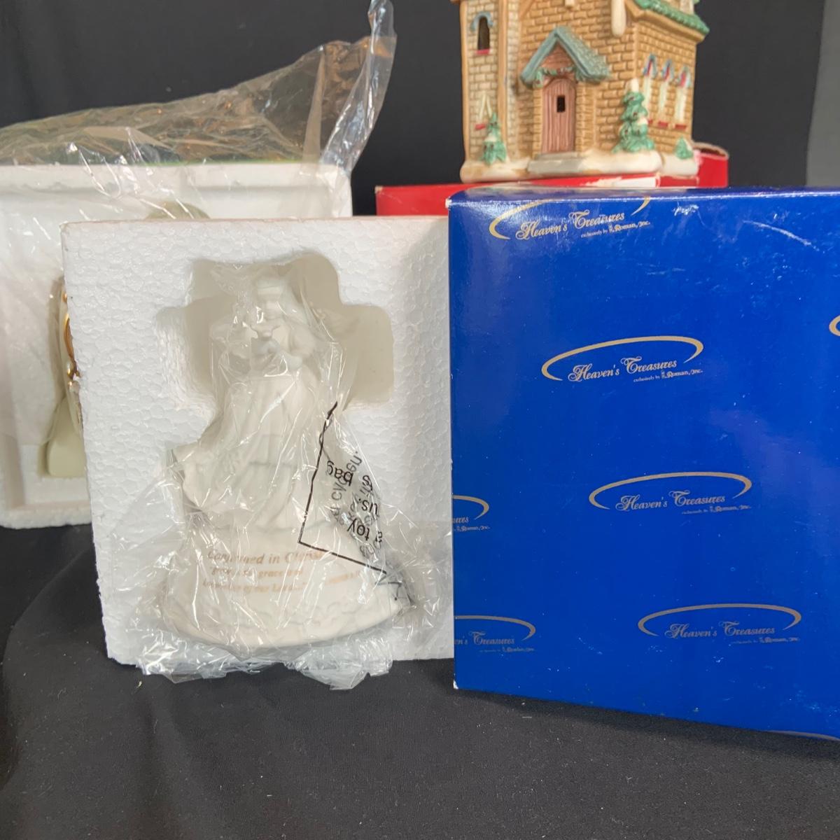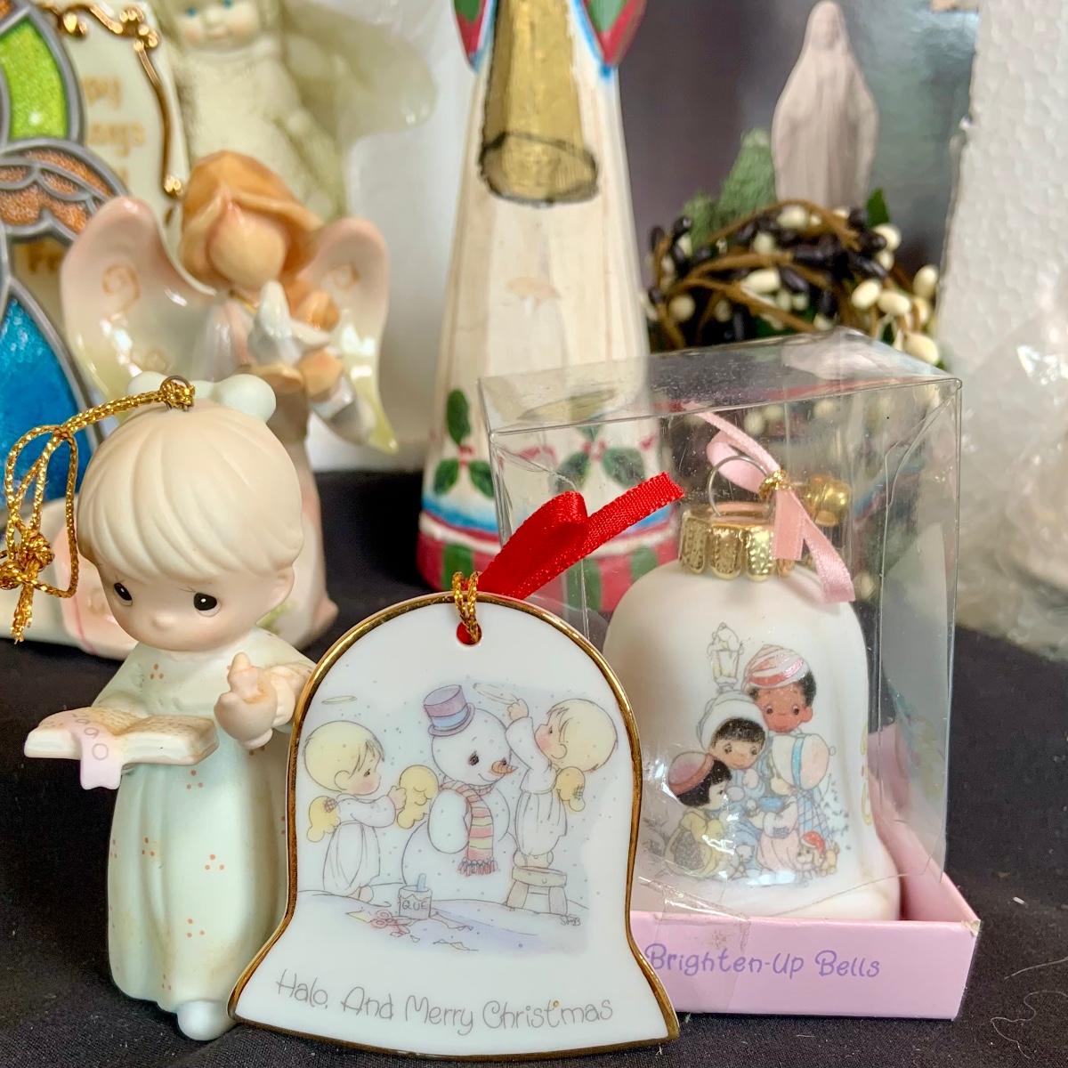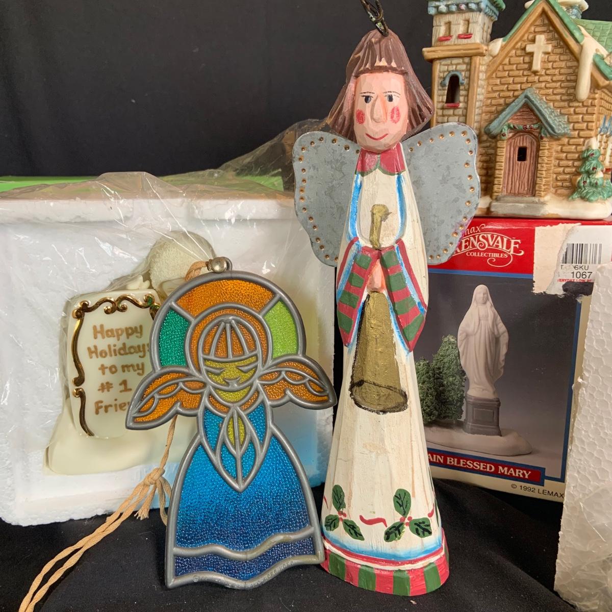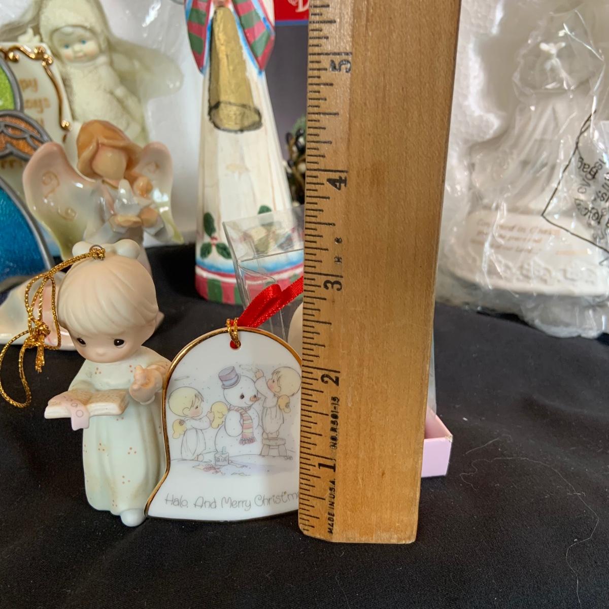 LOT:126: Angels Among Us Collection of Precious Moments Ornaments, Snowbaby, Dickensville Madonna, and Village Church