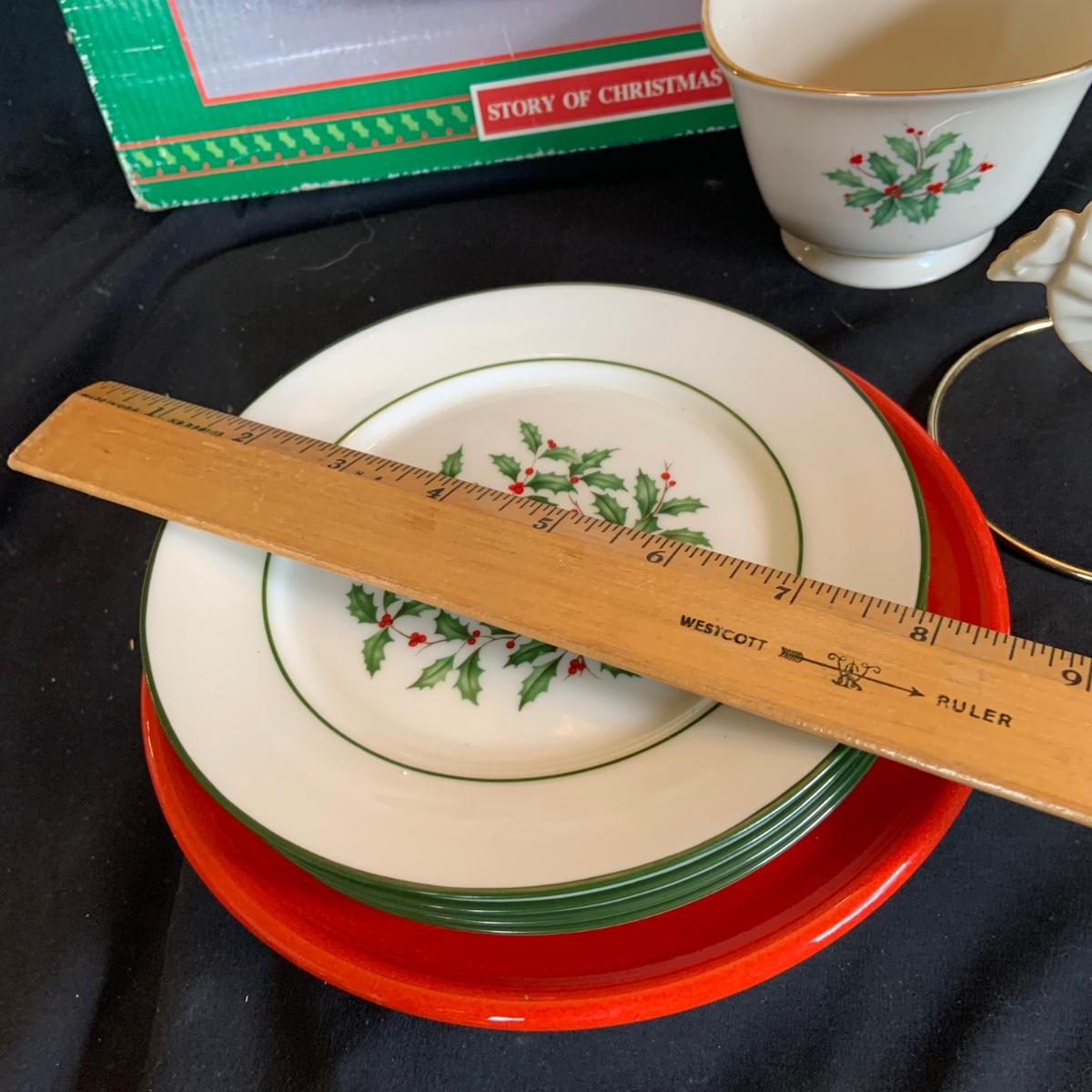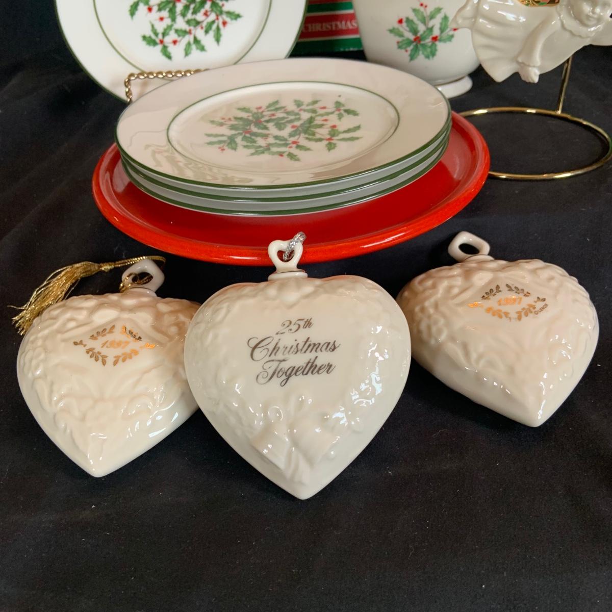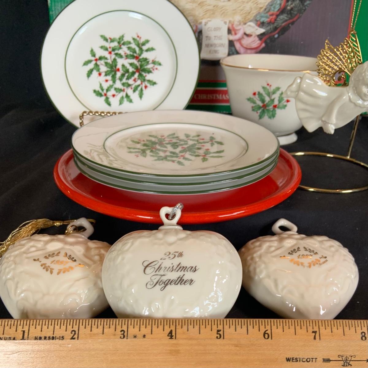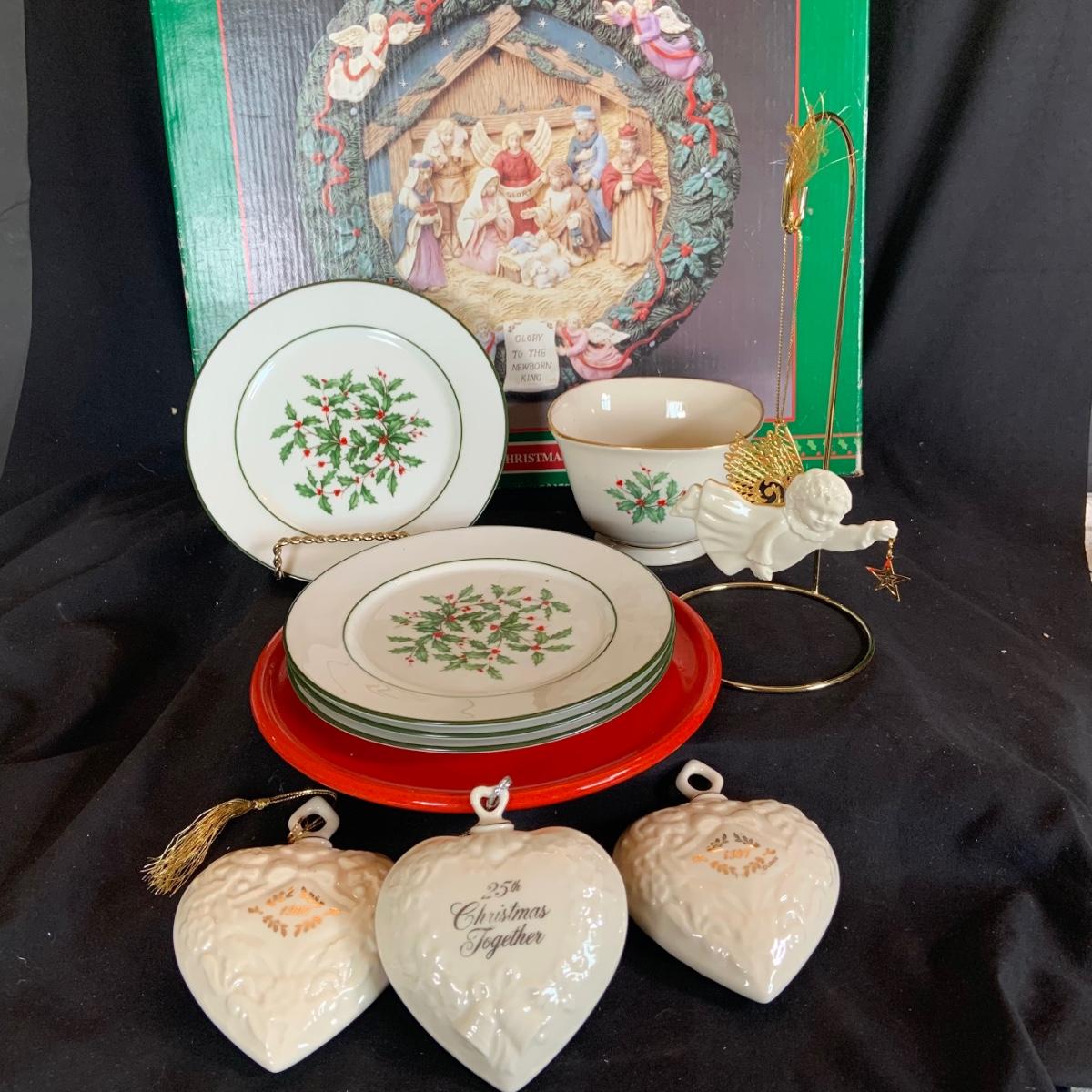 LOT:140: Lenox Holly and Berry Pattern Plates and Bowl, Lenox Angel and Heart Ornaments and a Story of Christmas Wreath In Box