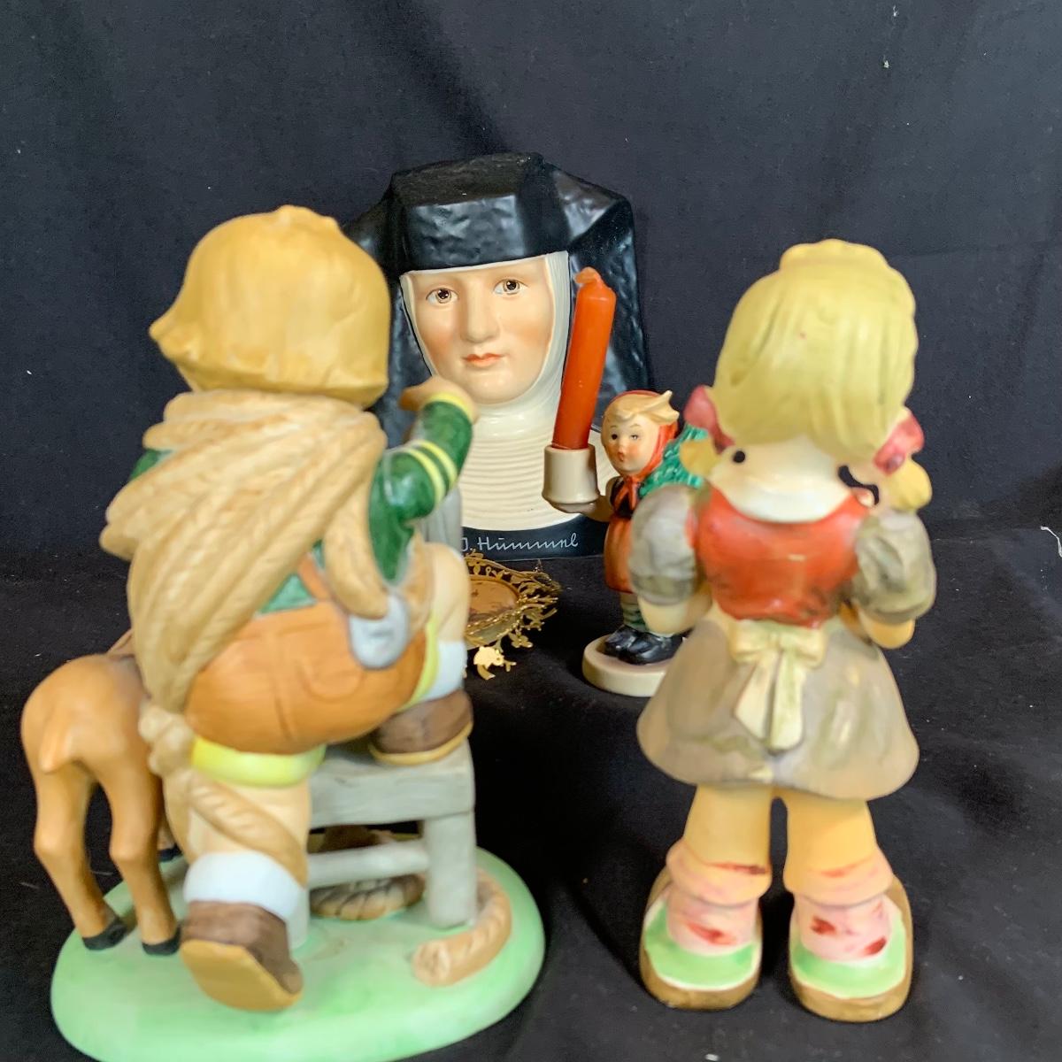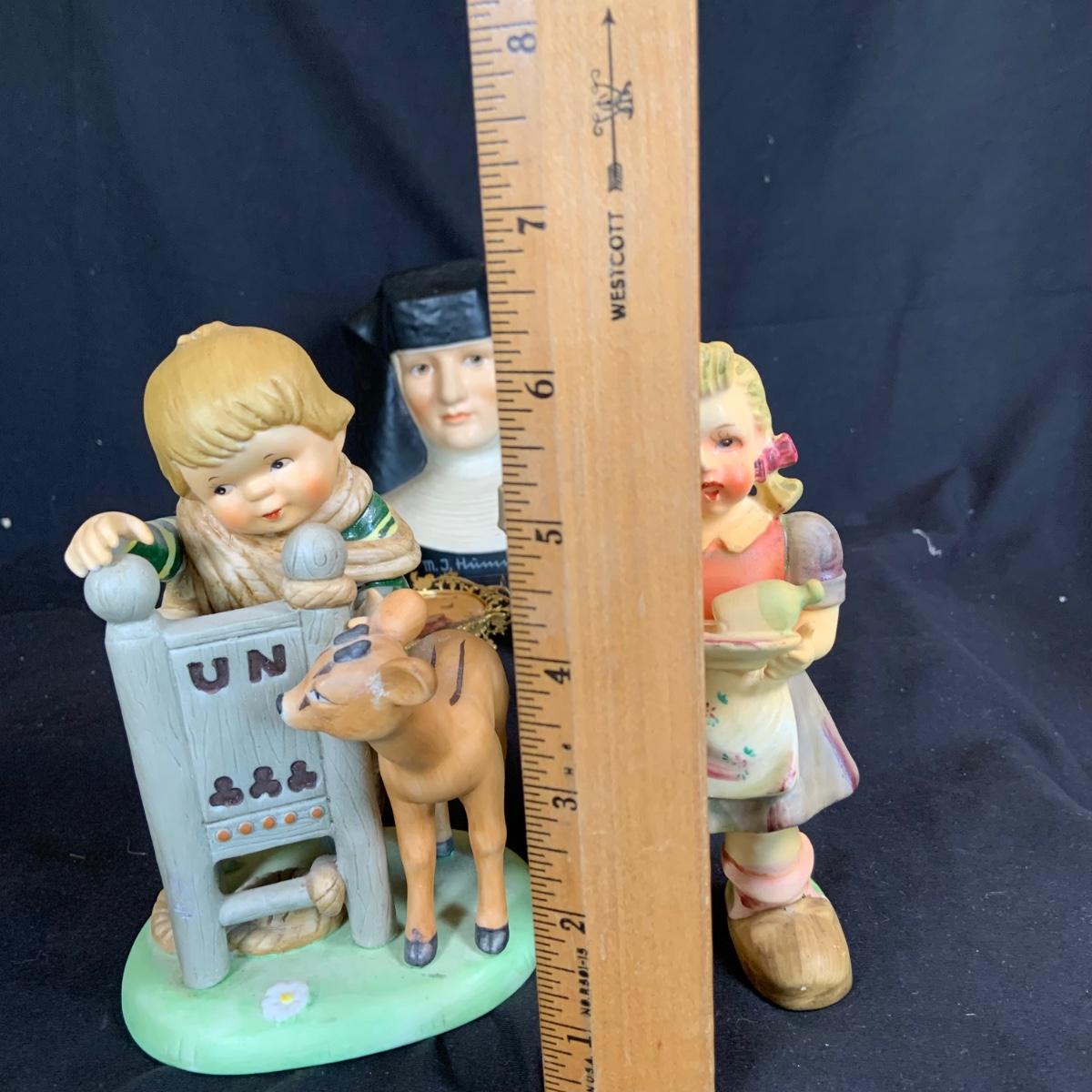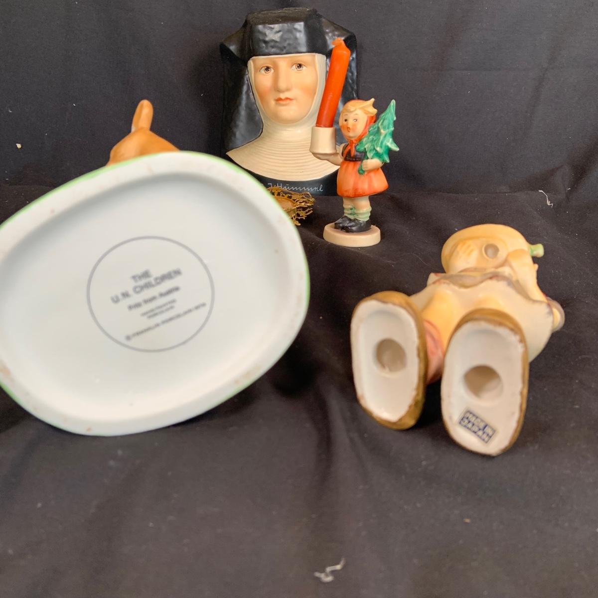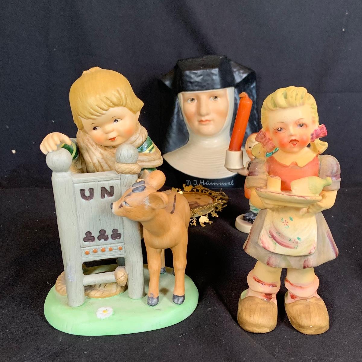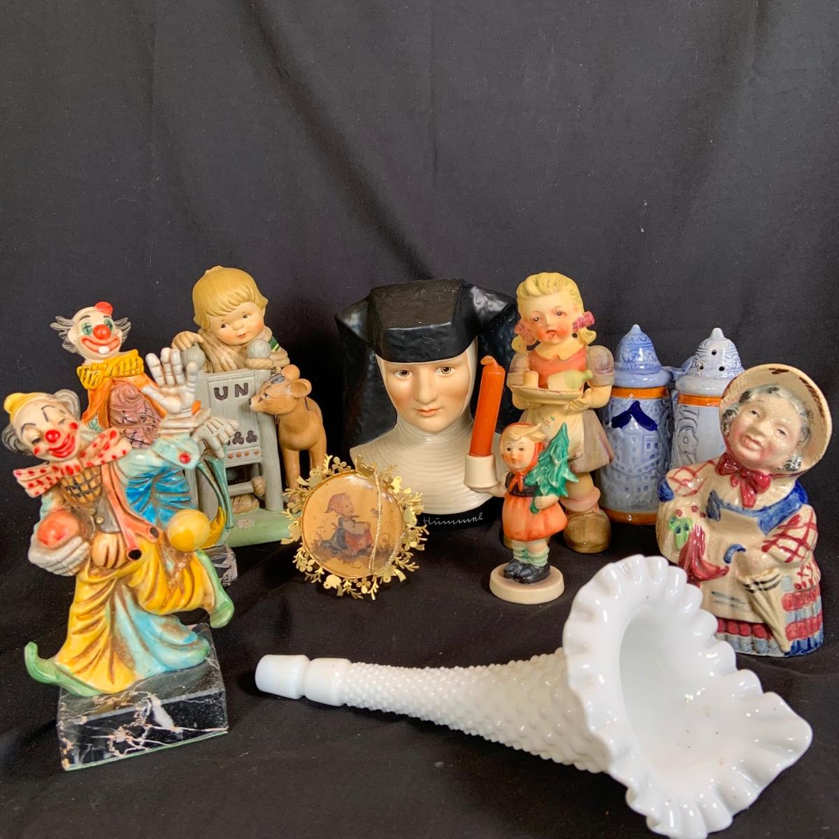 LOT:143: Hummels and More -Featuring Girl with Fir Tree Candle Holder and Berta Hummel Figures, Pair of Clowns with Marble Base, Hobnail Milk Glass Epergne Lily, Franklin UN Children and More