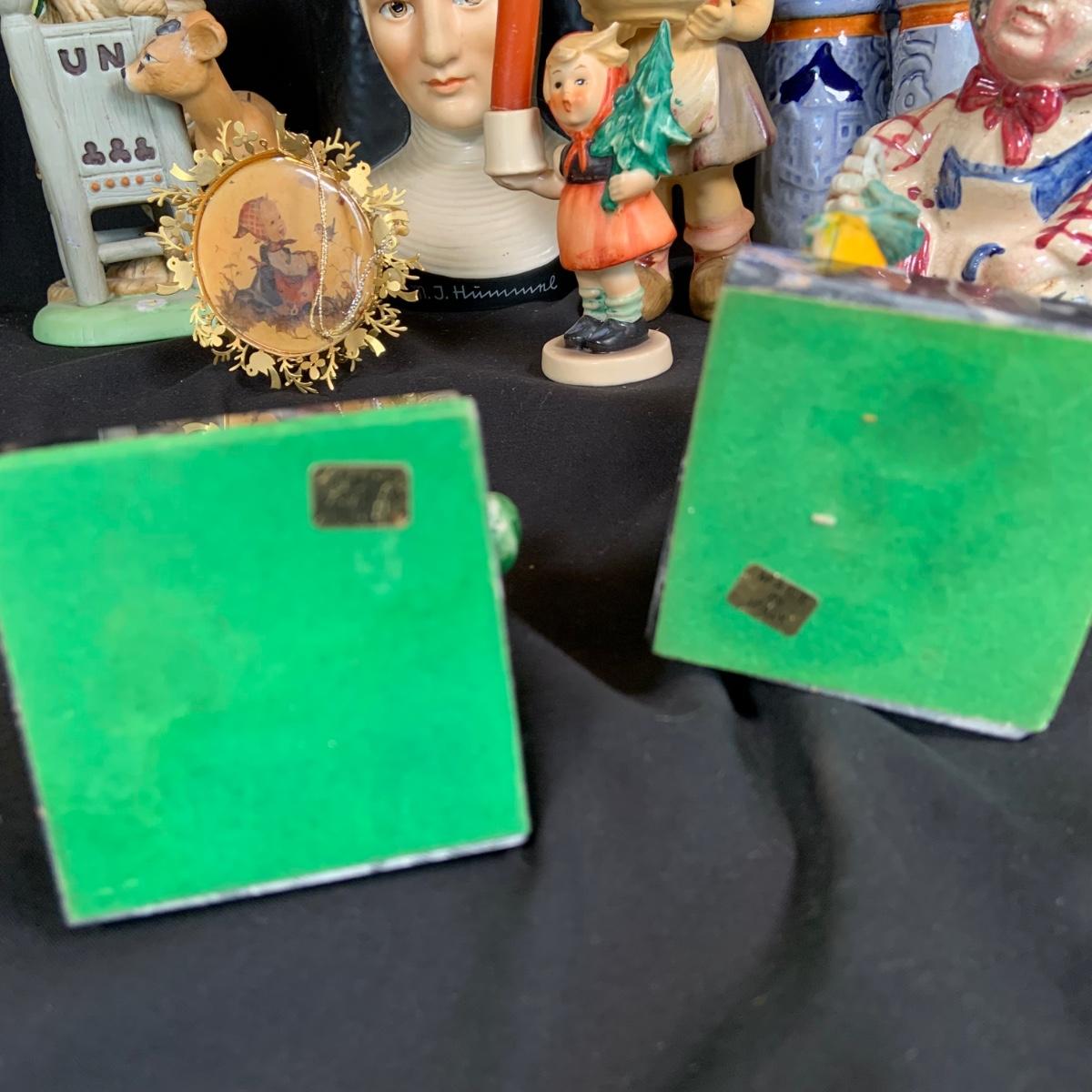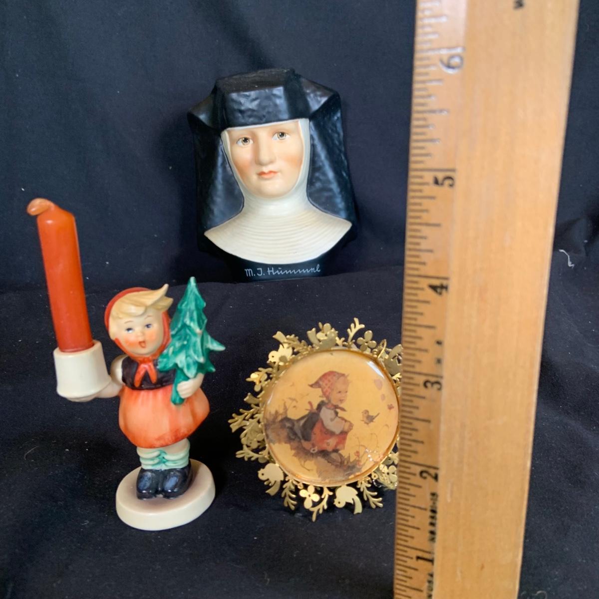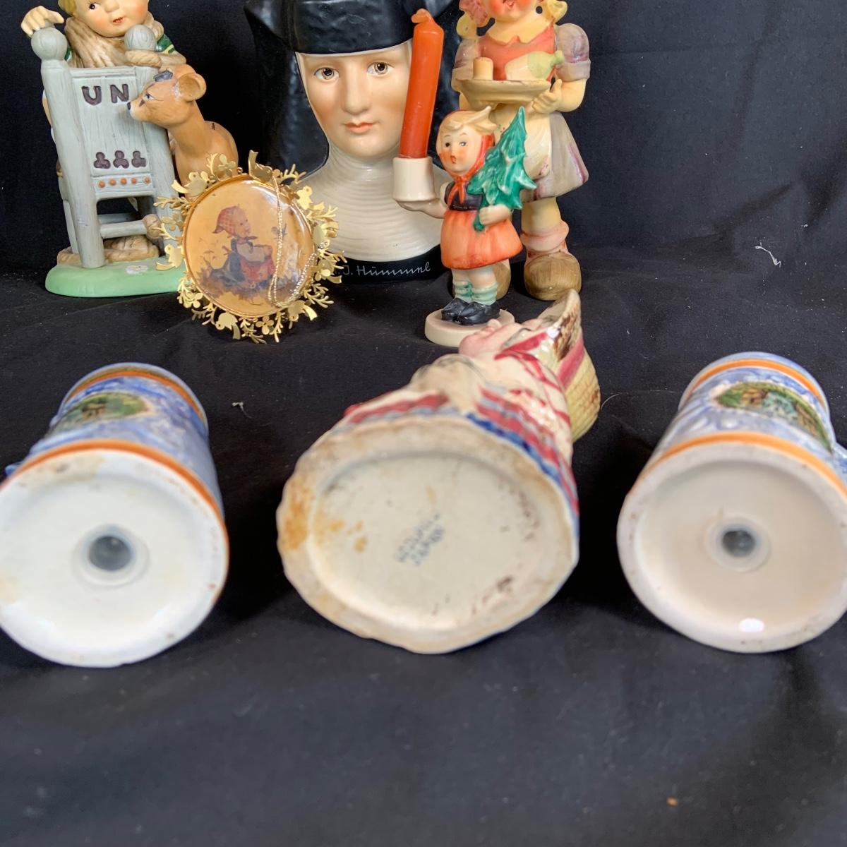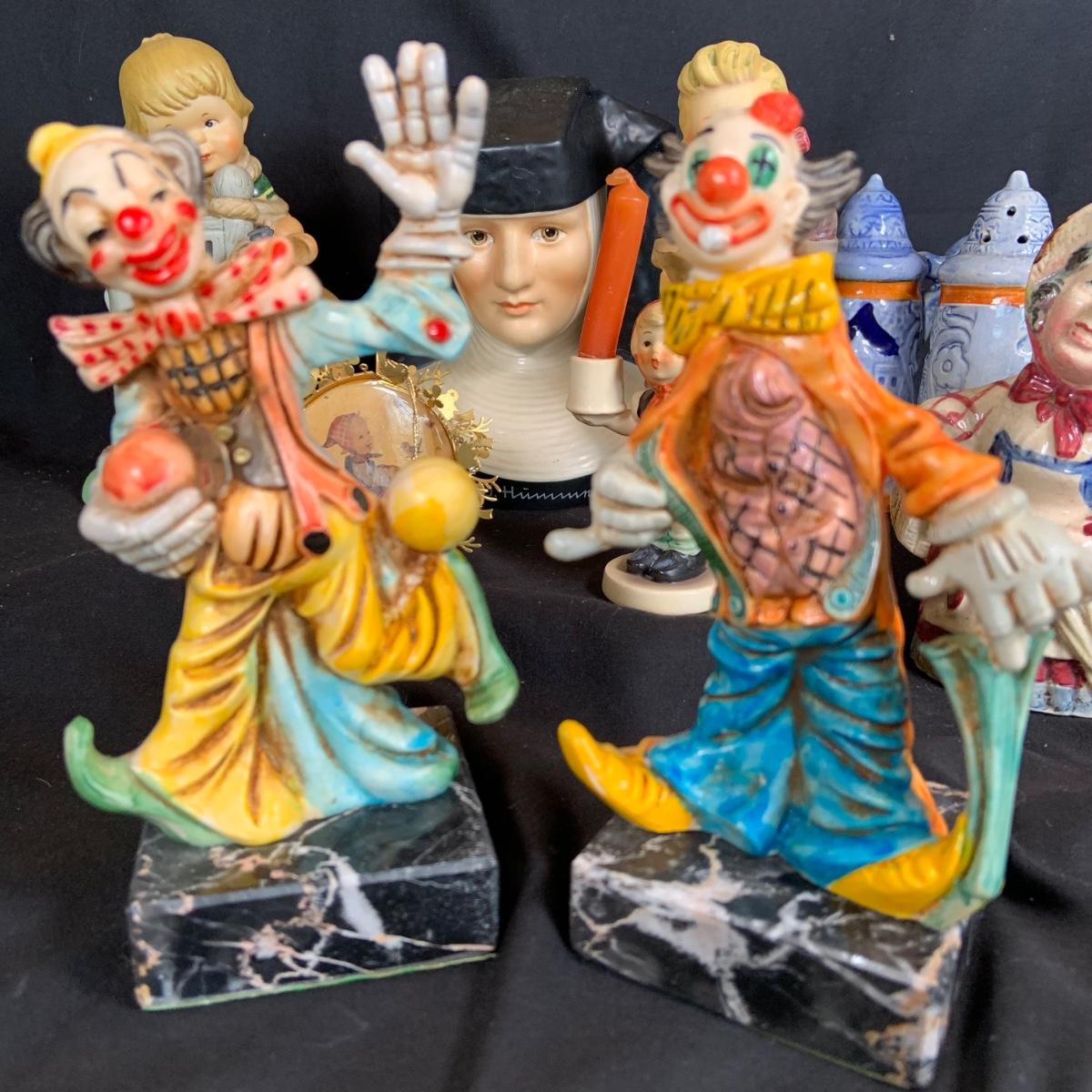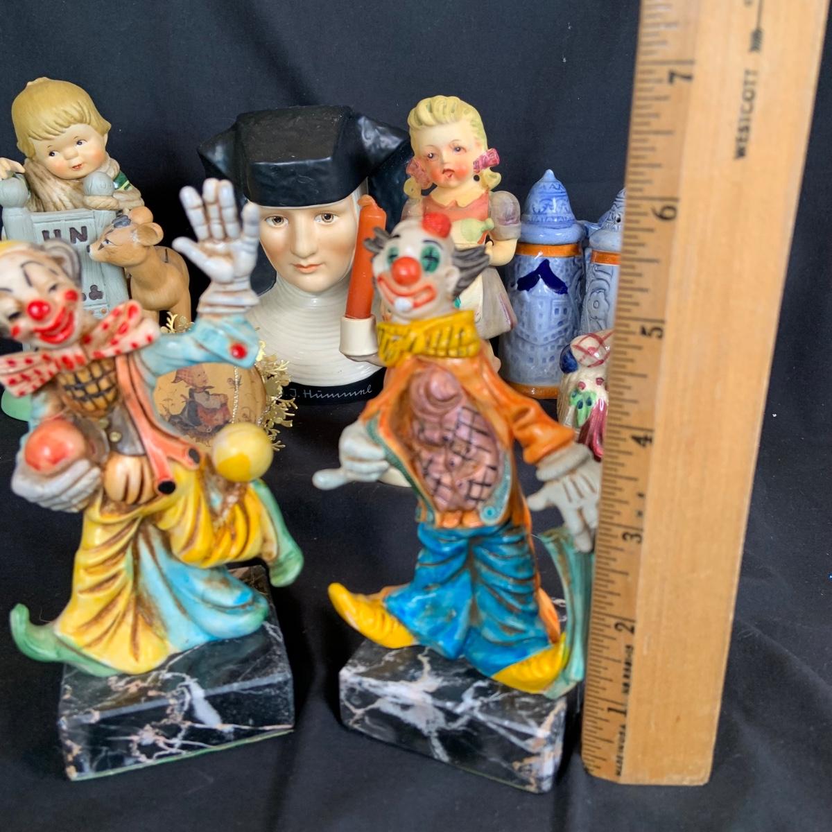 LOT:143: Hummels and More -Featuring Girl with Fir Tree Candle Holder and Berta Hummel Figures, Pair of Clowns with Marble Base, Hobnail Milk Glass Epergne Lily, Franklin UN Children and More