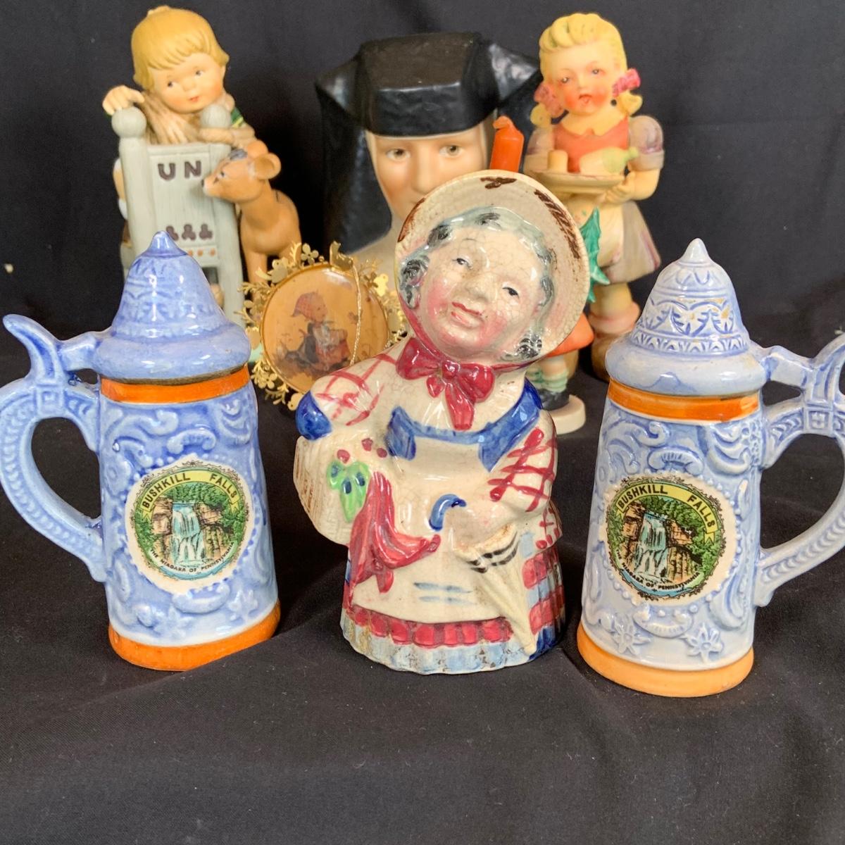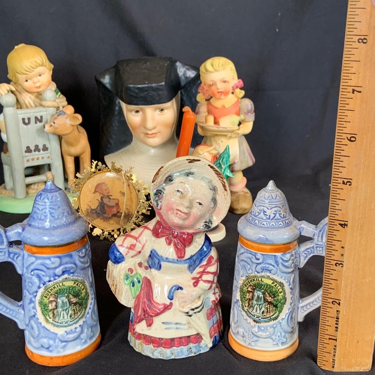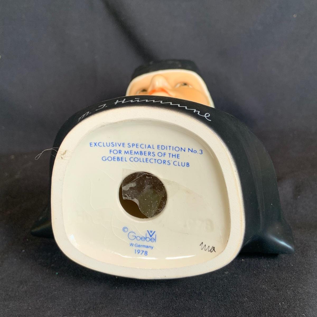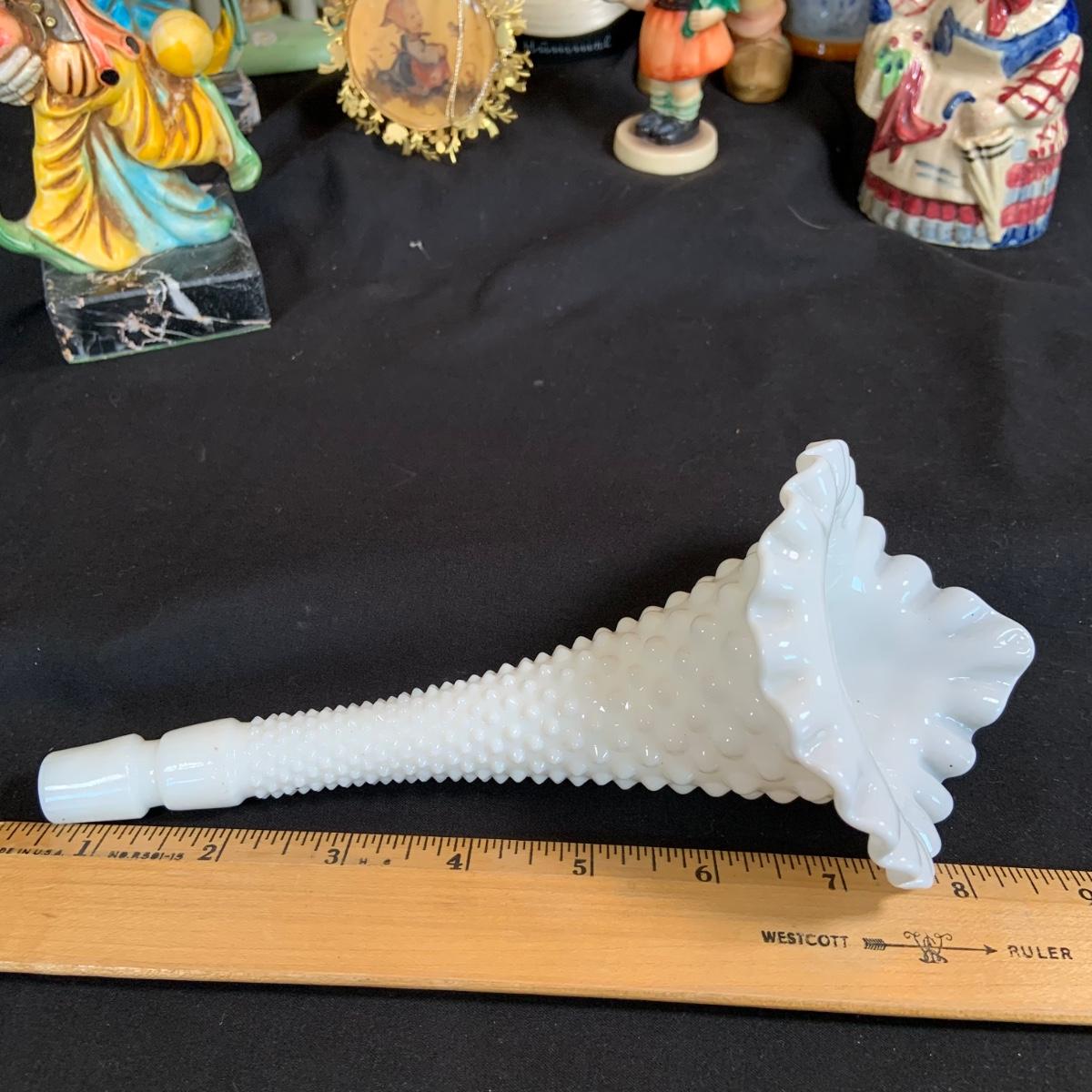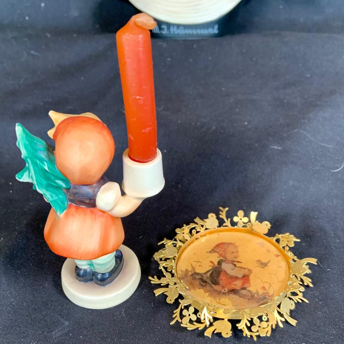 LOT:143: Hummels and More -Featuring Girl with Fir Tree Candle Holder and Berta Hummel Figures, Pair of Clowns with Marble Base, Hobnail Milk Glass Epergne Lily, Franklin UN Children and More