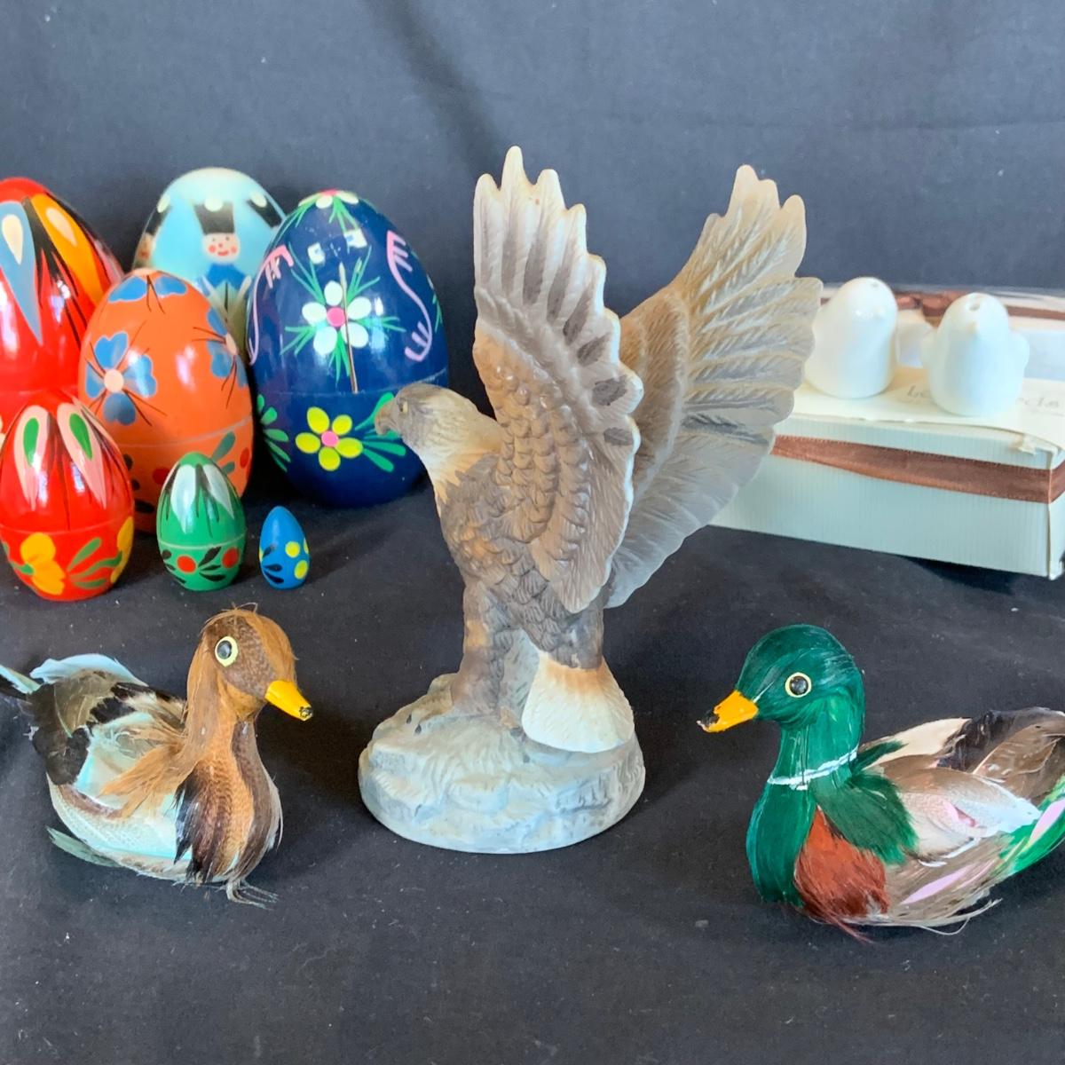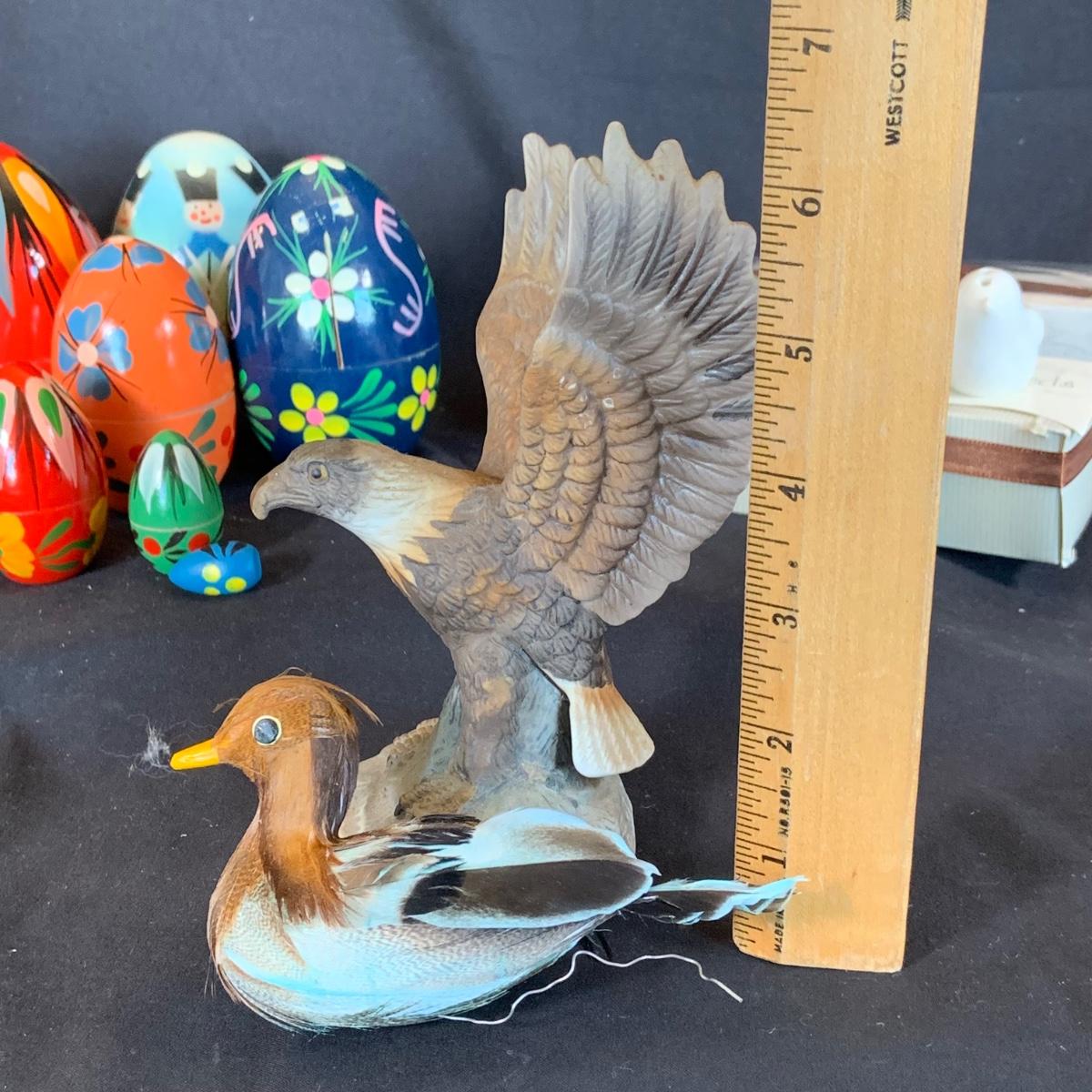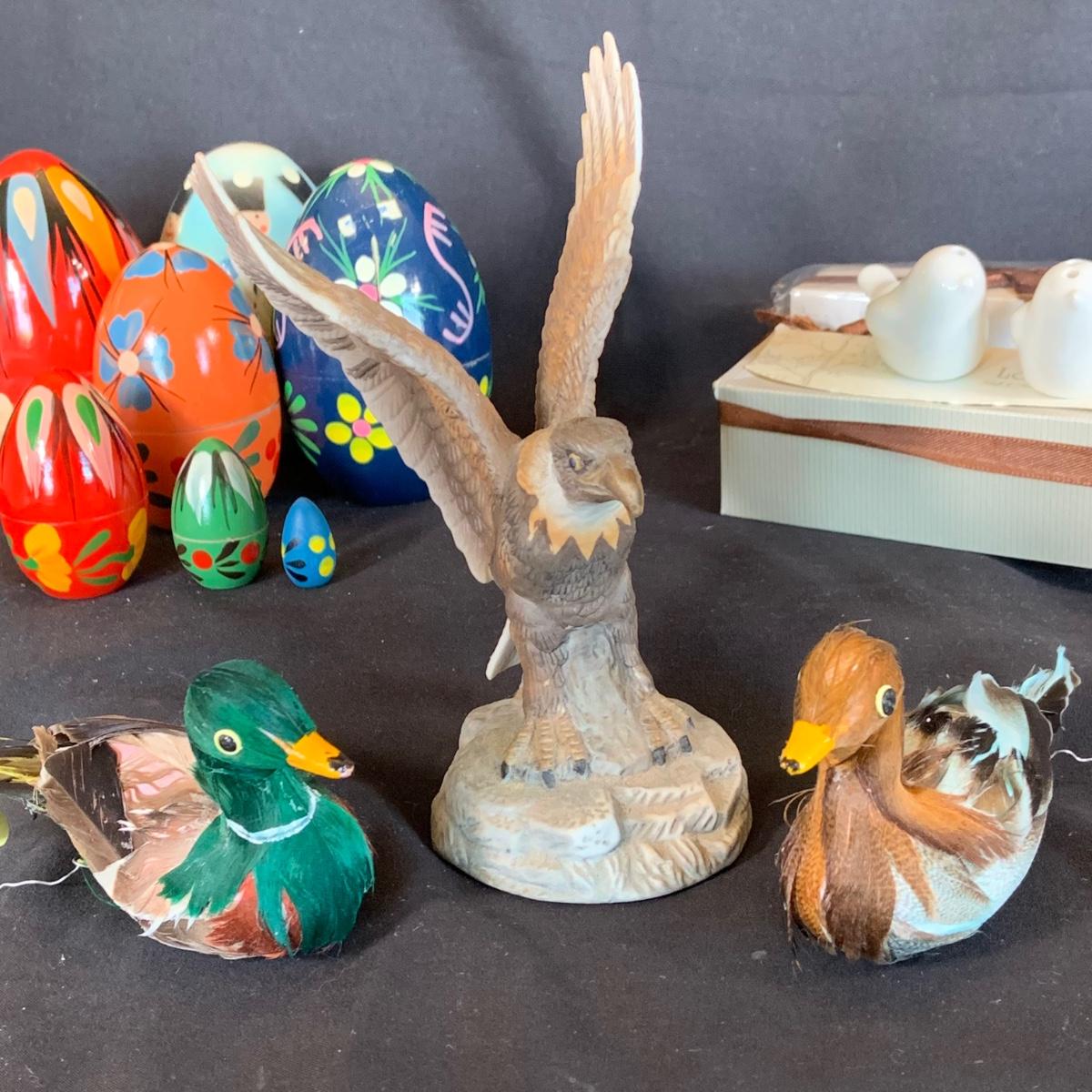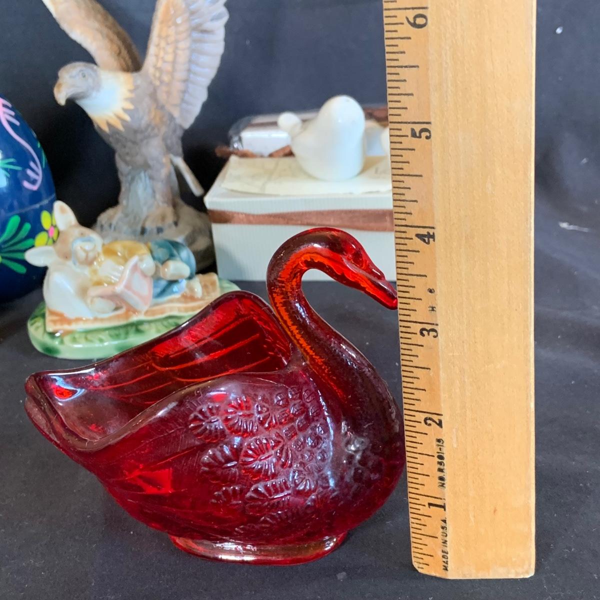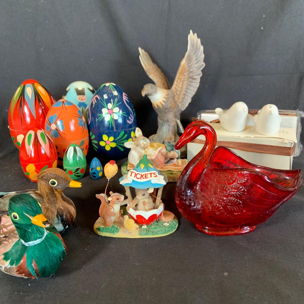 LOT:144: Birds and Mice- Featuring Fenton Red Glass Swan, Charming Tale Figurine, Feathered Ducks 3 Set of Nesting Eggs One with Soldiers, Royal Heritage Eagle and More