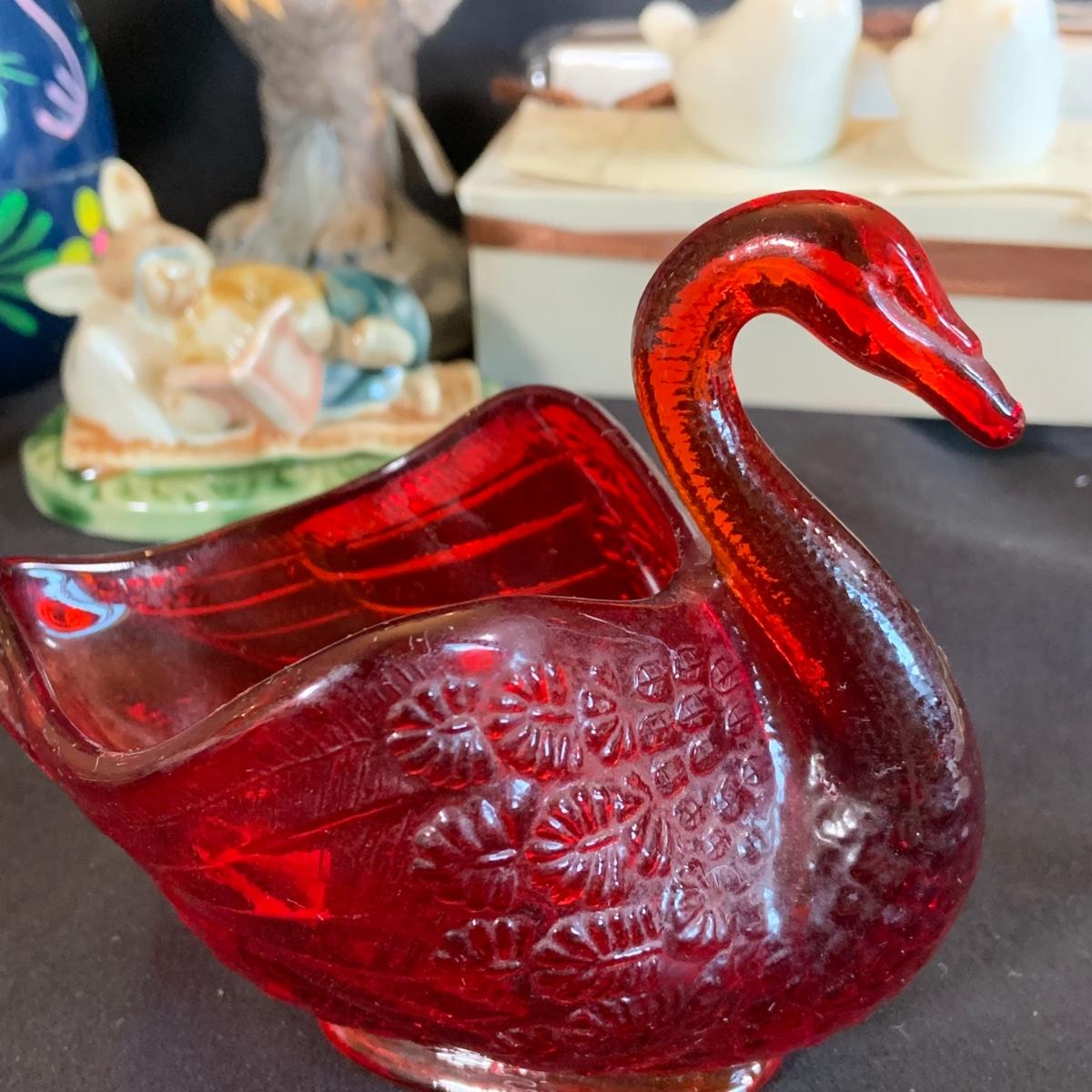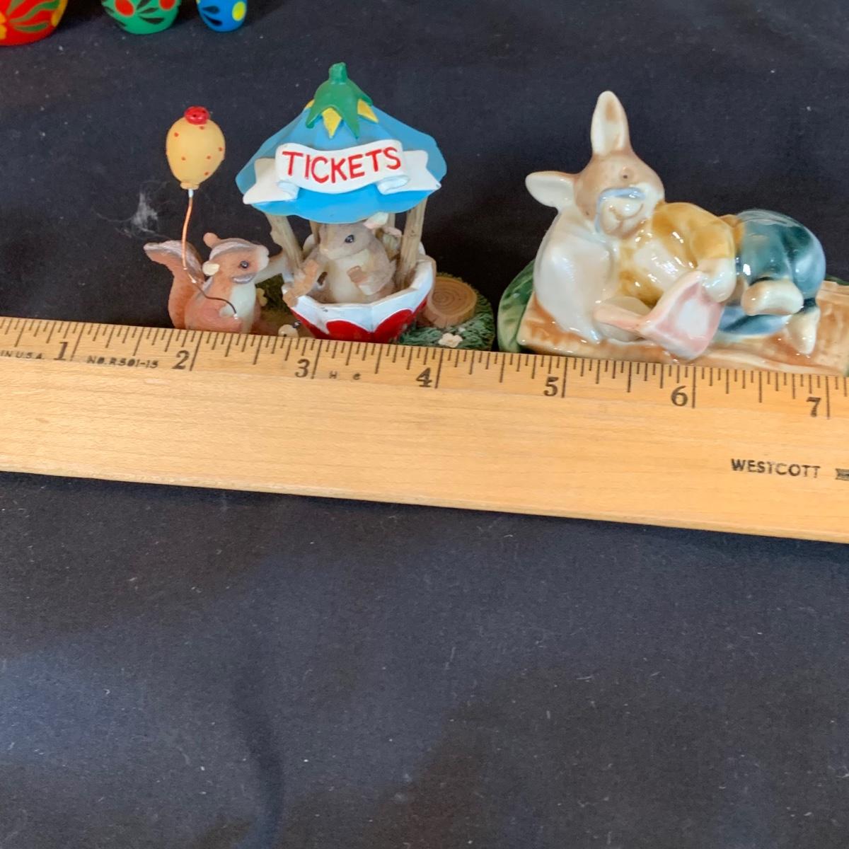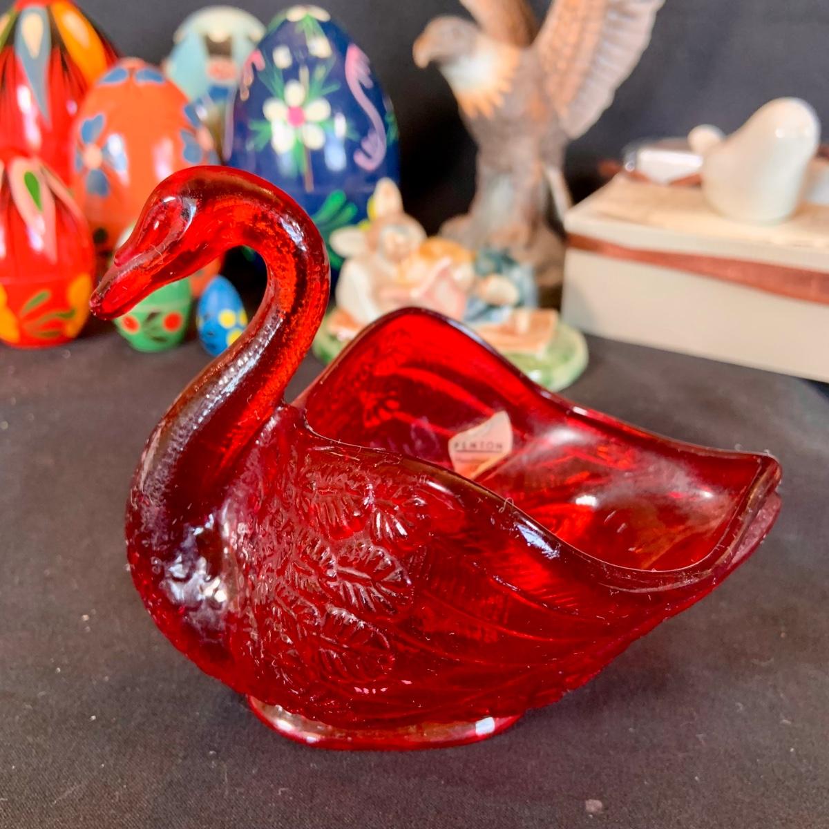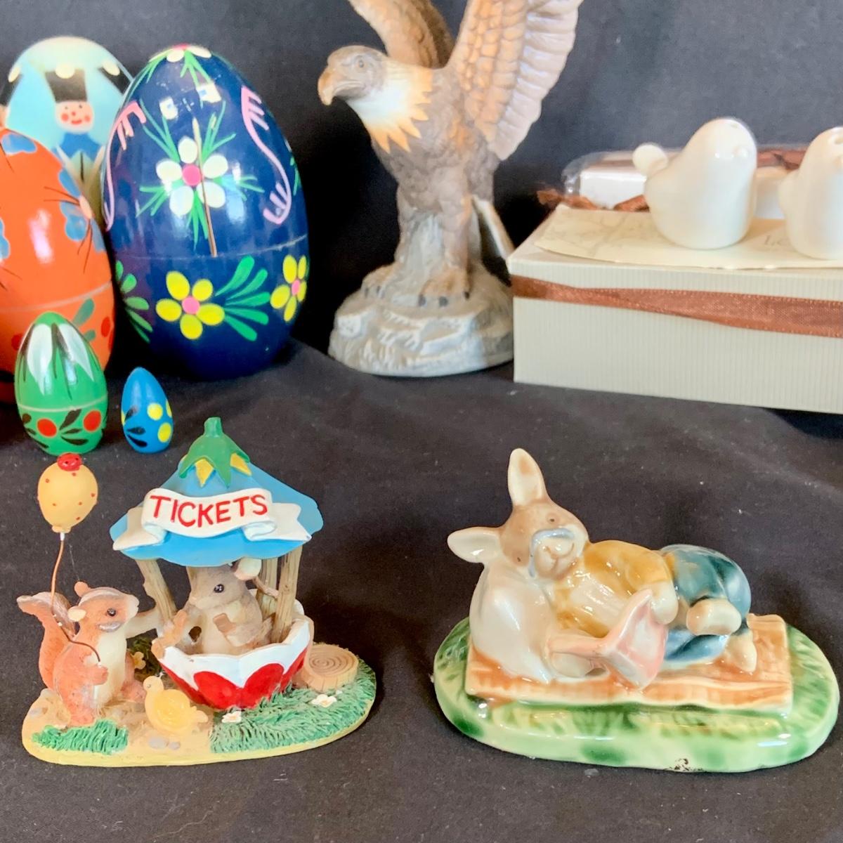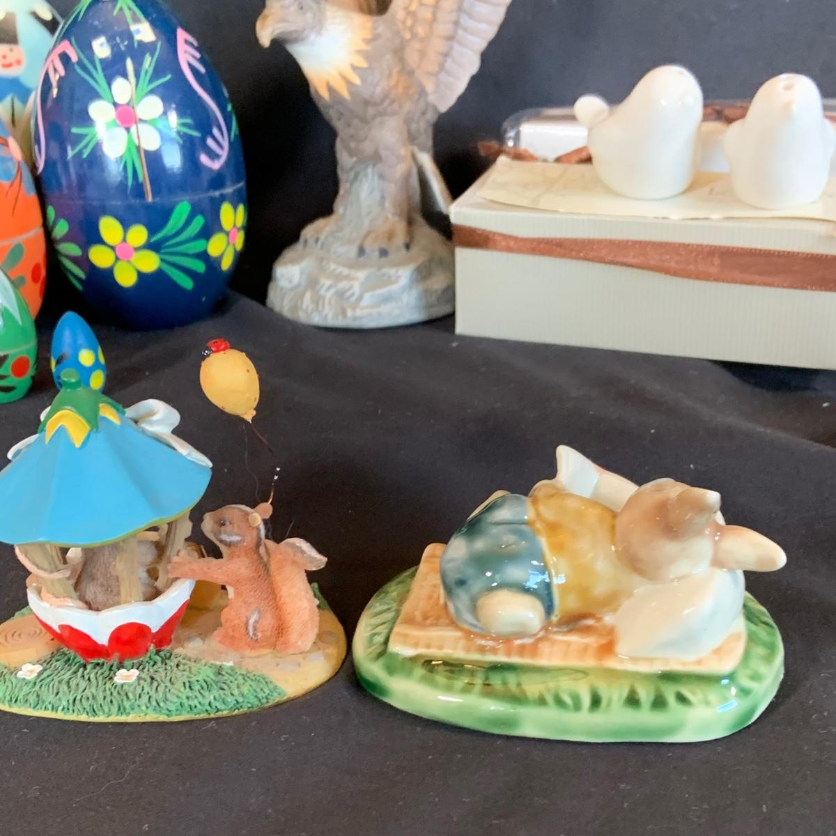 LOT:144: Birds and Mice- Featuring Fenton Red Glass Swan, Charming Tale Figurine, Feathered Ducks 3 Set of Nesting Eggs One with Soldiers, Royal Heritage Eagle and More