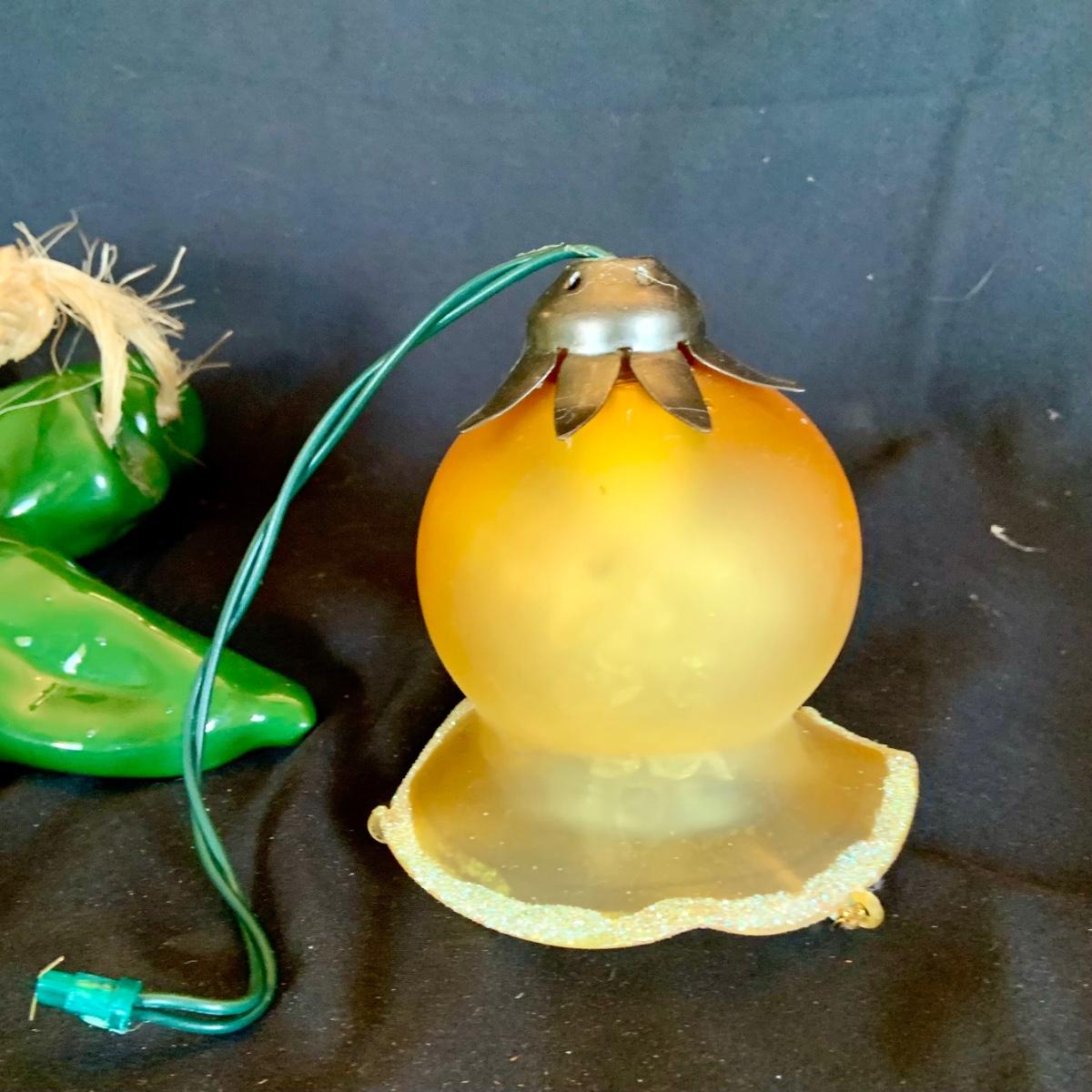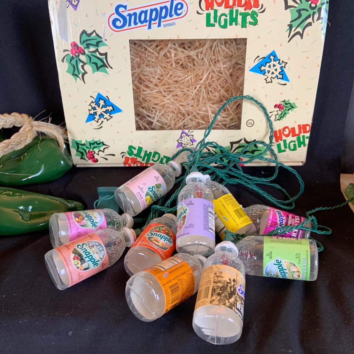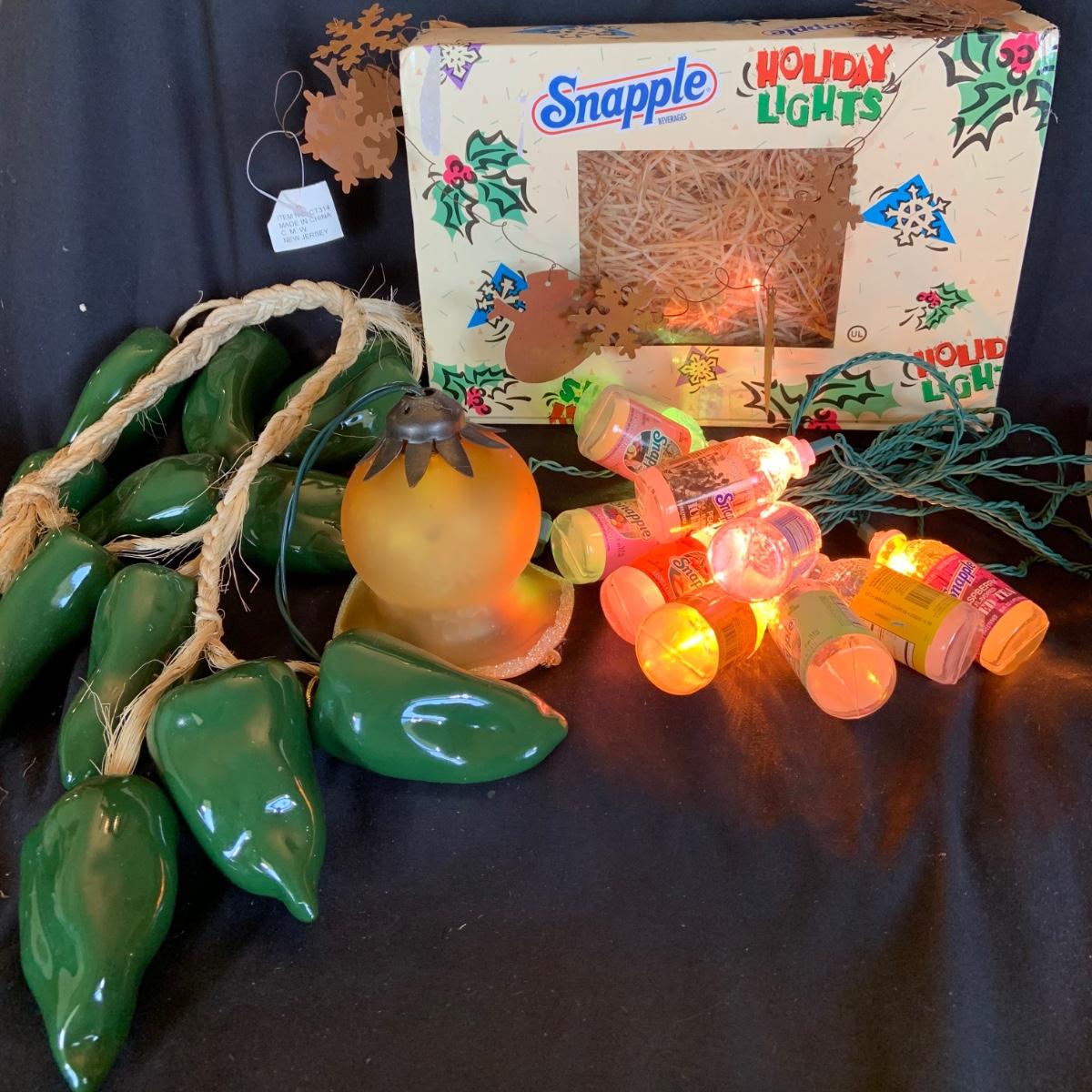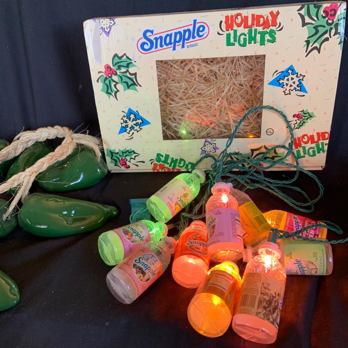 LOT :145: Vintage Snapple Holiday Lights, Hanging String of Porcelain Peppers, Bell Shaped Light and Metal Garland