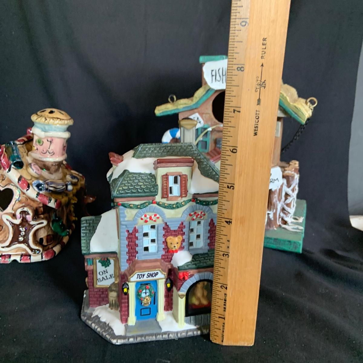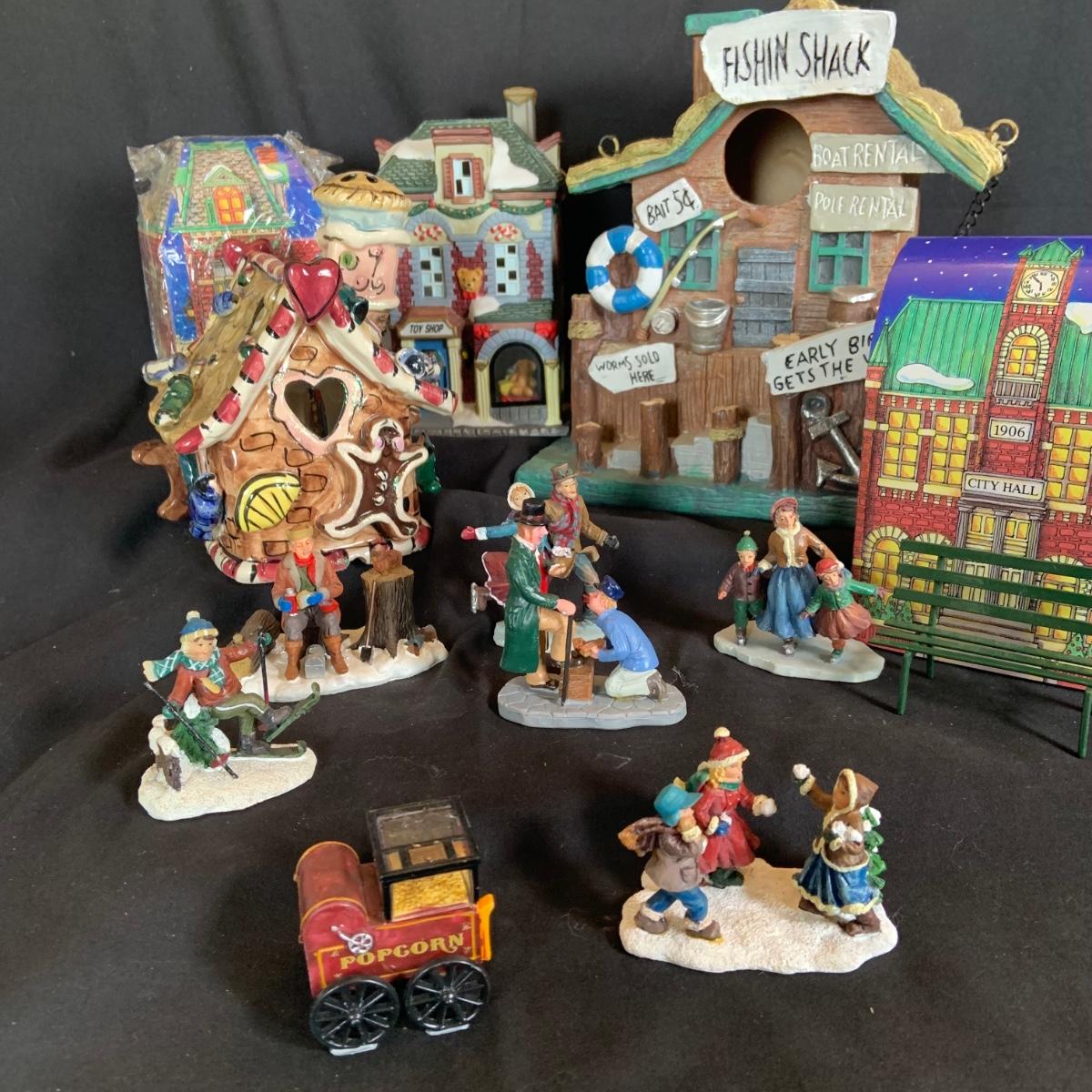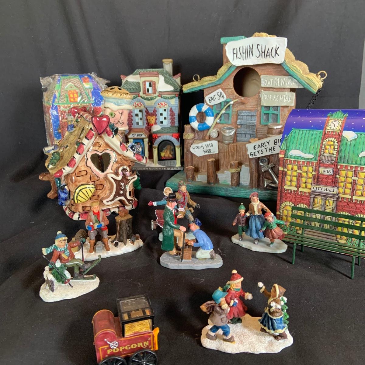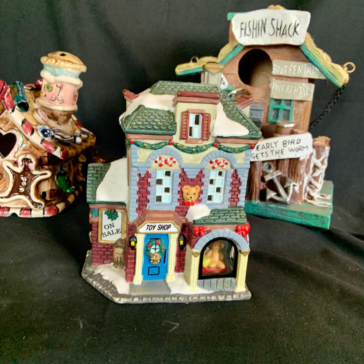 LOT:146: Christmas Village People Dept. 56 House Ornaments, Ceramic Gingerbread and Resin Fishing Shack Bird Houses, and Christmas Village Toy Shop