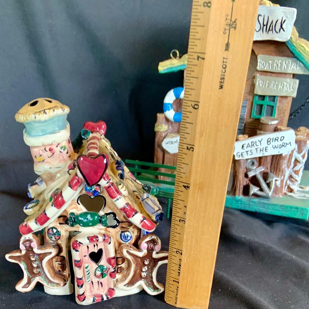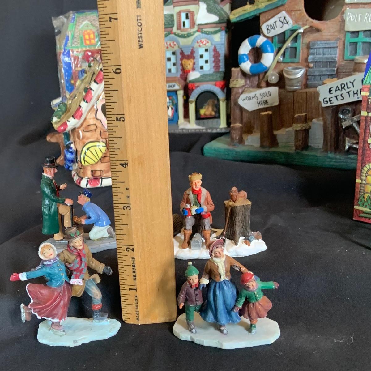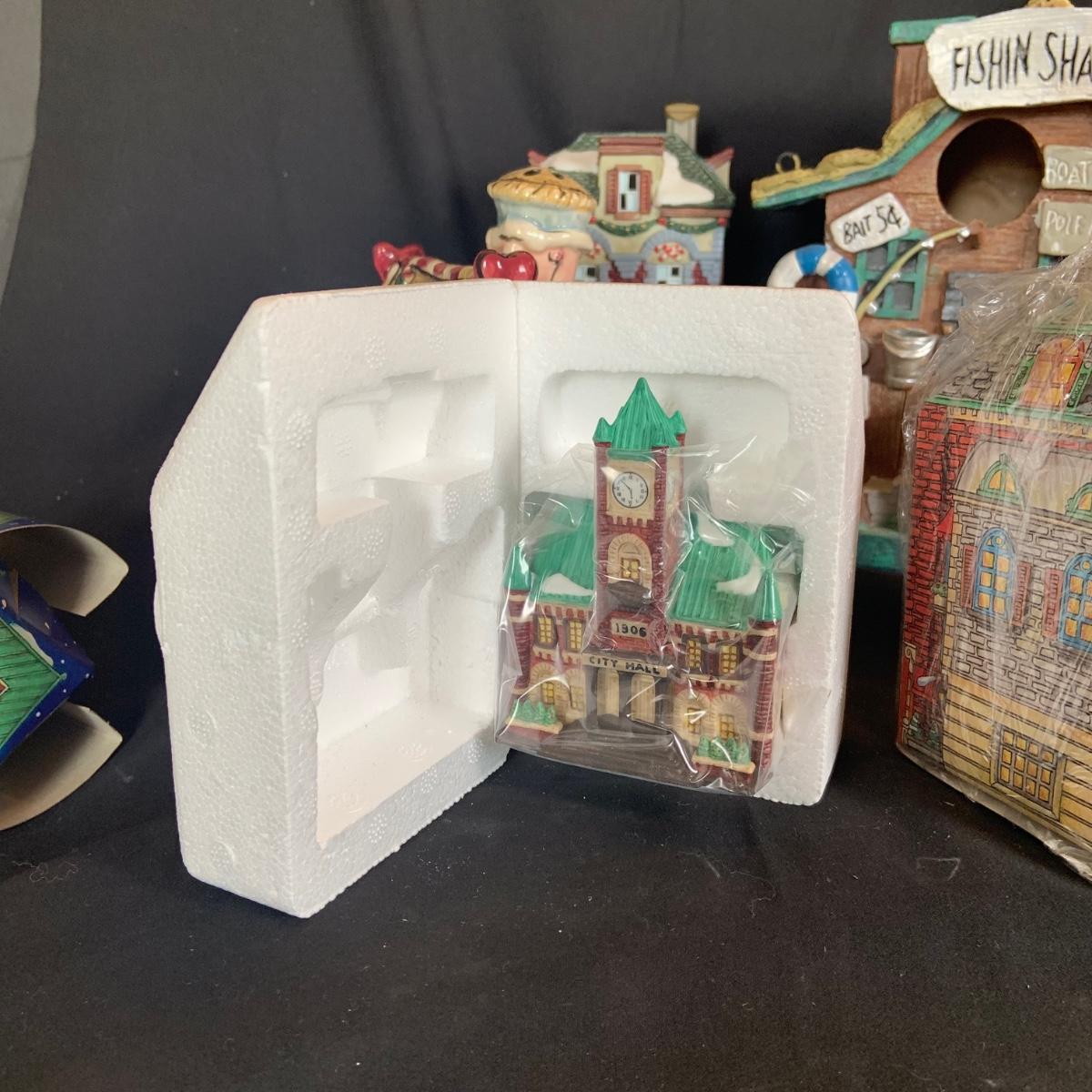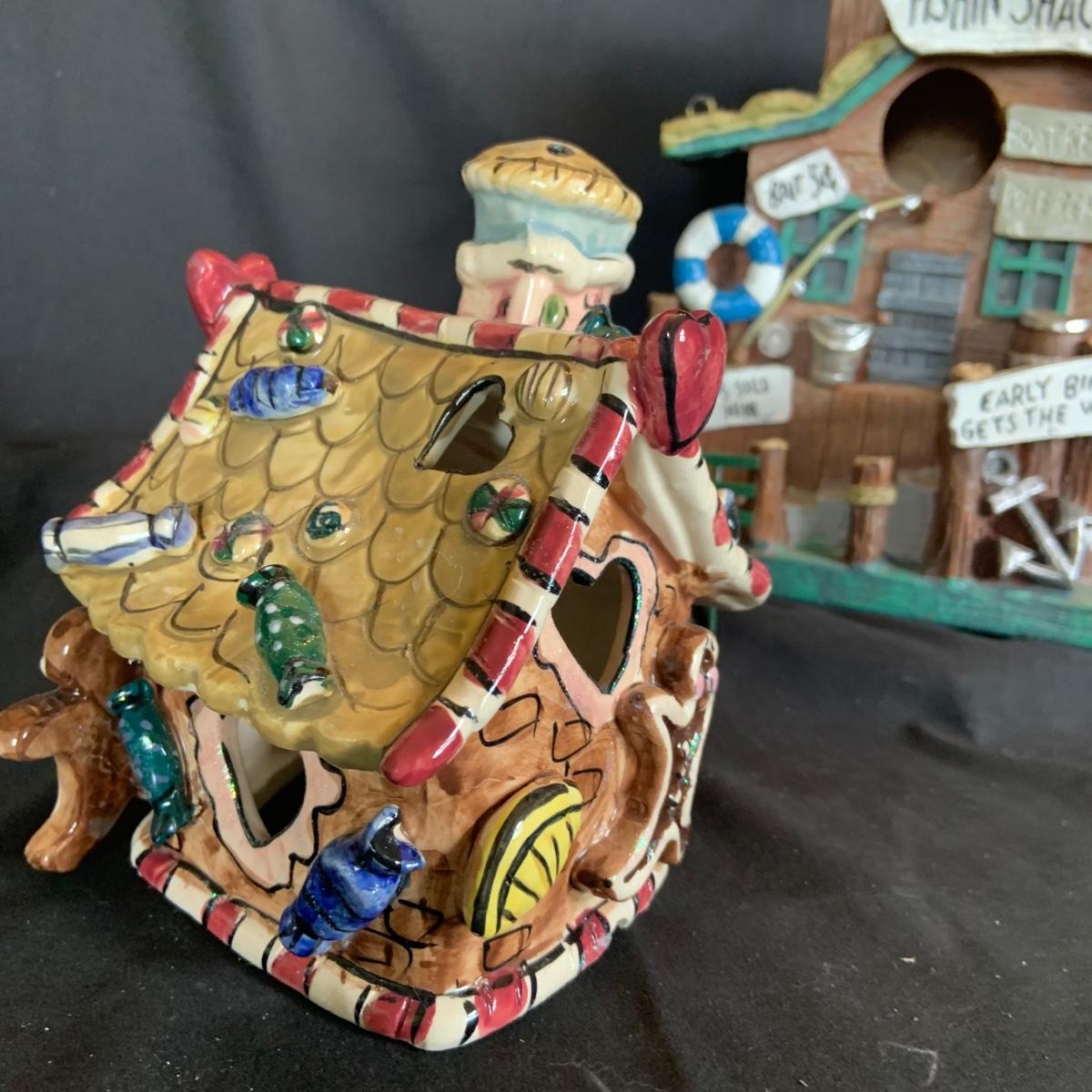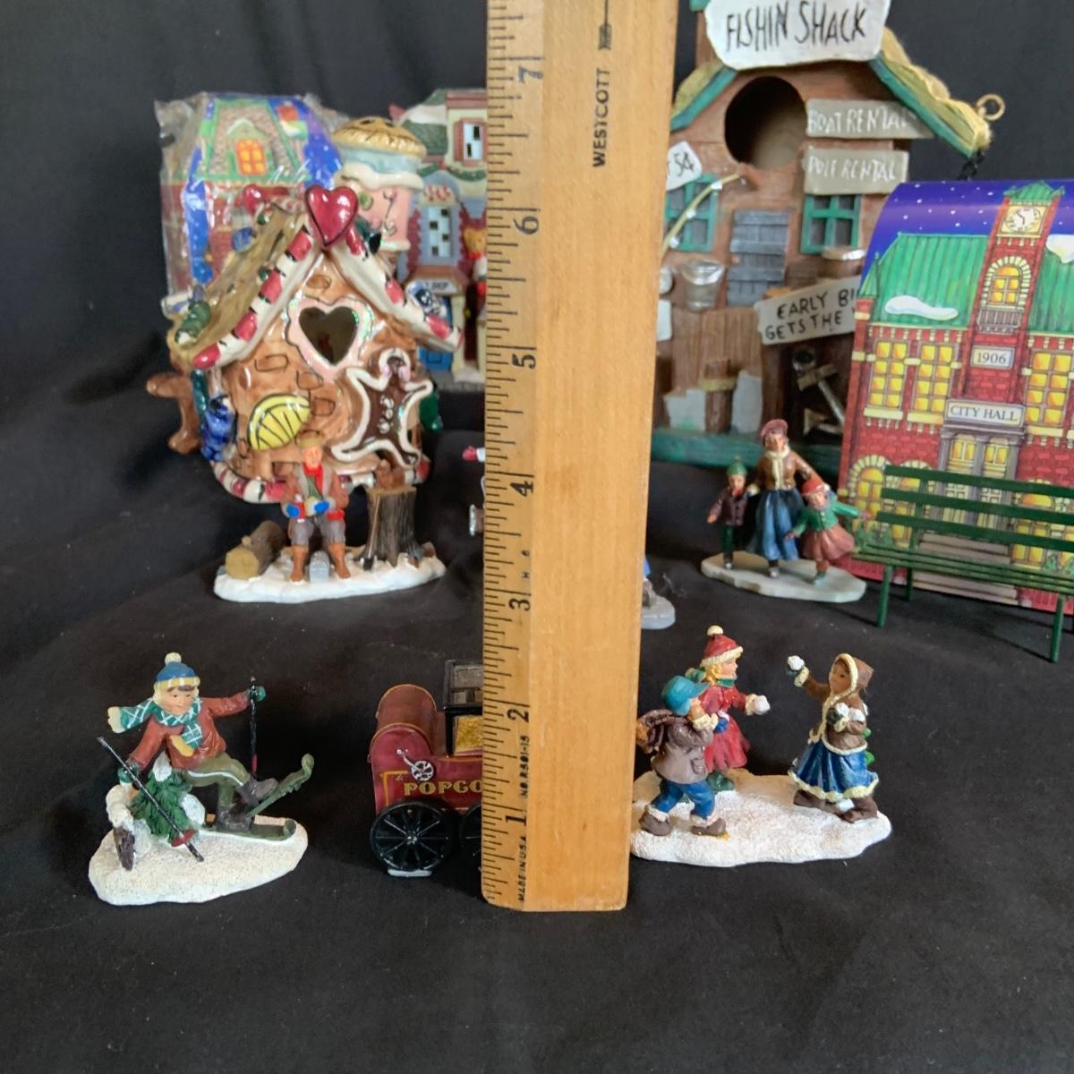 LOT:146: Christmas Village People Dept. 56 House Ornaments, Ceramic Gingerbread and Resin Fishing Shack Bird Houses, and Christmas Village Toy Shop