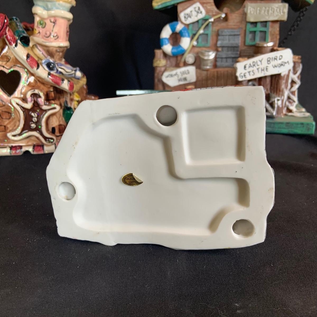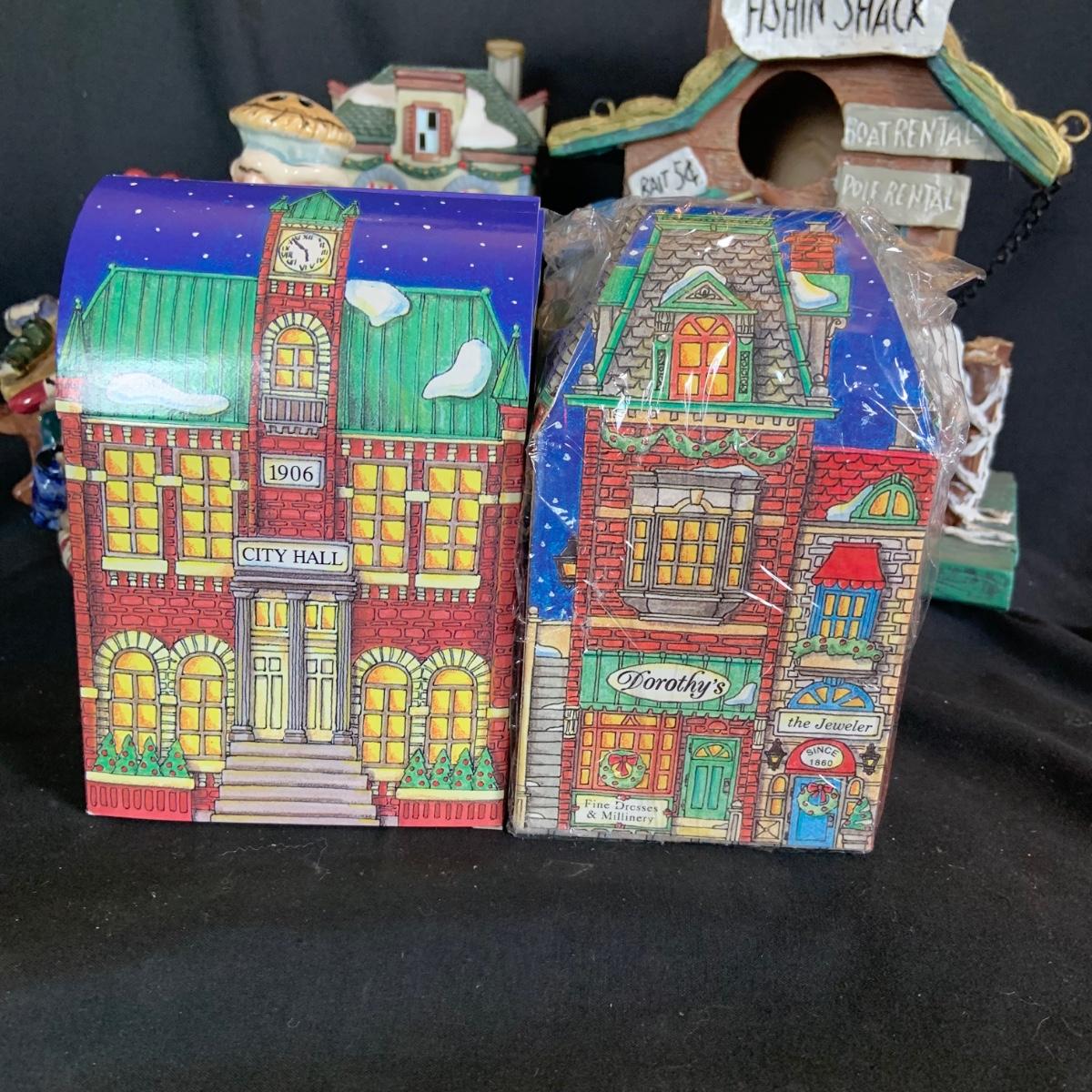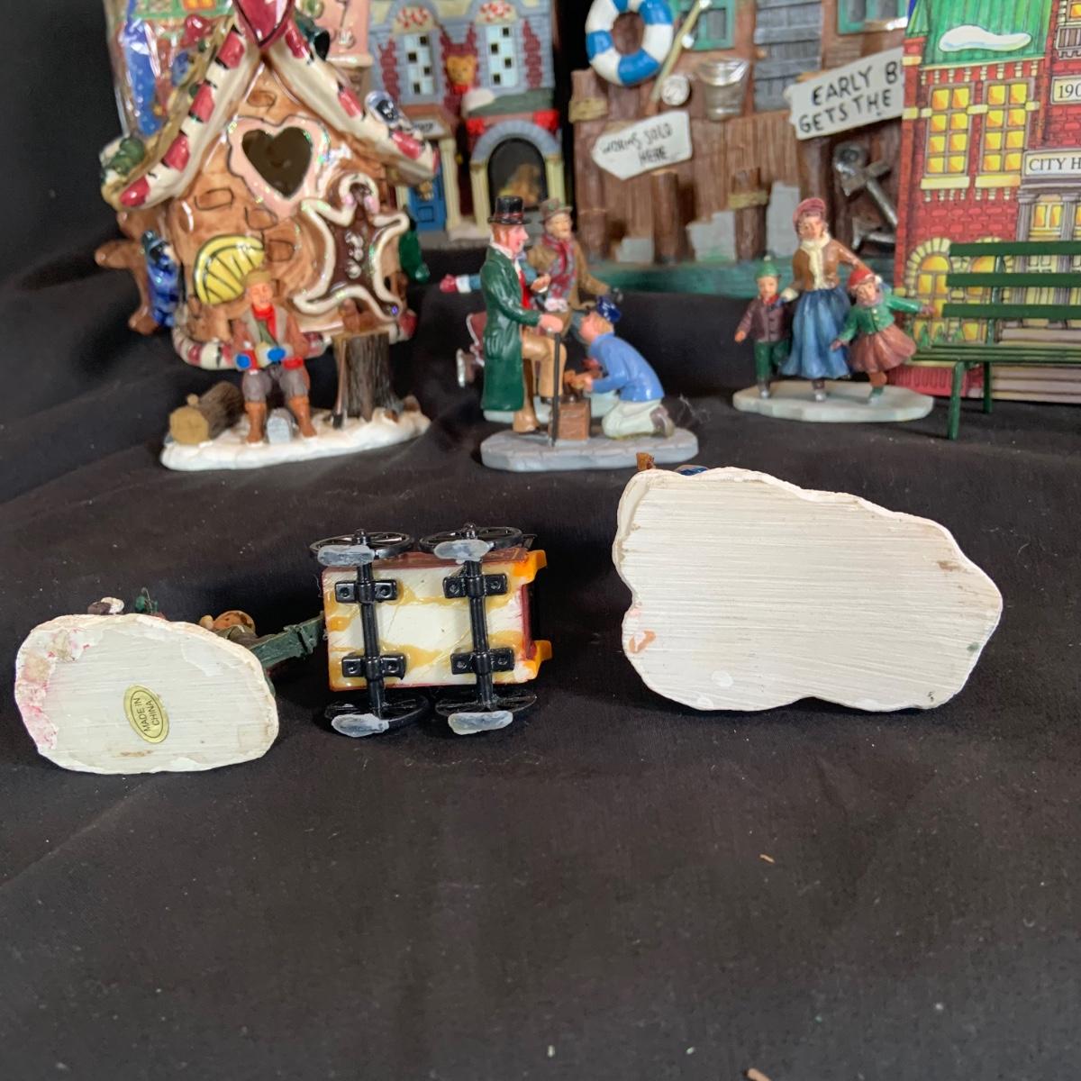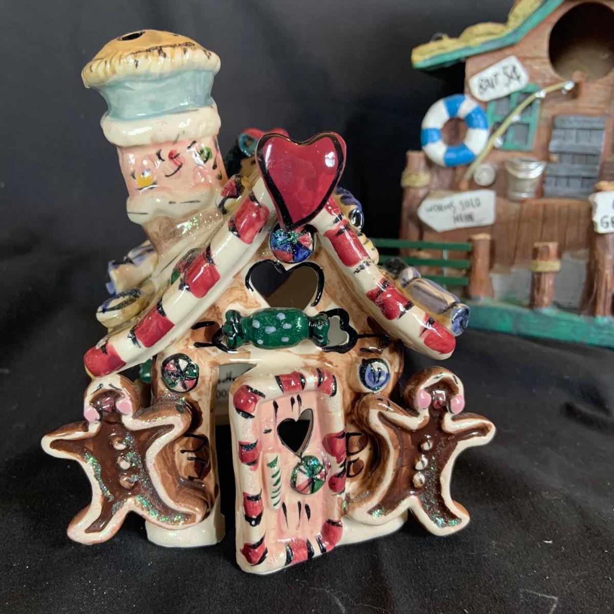 LOT:146: Christmas Village People Dept. 56 House Ornaments, Ceramic Gingerbread and Resin Fishing Shack Bird Houses, and Christmas Village Toy Shop