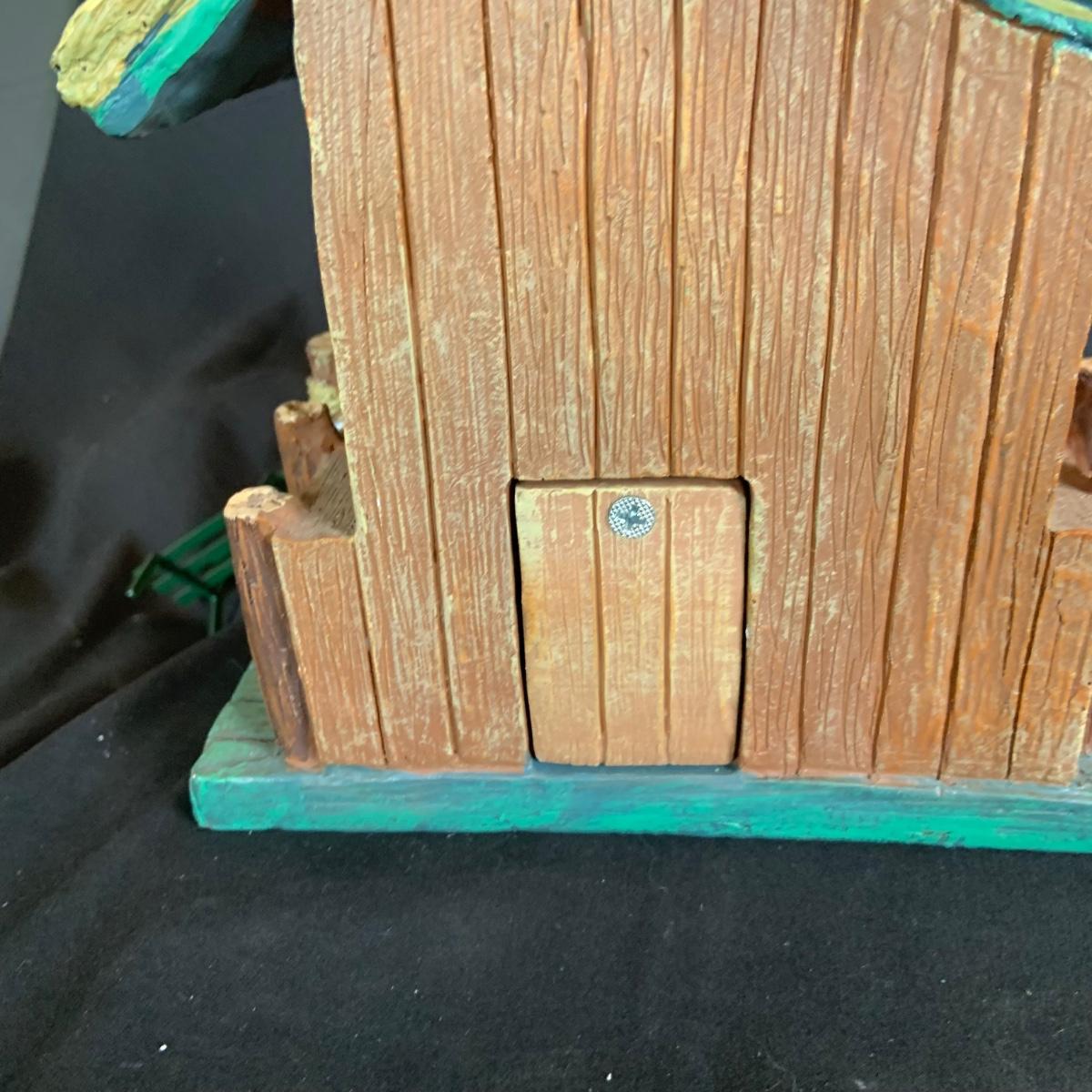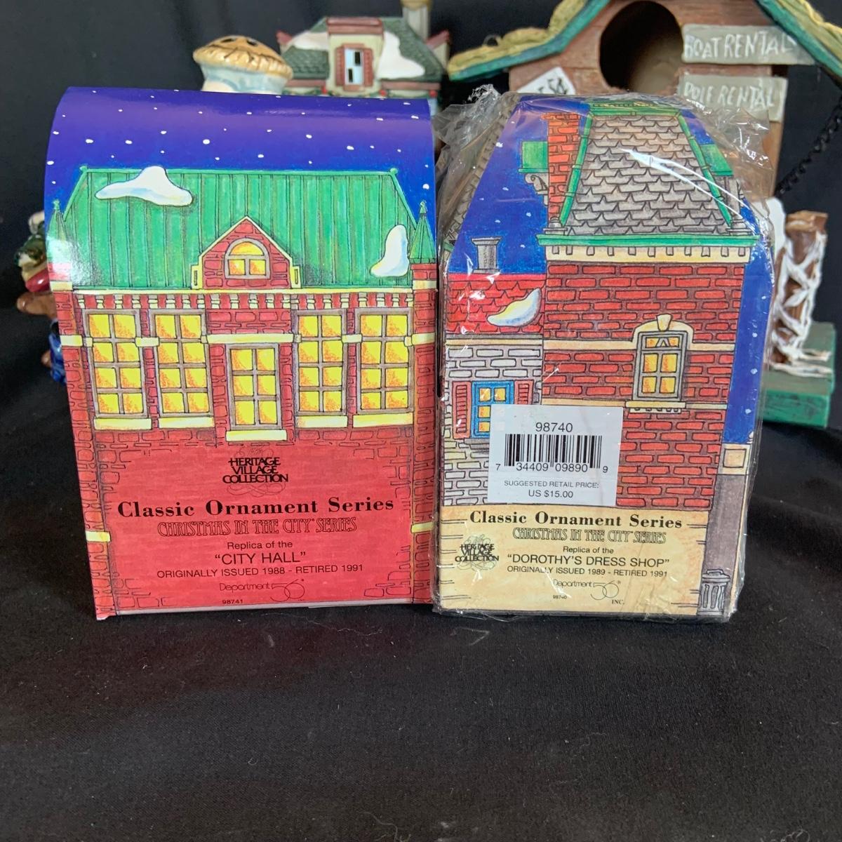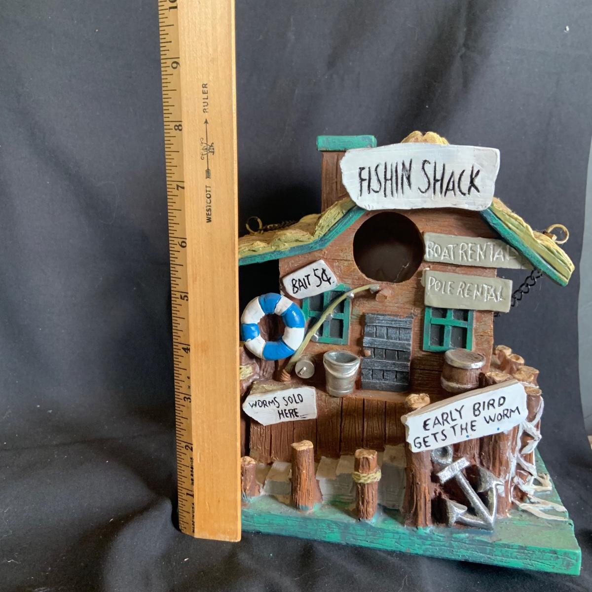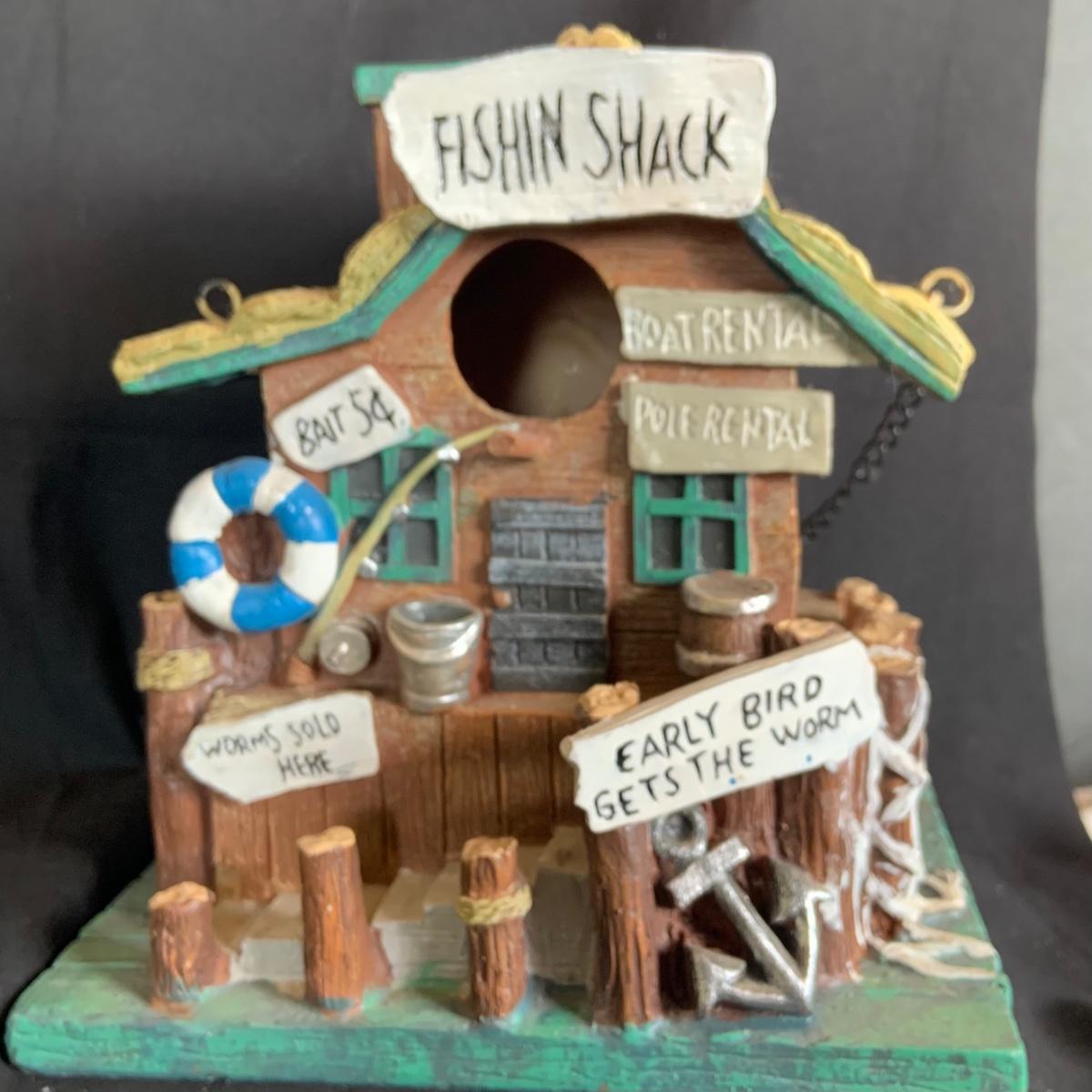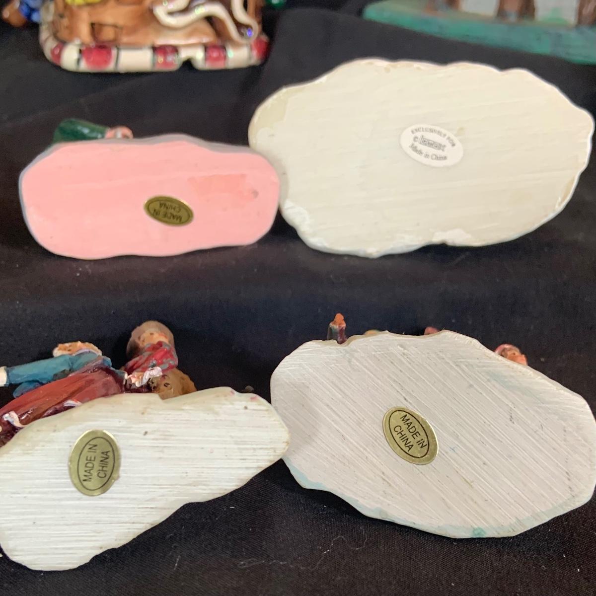 LOT:146: Christmas Village People Dept. 56 House Ornaments, Ceramic Gingerbread and Resin Fishing Shack Bird Houses, and Christmas Village Toy Shop