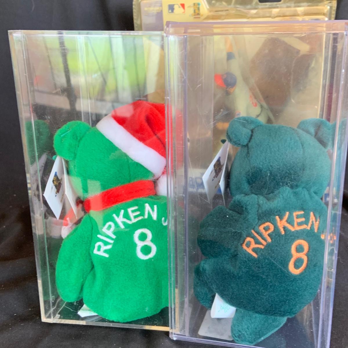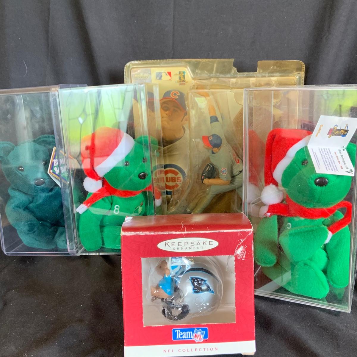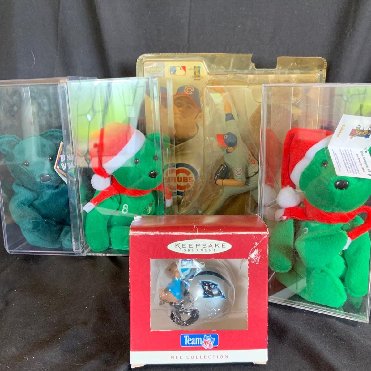 LOT:152: Beanie Bears - # 8 Cal Ripkin Bears and (2) #3 Rodrigues with Santa Hats, Mark Prior McFarland Action Figure, and Hallmark NFL Panther Ornament