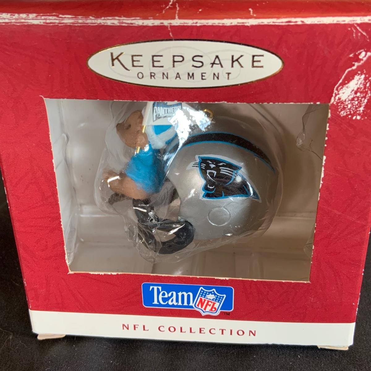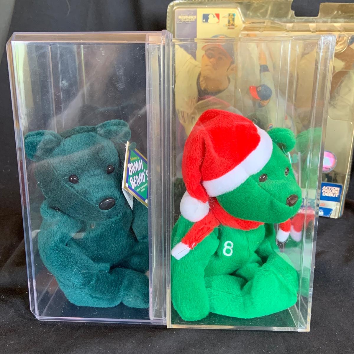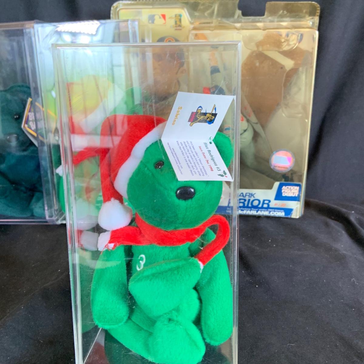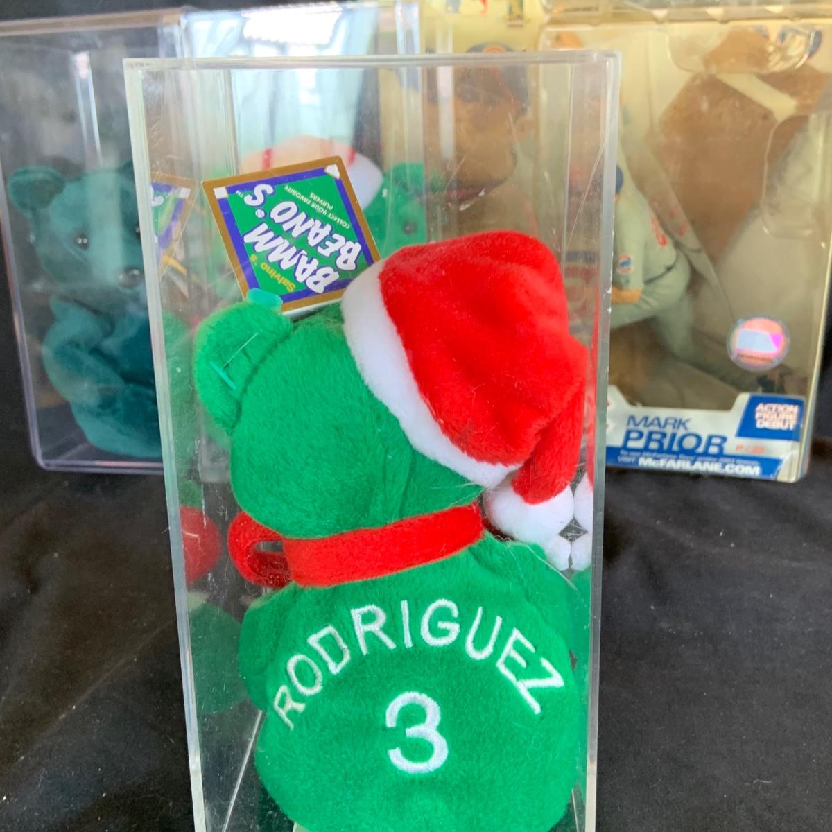 LOT:152: Beanie Bears - # 8 Cal Ripkin Bears and (2) #3 Rodrigues with Santa Hats, Mark Prior McFarland Action Figure, and Hallmark NFL Panther Ornament