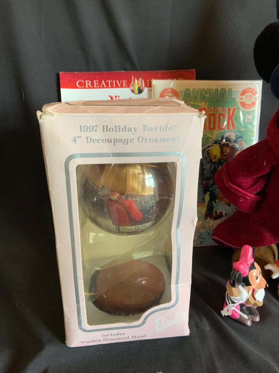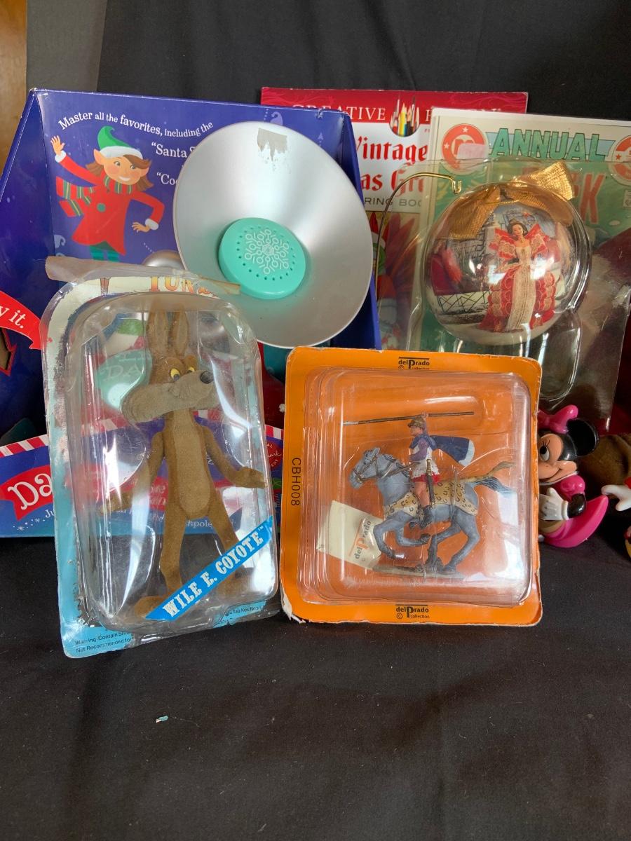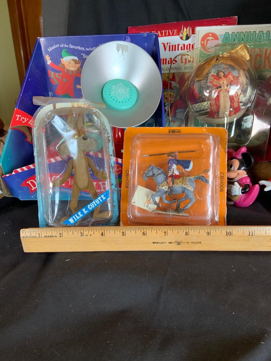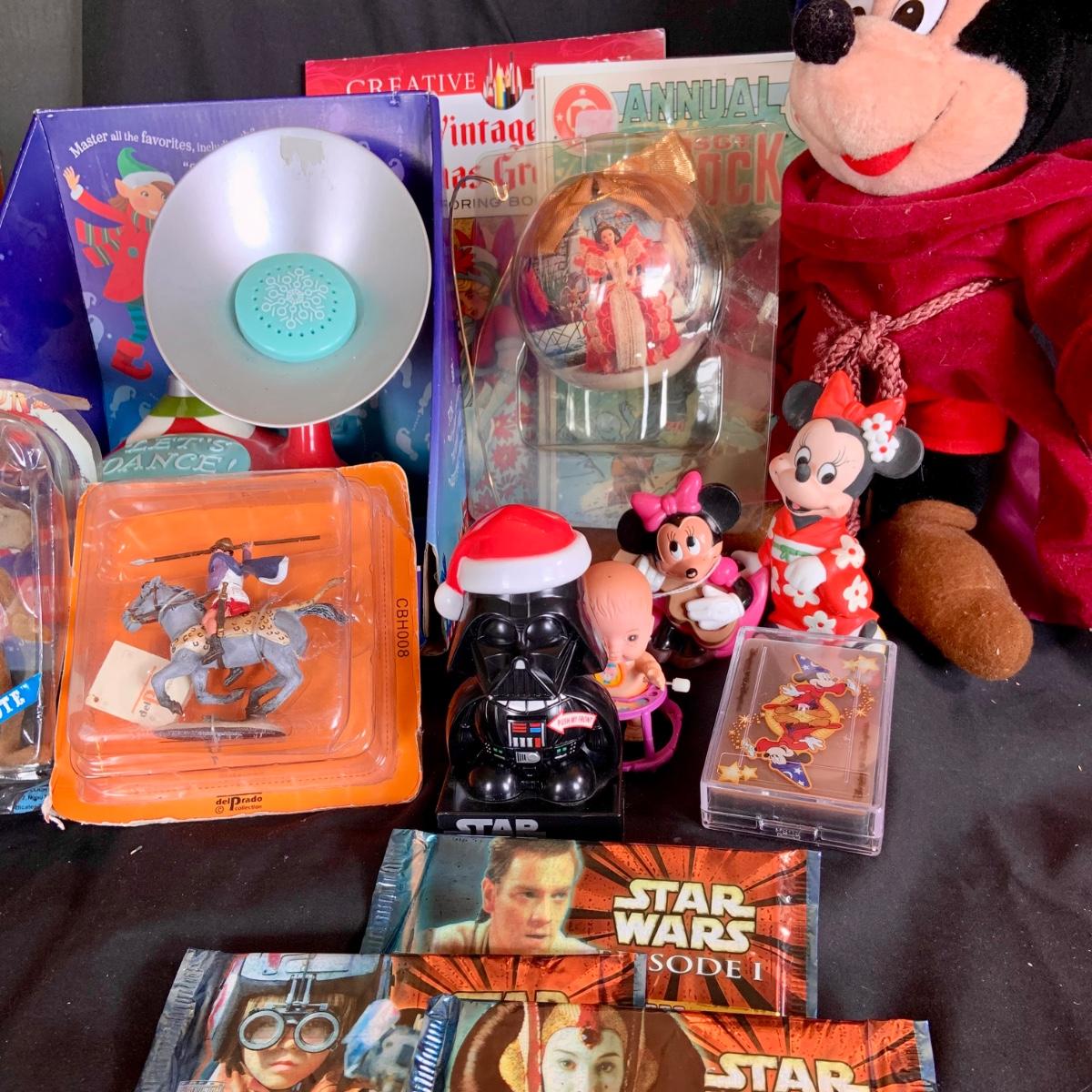 LOT:154: Disney and Other Holiday Toys and Books Including Star Wars Trading Cards, Minnie Figurine, Mickey Fantasia Wizard, Barbie Ornament, Wile E Coyote Toy Comic Books and More
