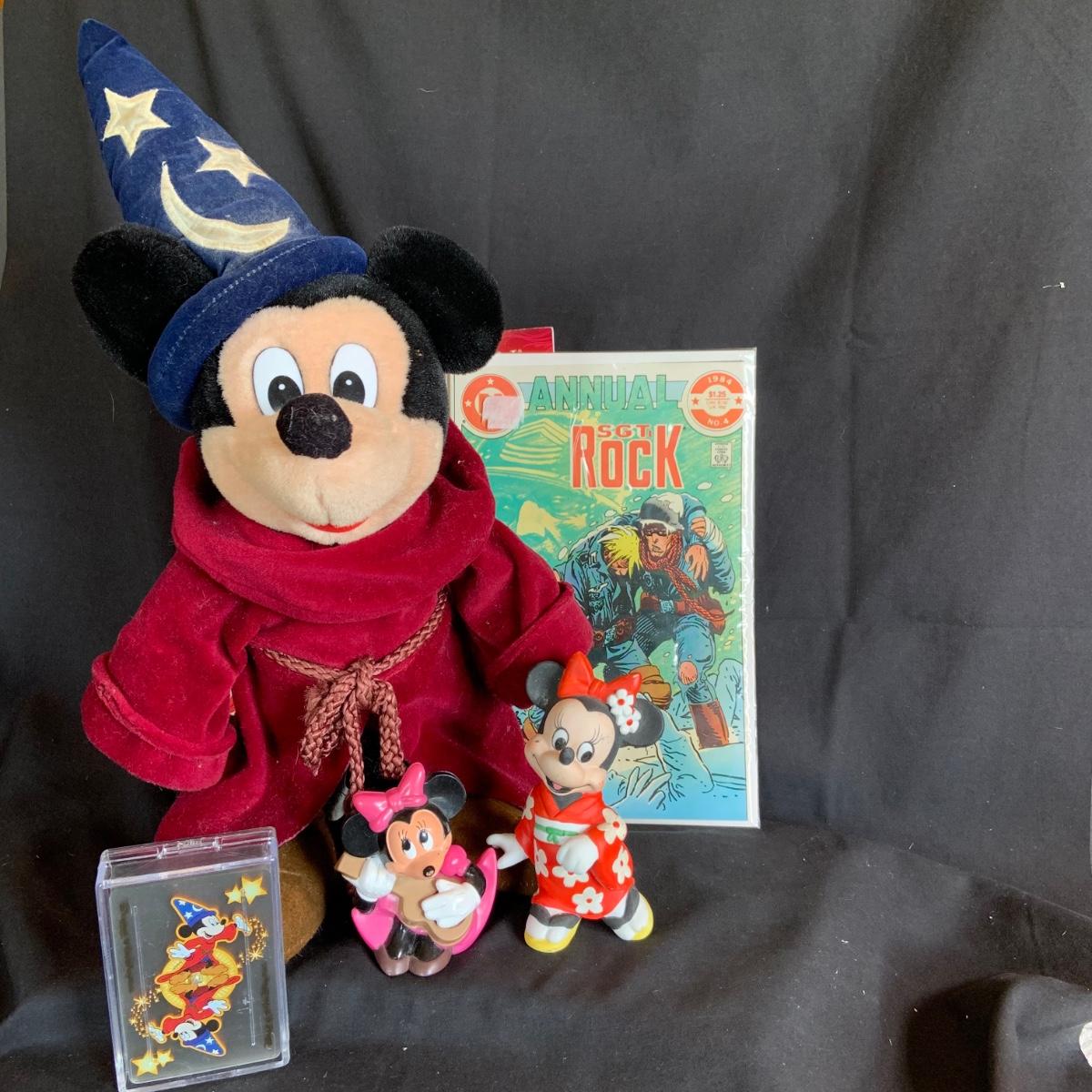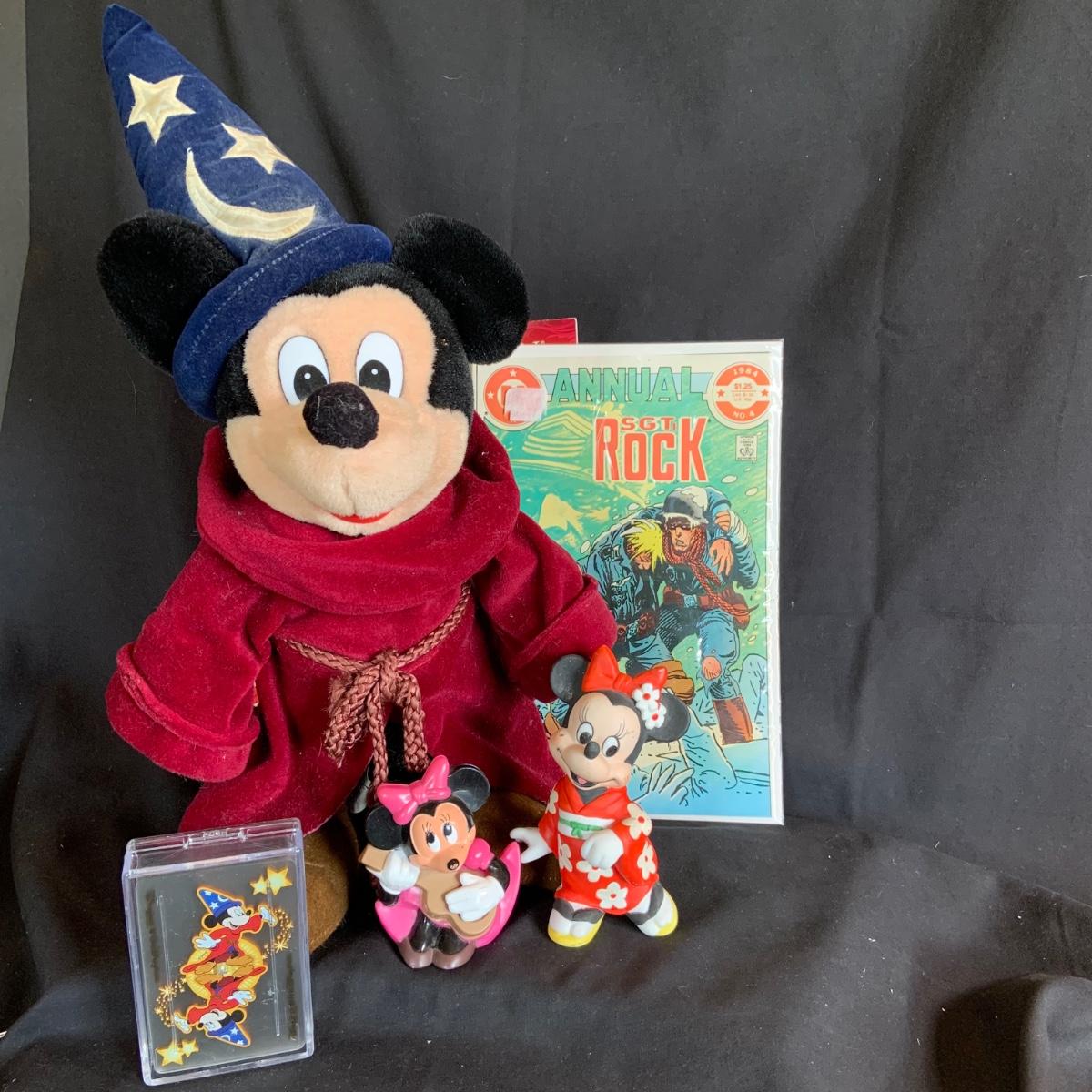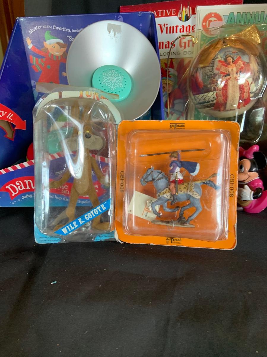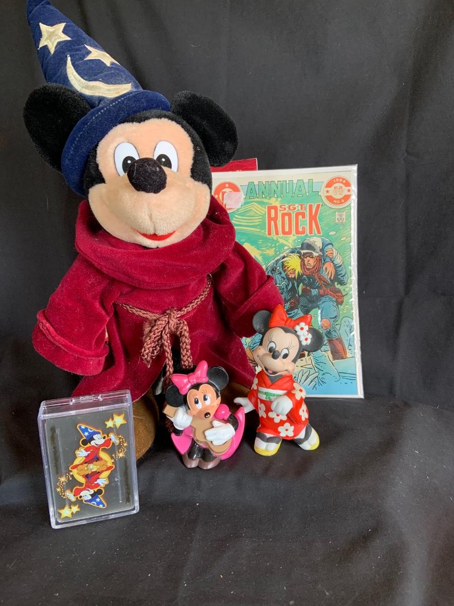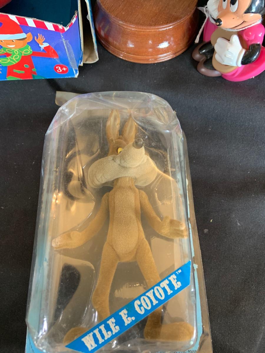LOT:154: Disney and Other Holiday Toys and Books Including Star Wars Trading Cards, Minnie Figurine, Mickey Fantasia Wizard, Barbie Ornament, Wile E Coyote Toy Comic Books and More