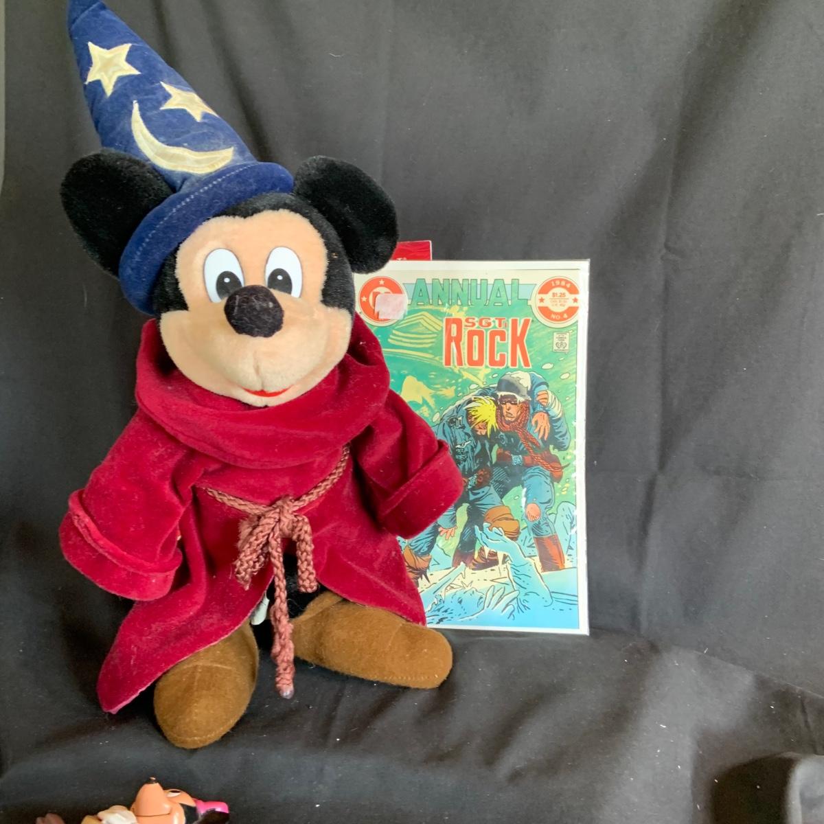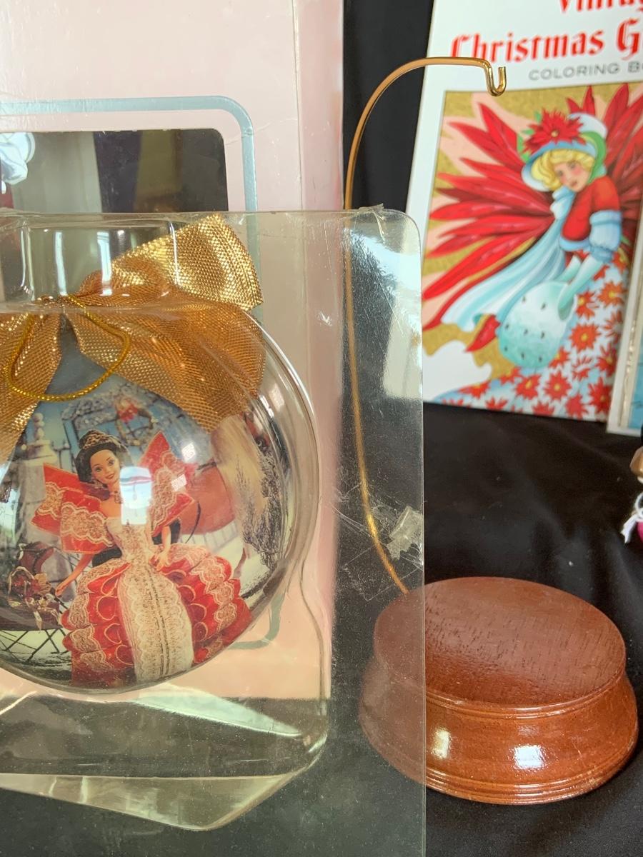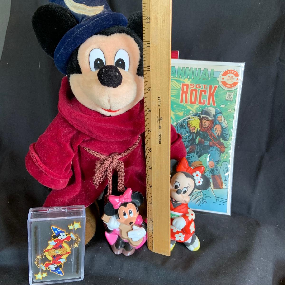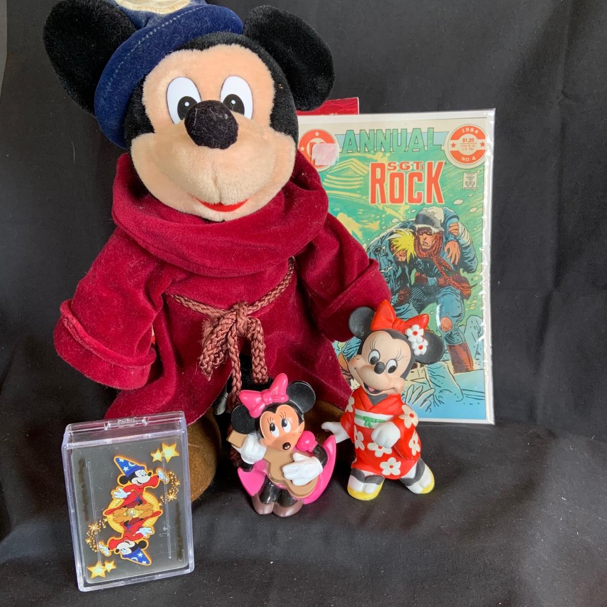 LOT:154: Disney and Other Holiday Toys and Books Including Star Wars Trading Cards, Minnie Figurine, Mickey Fantasia Wizard, Barbie Ornament, Wile E Coyote Toy Comic Books and More