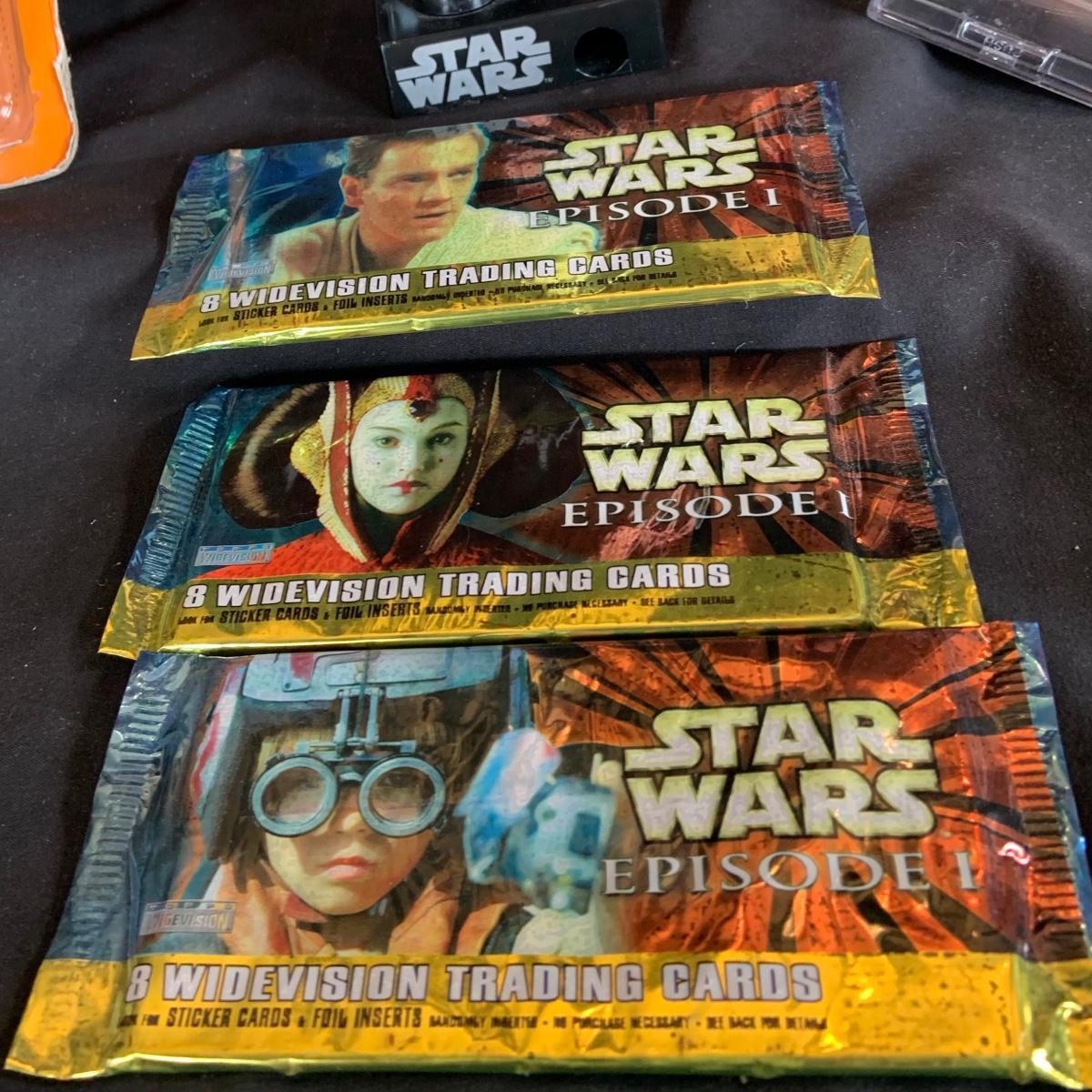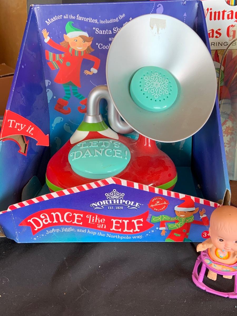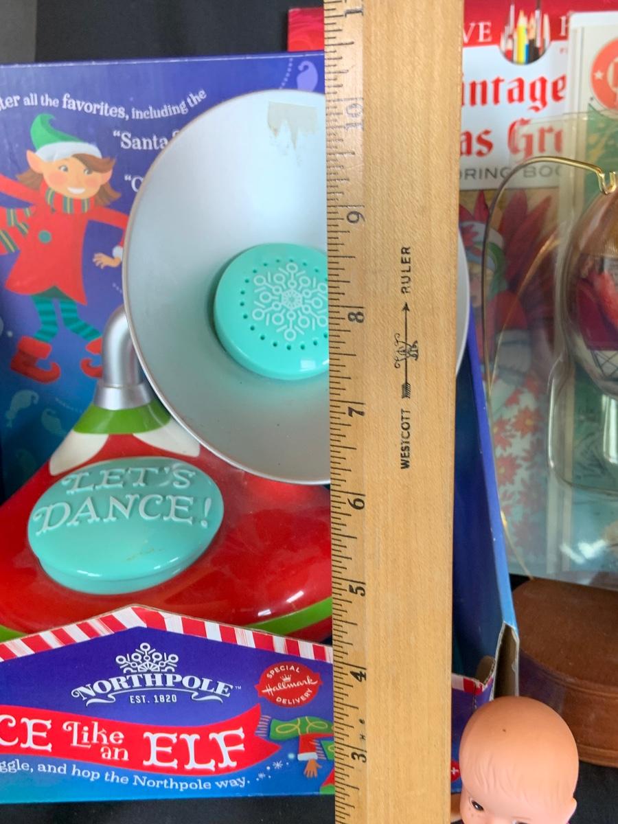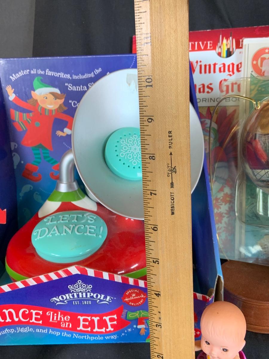 LOT:154: Disney and Other Holiday Toys and Books Including Star Wars Trading Cards, Minnie Figurine, Mickey Fantasia Wizard, Barbie Ornament, Wile E Coyote Toy Comic Books and More