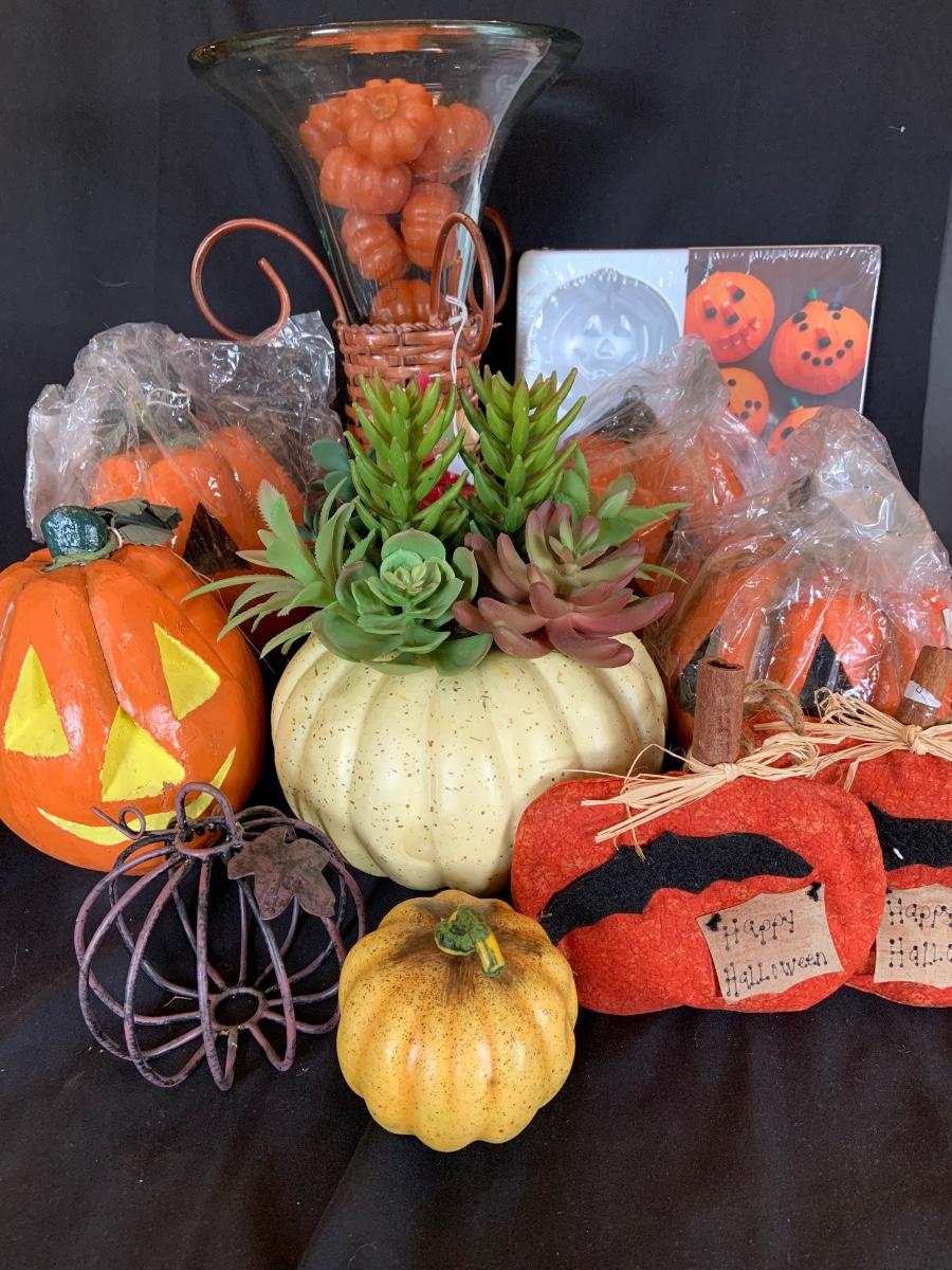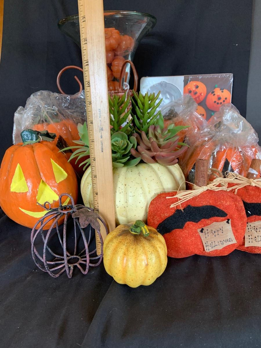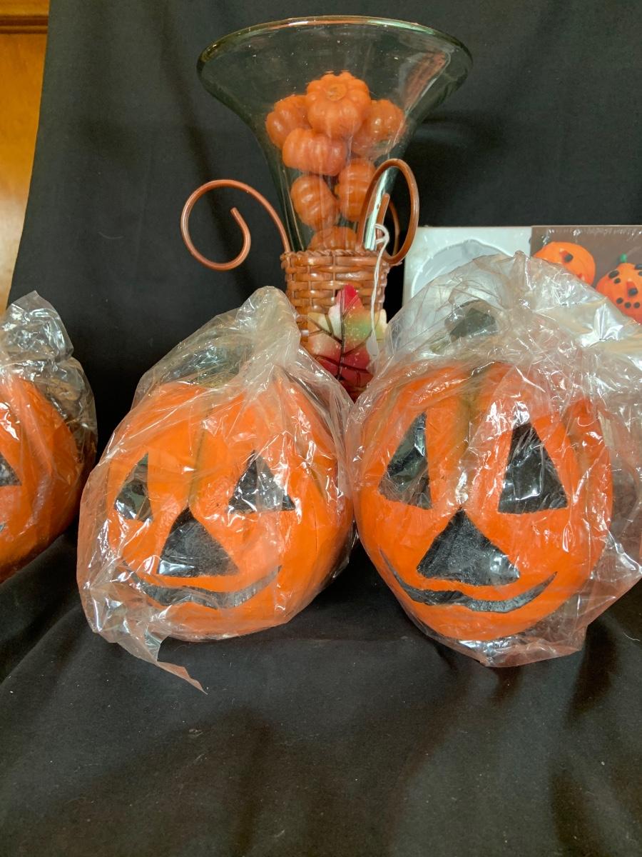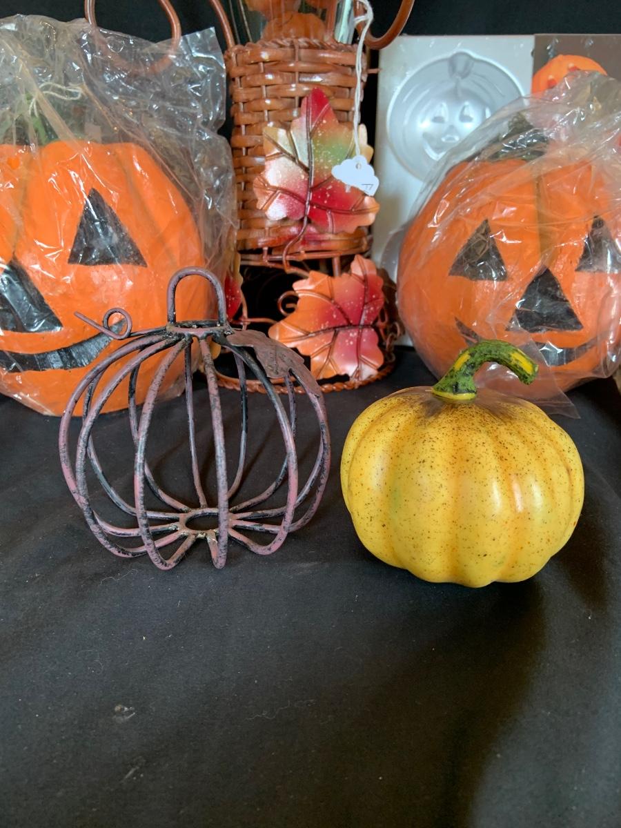 LOT:166: Fall and Halloween Pumpkin Decorations Including Jack-o-Lantern Cupcake Pans, Candles and More