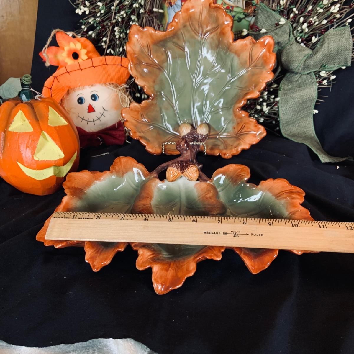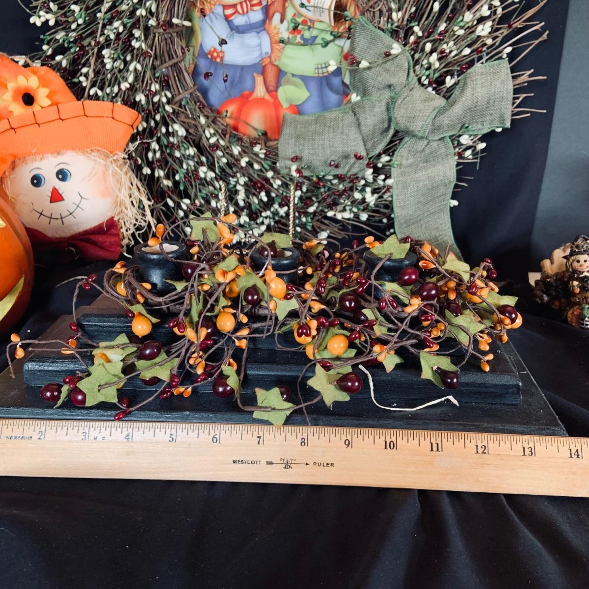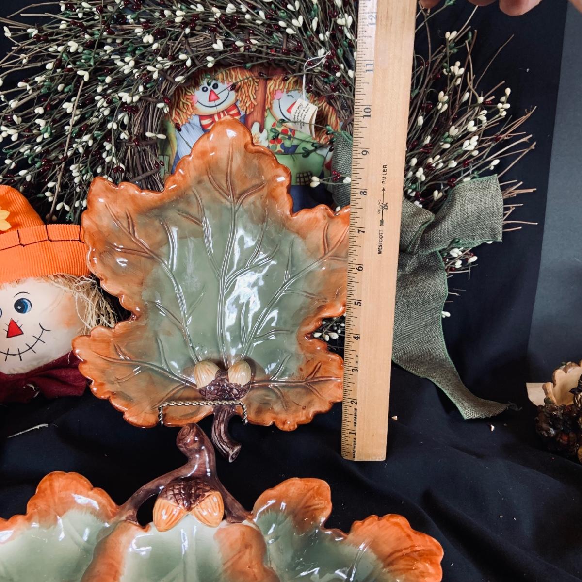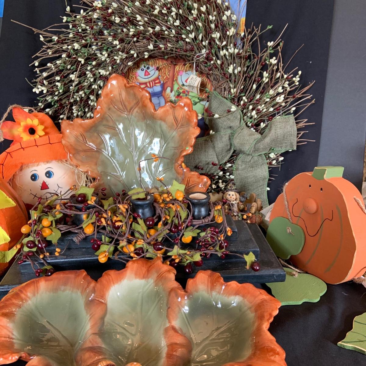 LOT:167: Autumn Decor Including Rustic Wood Candle Holder Wreath, Flag, Leaf Shaped Dishes and More