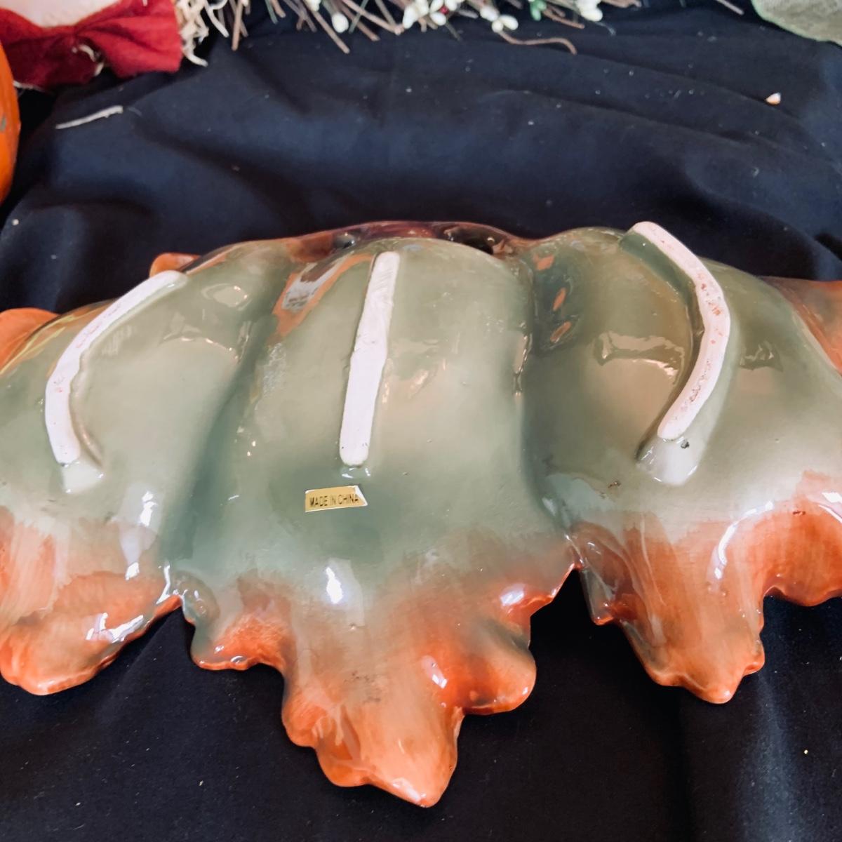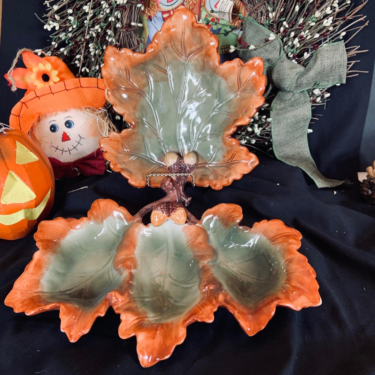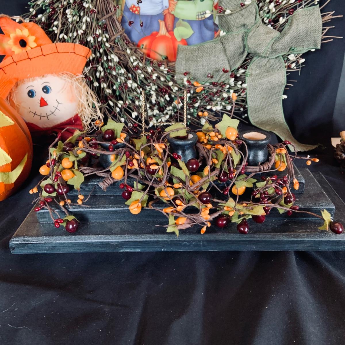 LOT:167: Autumn Decor Including Rustic Wood Candle Holder Wreath, Flag, Leaf Shaped Dishes and More