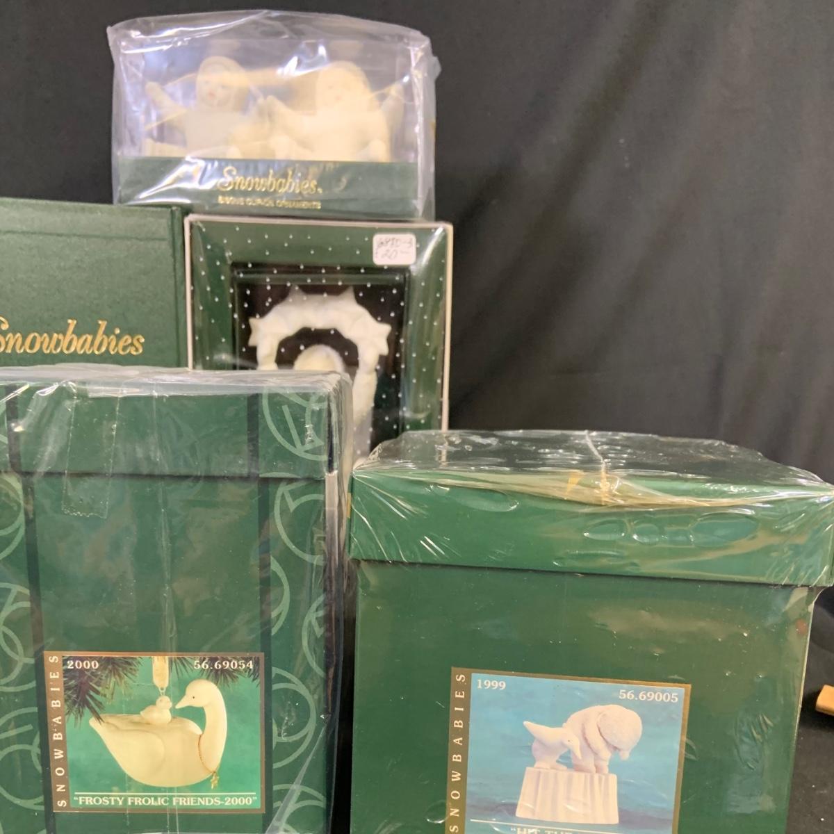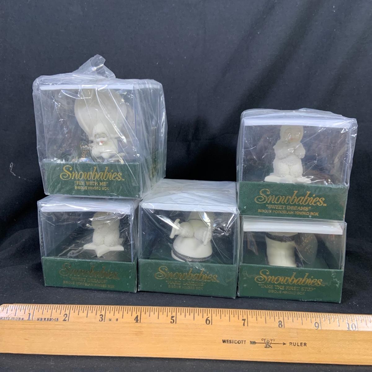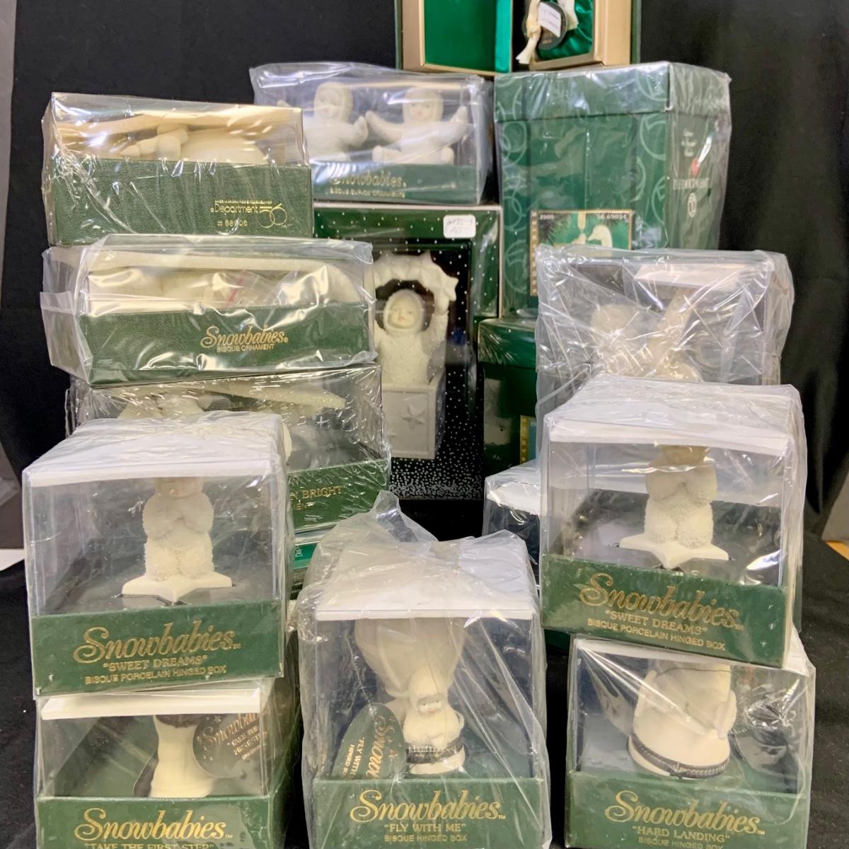 LOT:186: Large Selection of Dept 56 Snowbabies Porcelain Figurines, Trinket Boxes, Ornaments and More- All in Original Boxes Most Unopened