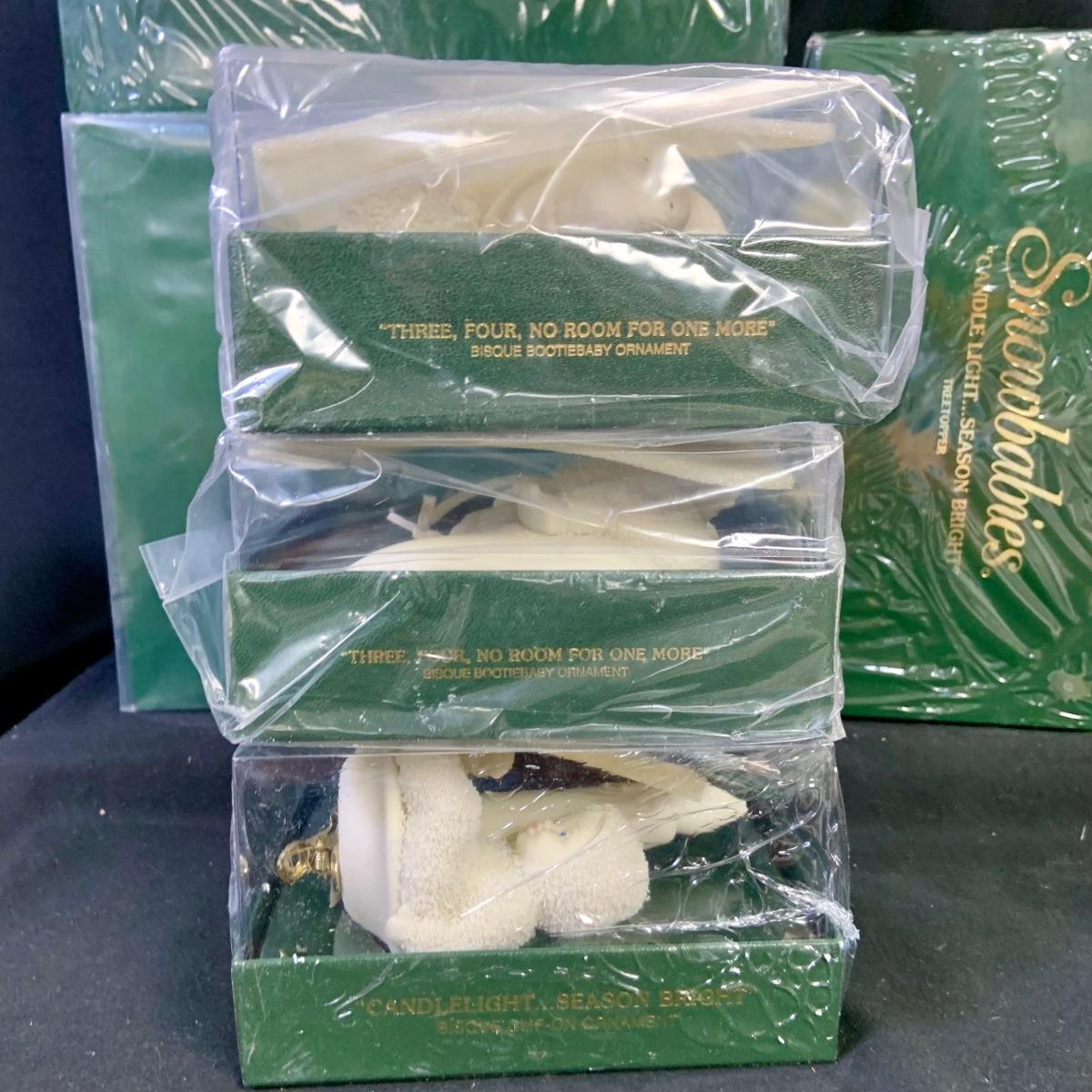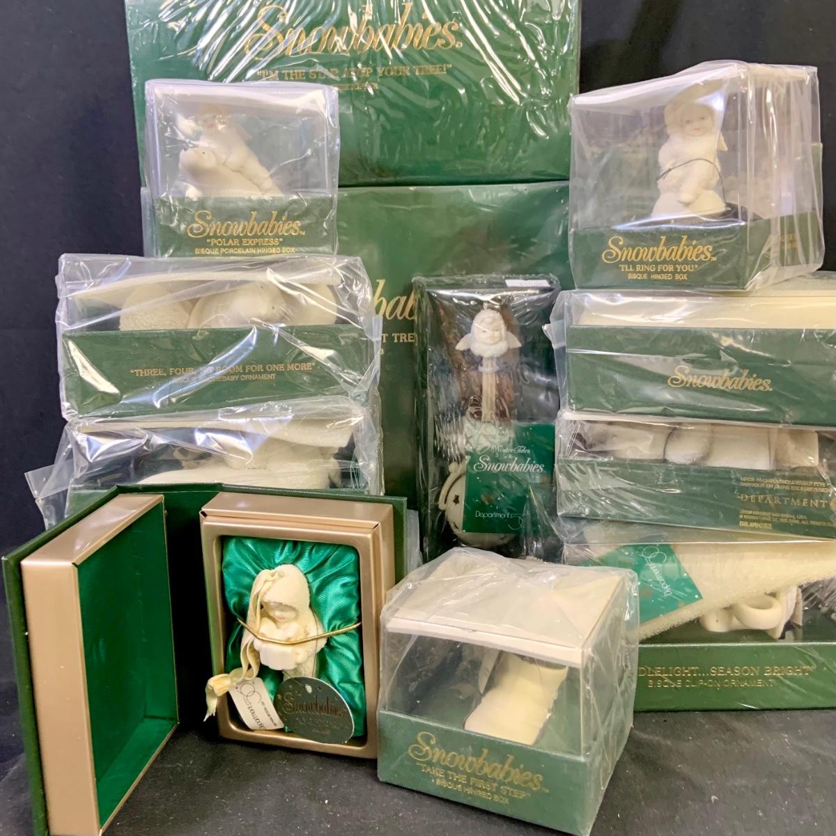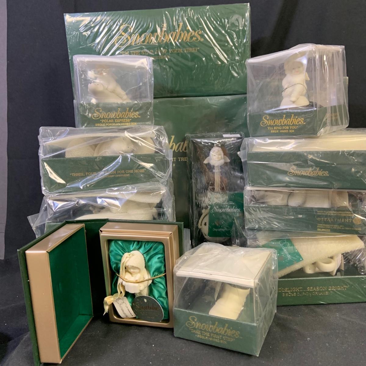 LOT:190: Large Selection of Dept 56 Snowbabies Porcelain Figurines Ornaments, Rattle and More - All in Original Boxes Most Unopened