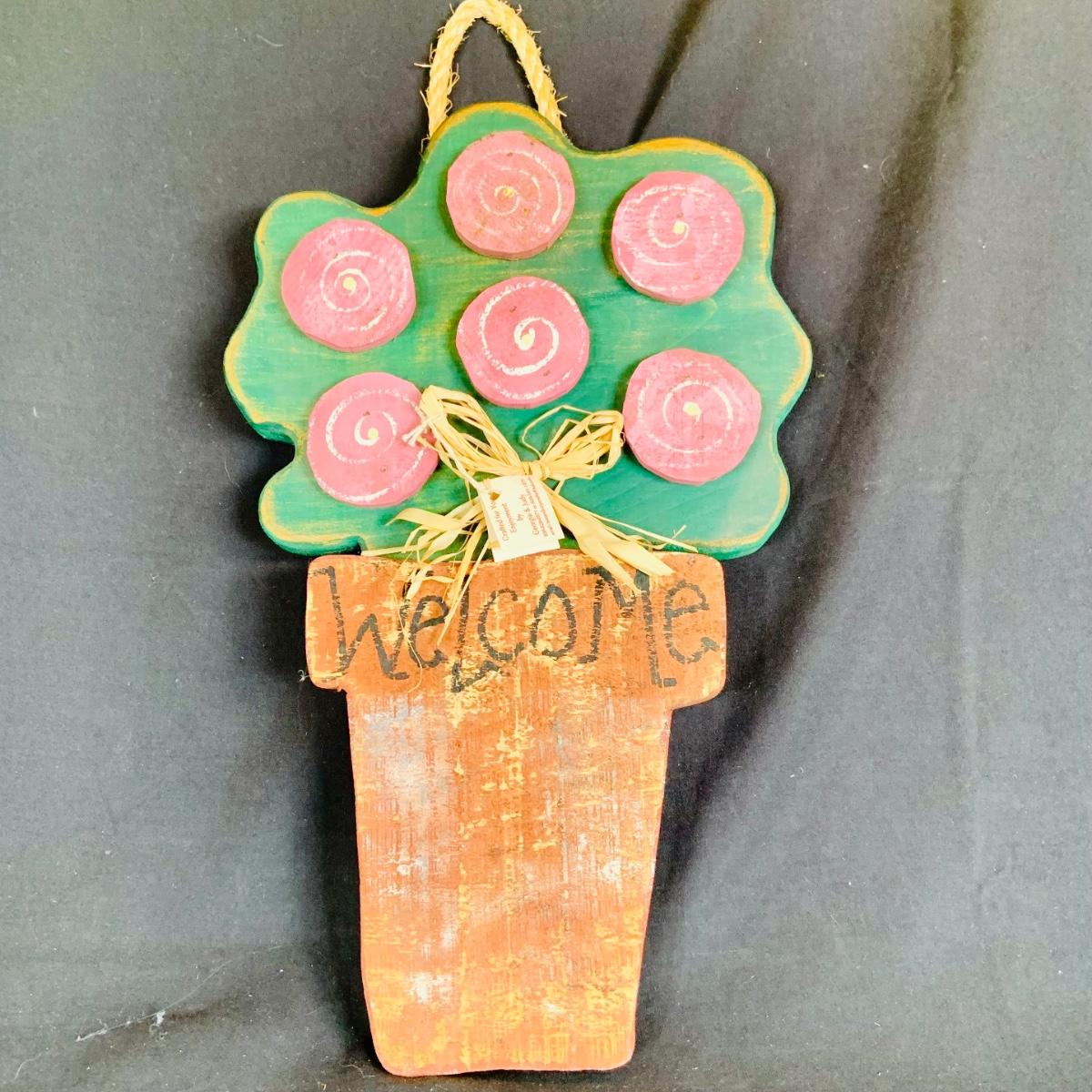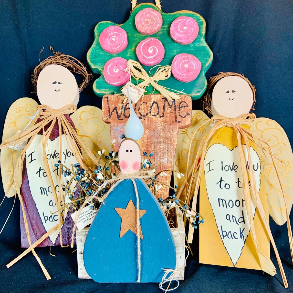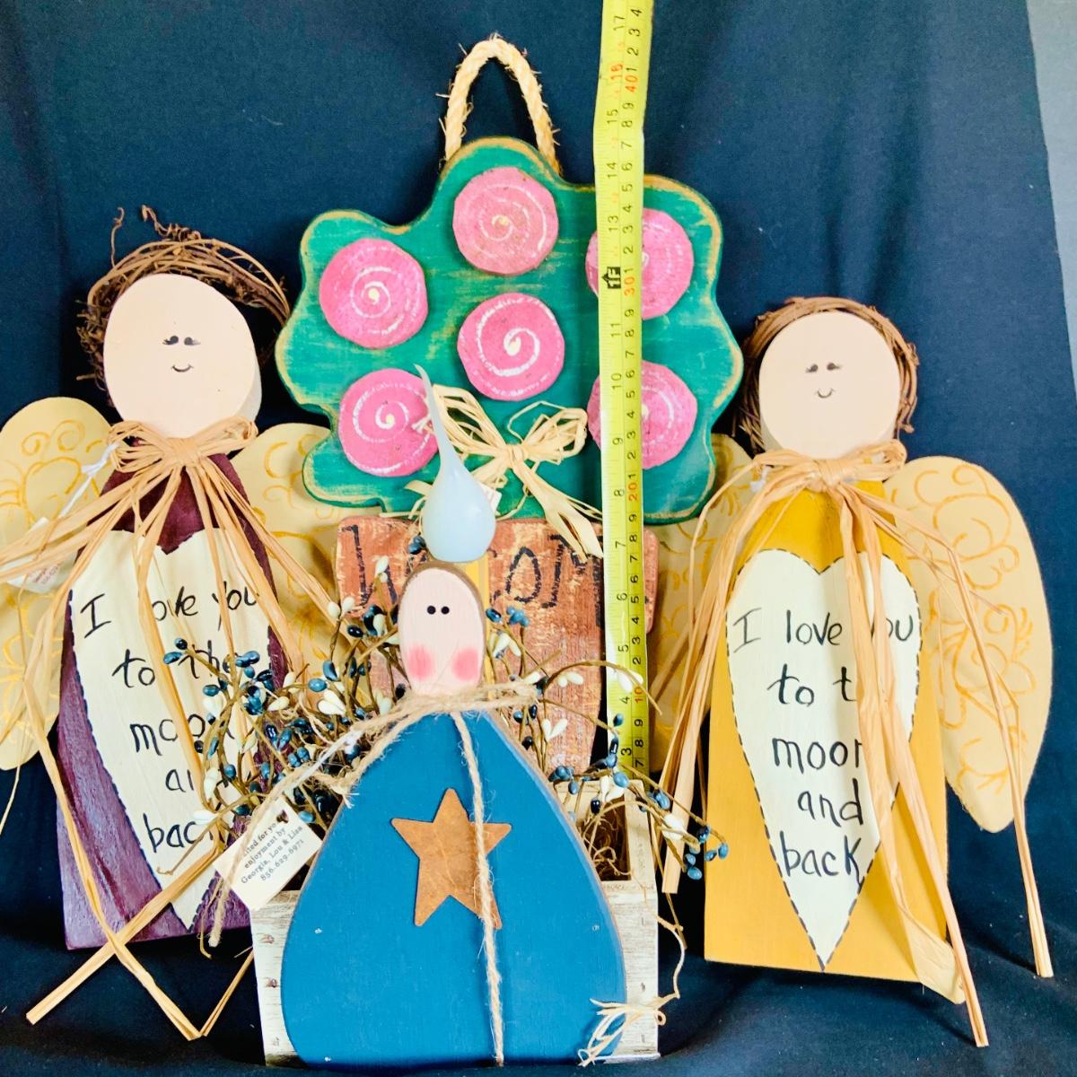 LOT:208: Rustic Wooden Home Decor - Angel Candle Stick Lamp, 2 Wooden Angel Plaques and a Welcome Potted Plant Sign