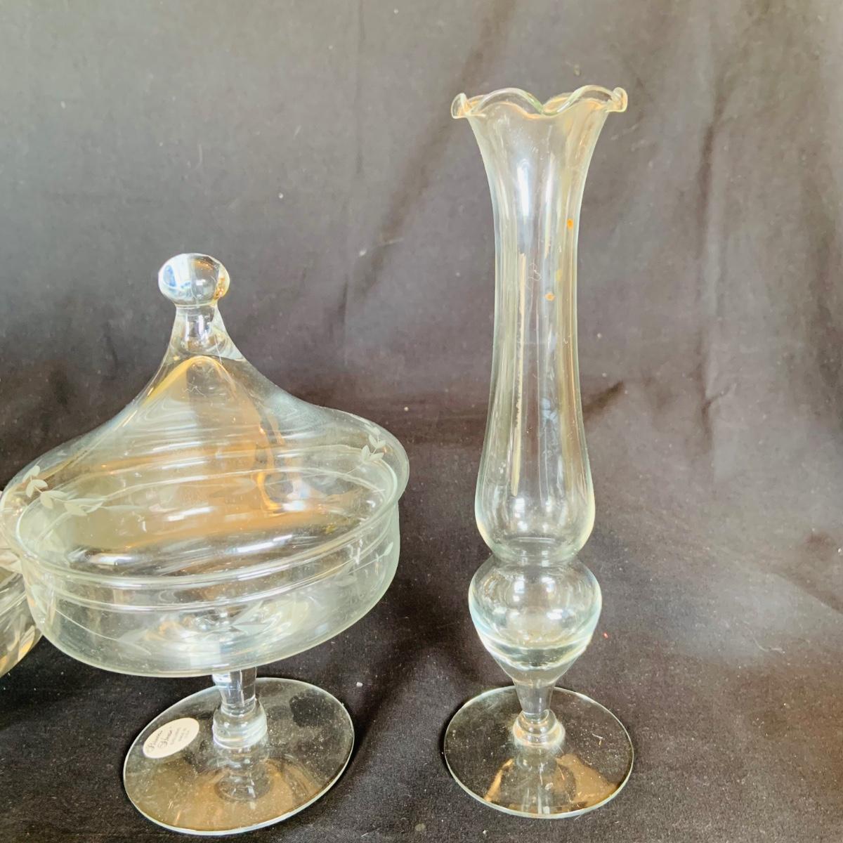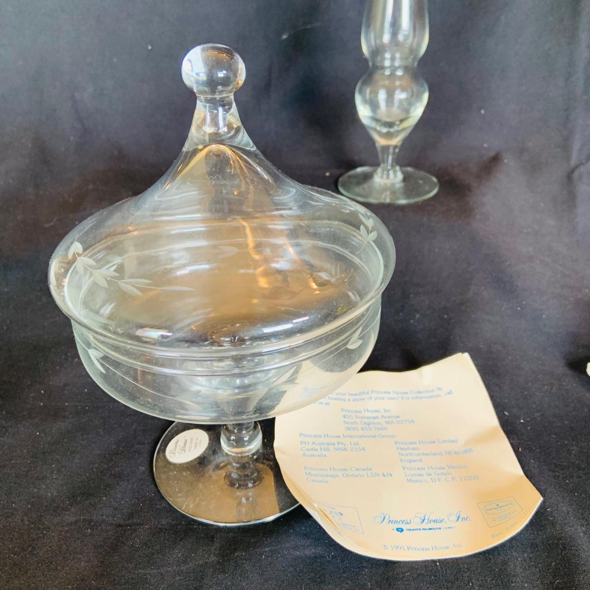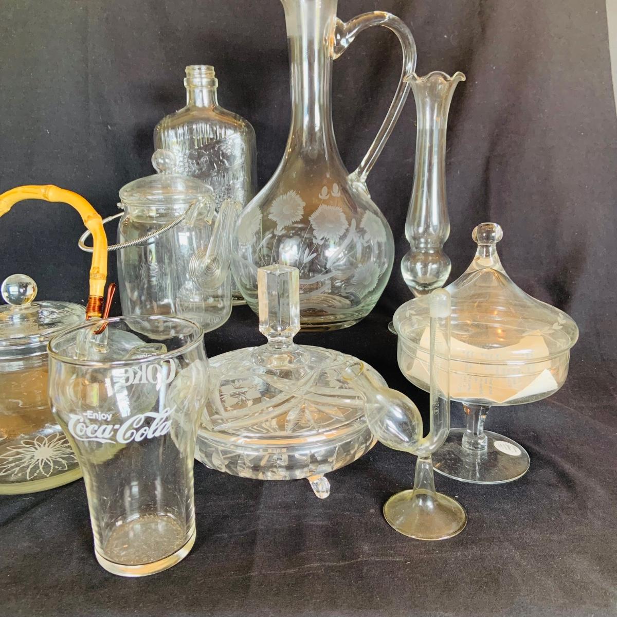 LOT:210: Coca-Cola Glass, Glass Tea and Coffee Pots, Princess House and Other Covered Candy Dish, Etch Glass Pitcher and More