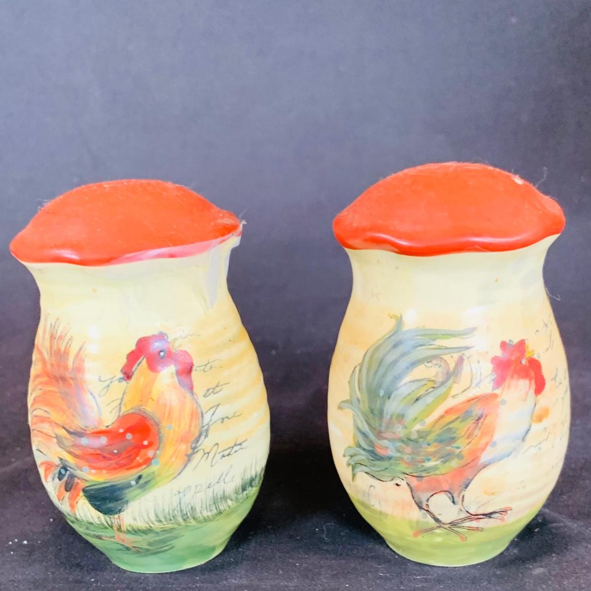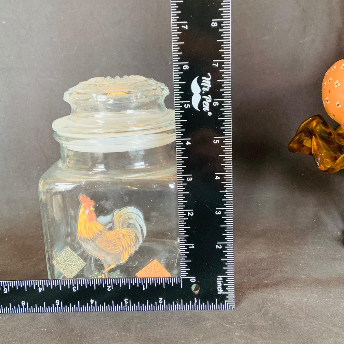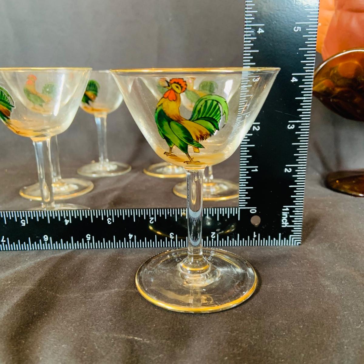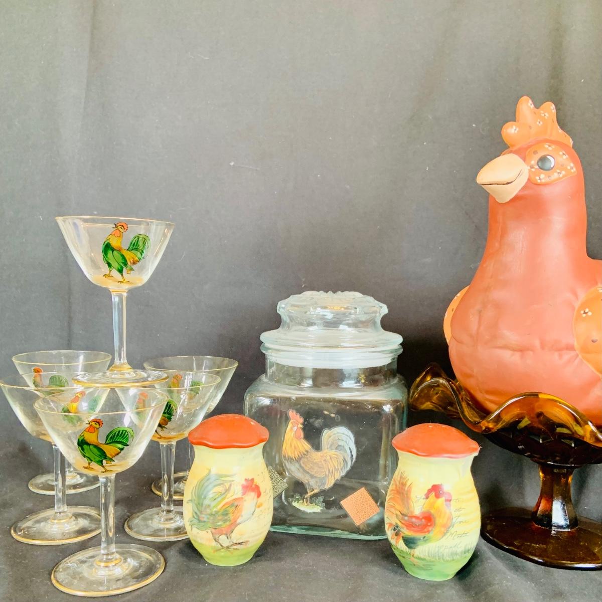 LOT:212: Hand Painted Rooster Glasses and Jar, Rooster Salt and Pepper Shakers, Ceramic Chicken and Amber Glass Candy Dish