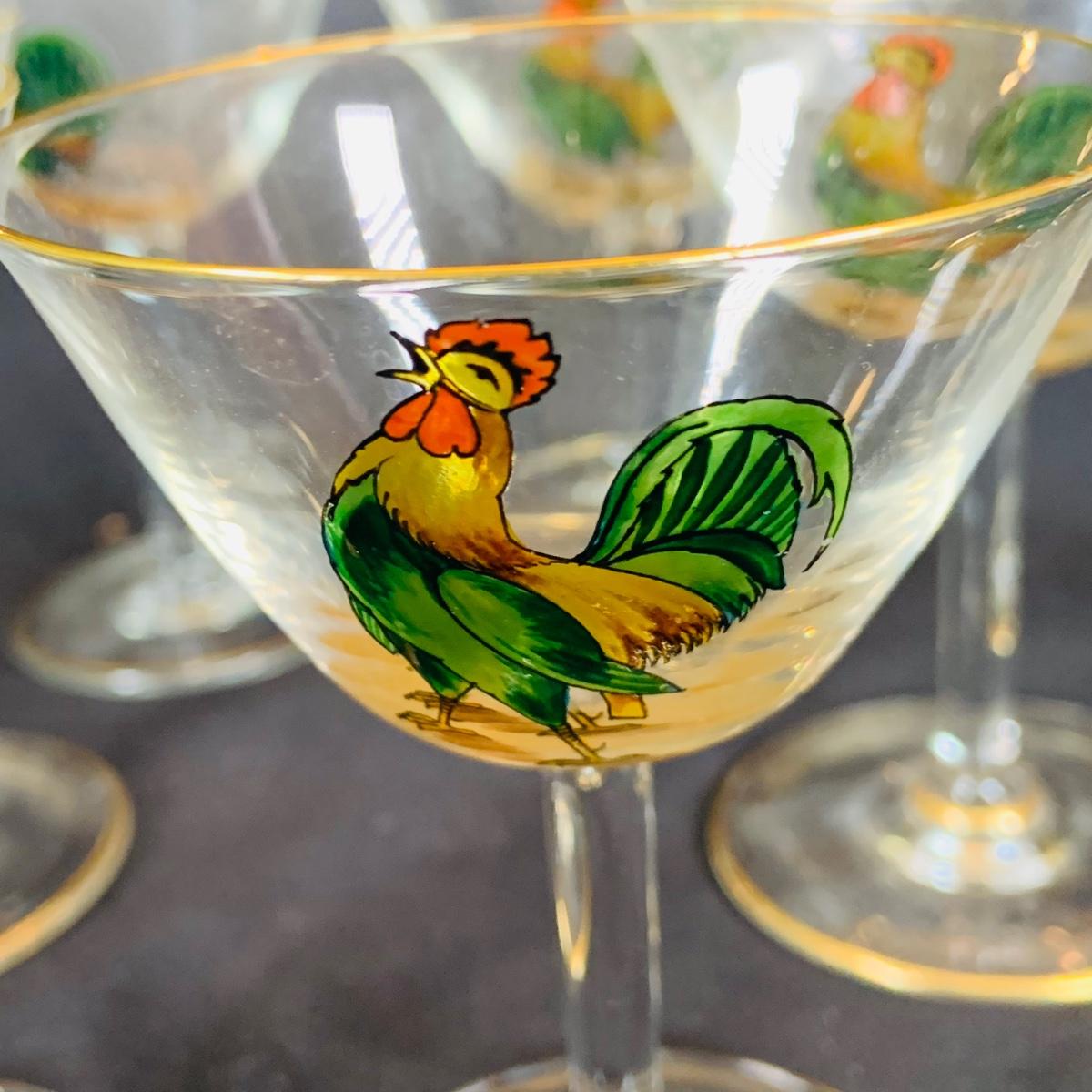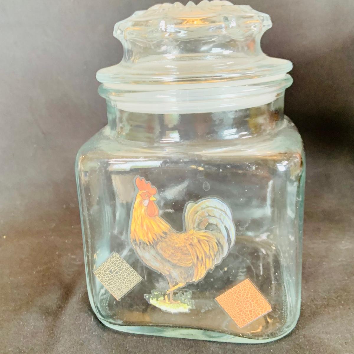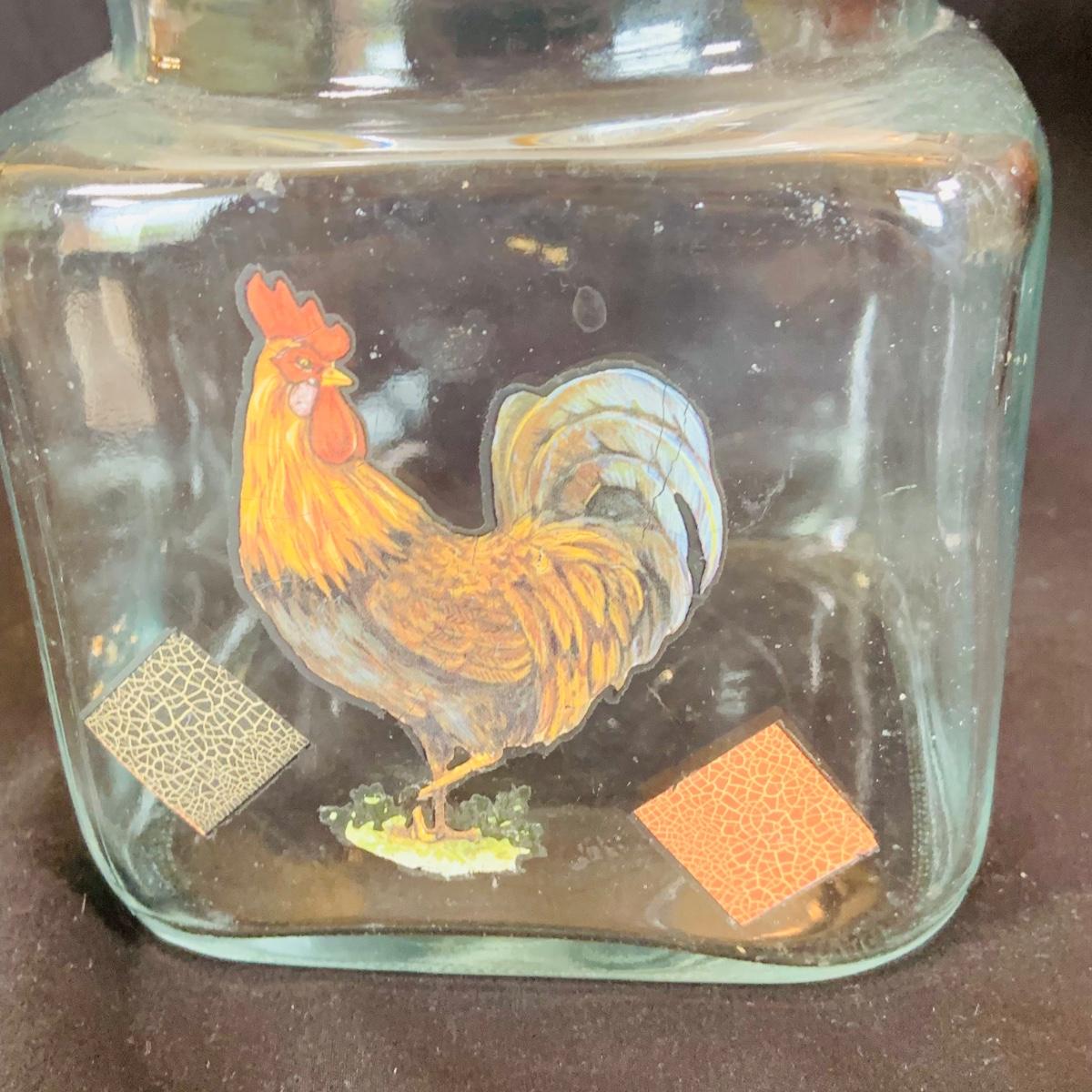 LOT:212: Hand Painted Rooster Glasses and Jar, Rooster Salt and Pepper Shakers, Ceramic Chicken and Amber Glass Candy Dish