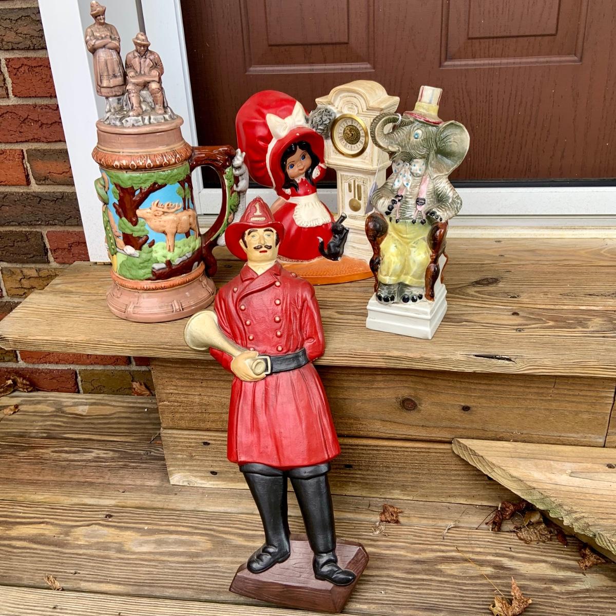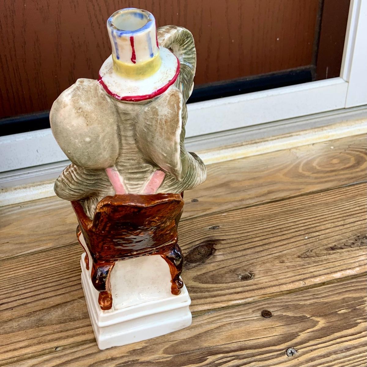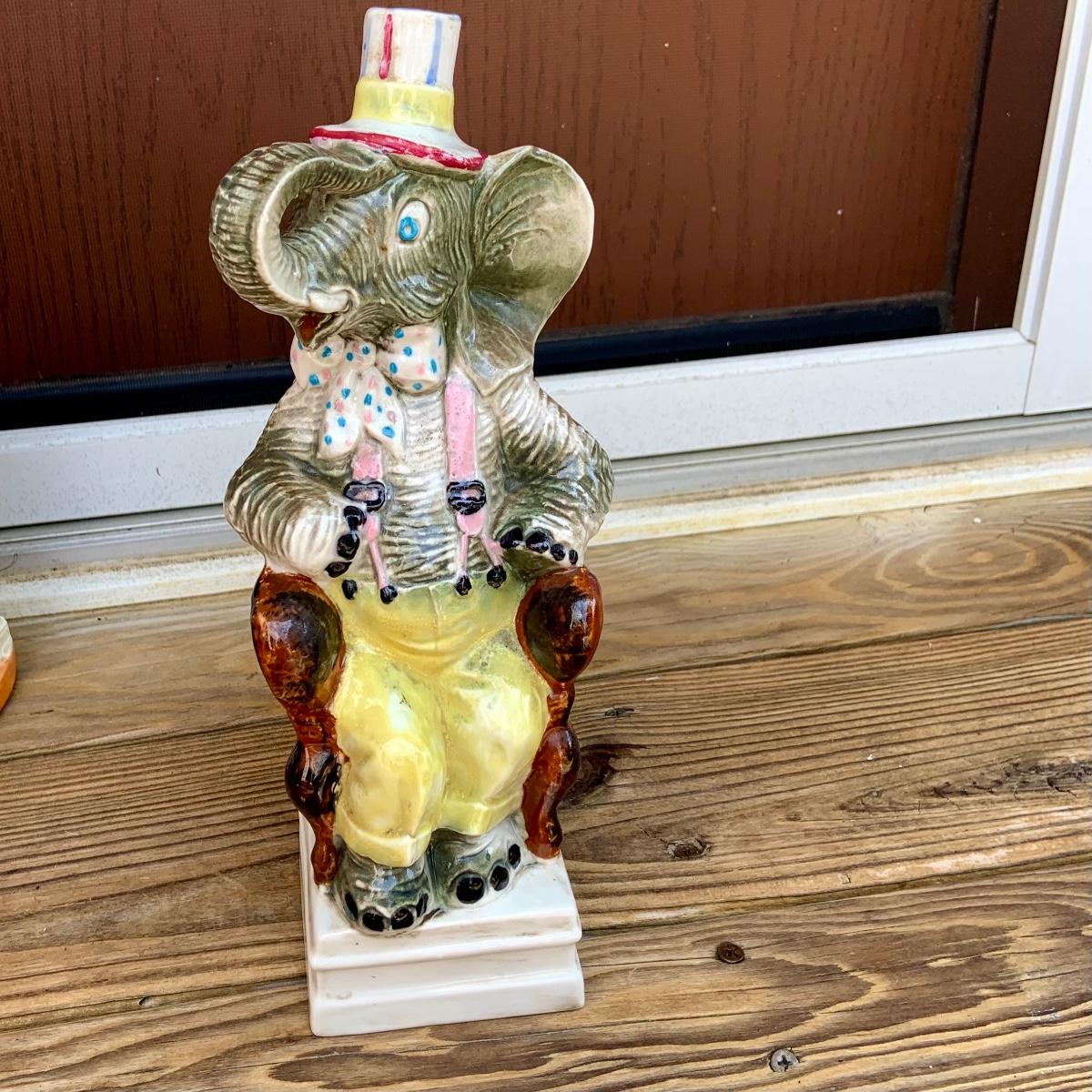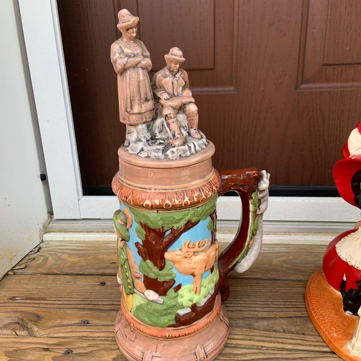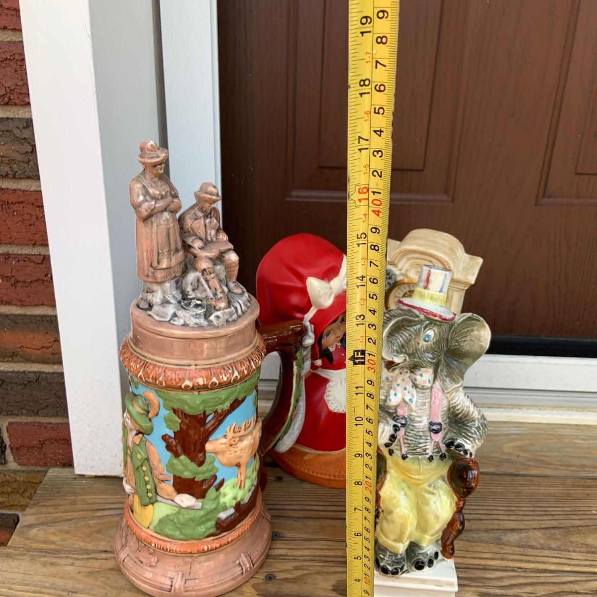 LOT:227: Vintage Chalkware Firefighter Wall Art, Large Ceramic Beer Stein, Ceramic Mold Working Clock with Girl and Cat, and Elephant Decanter