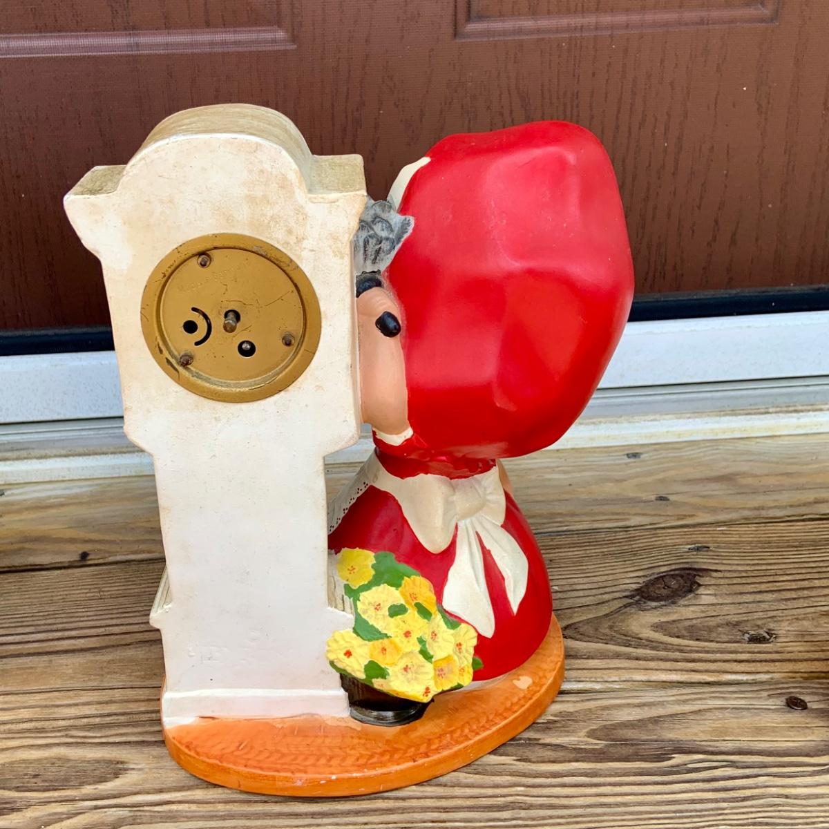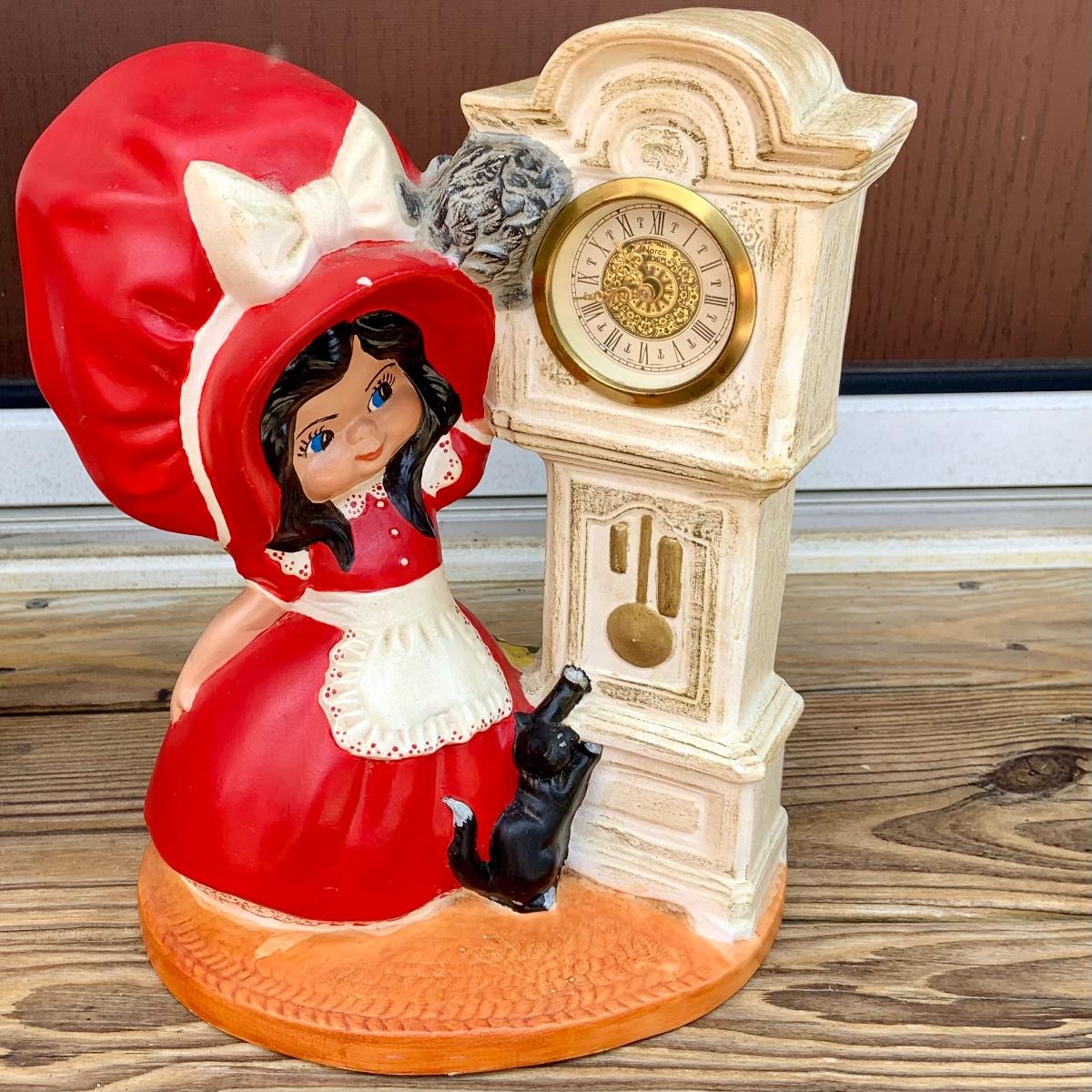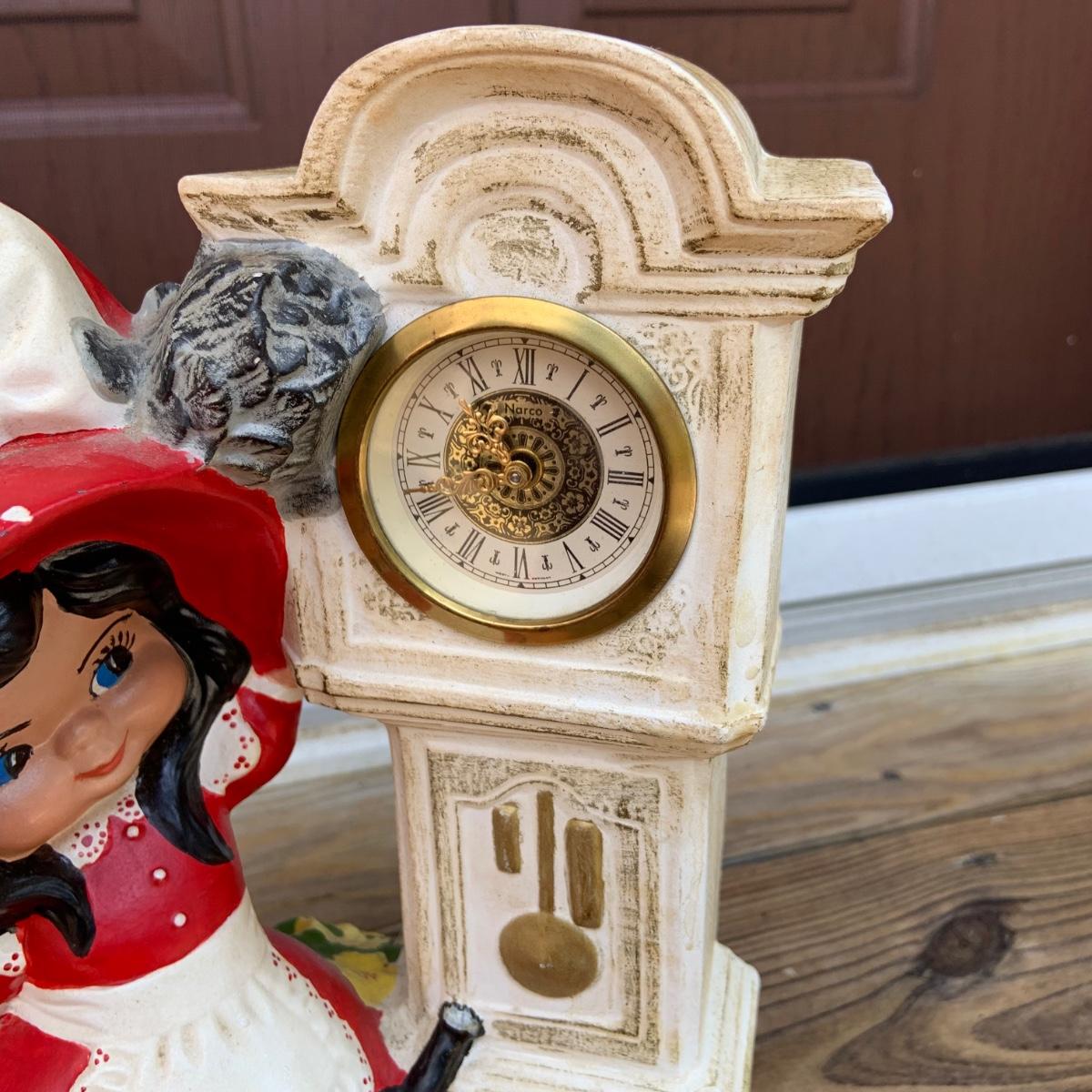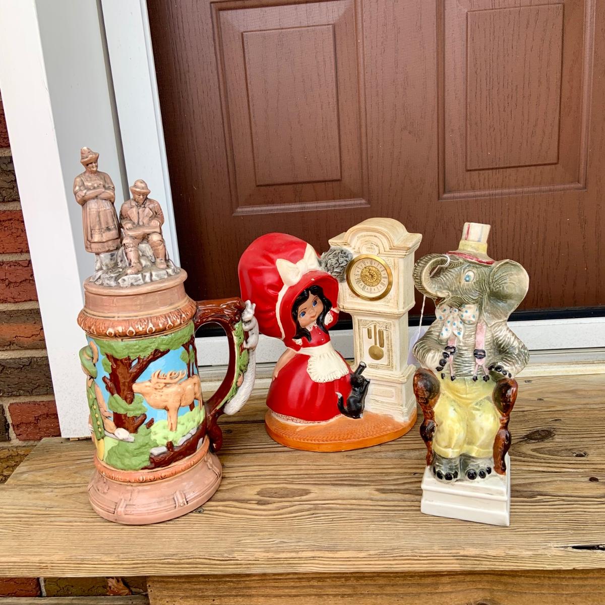 LOT:227: Vintage Chalkware Firefighter Wall Art, Large Ceramic Beer Stein, Ceramic Mold Working Clock with Girl and Cat, and Elephant Decanter