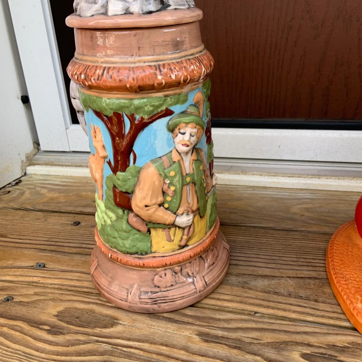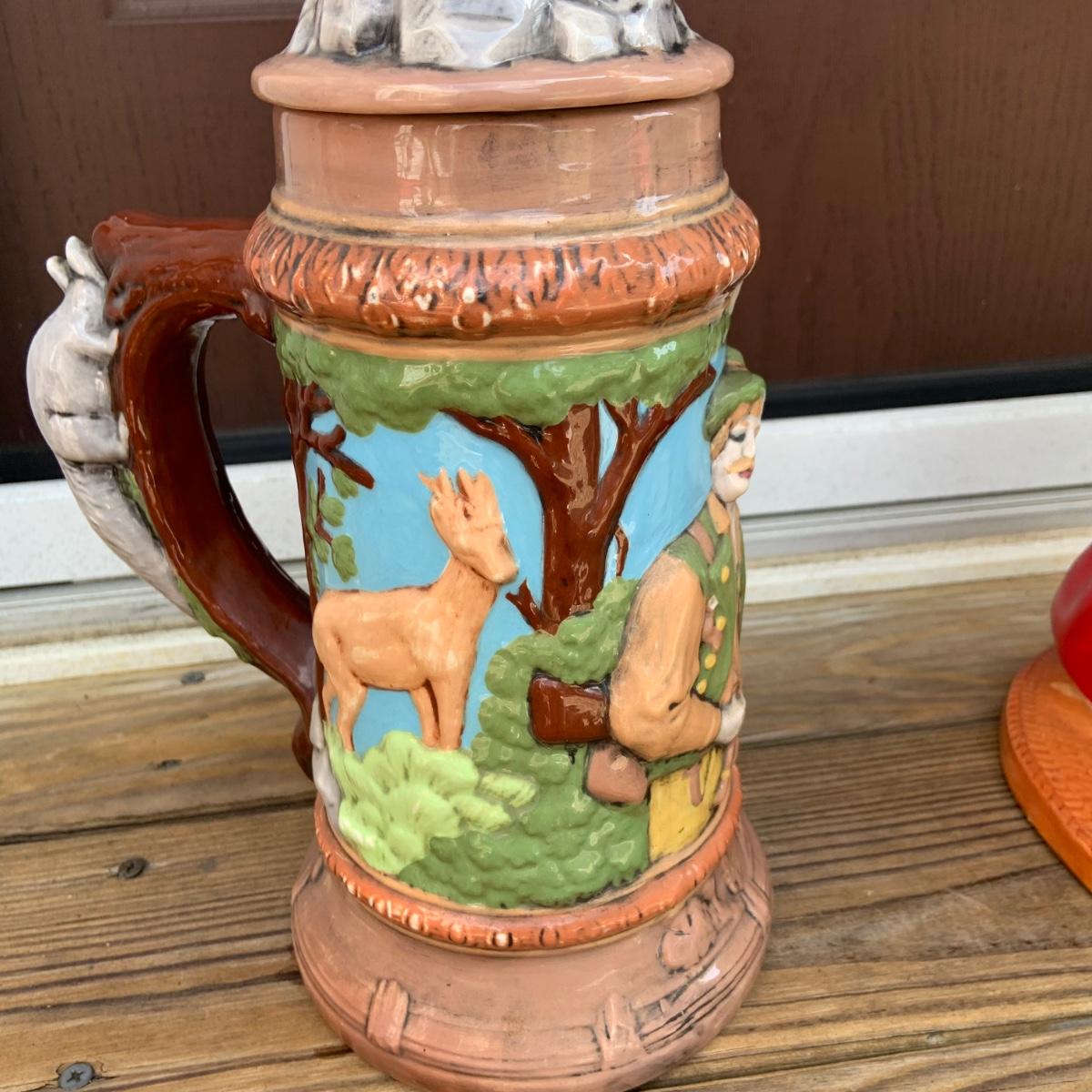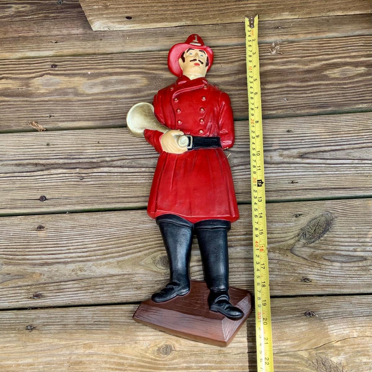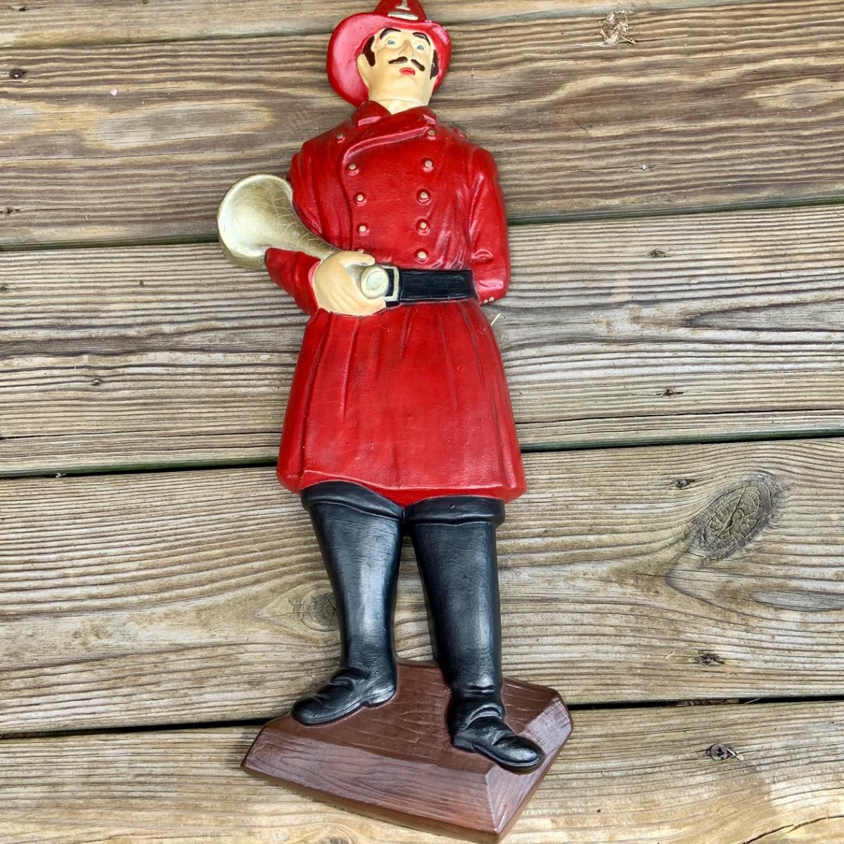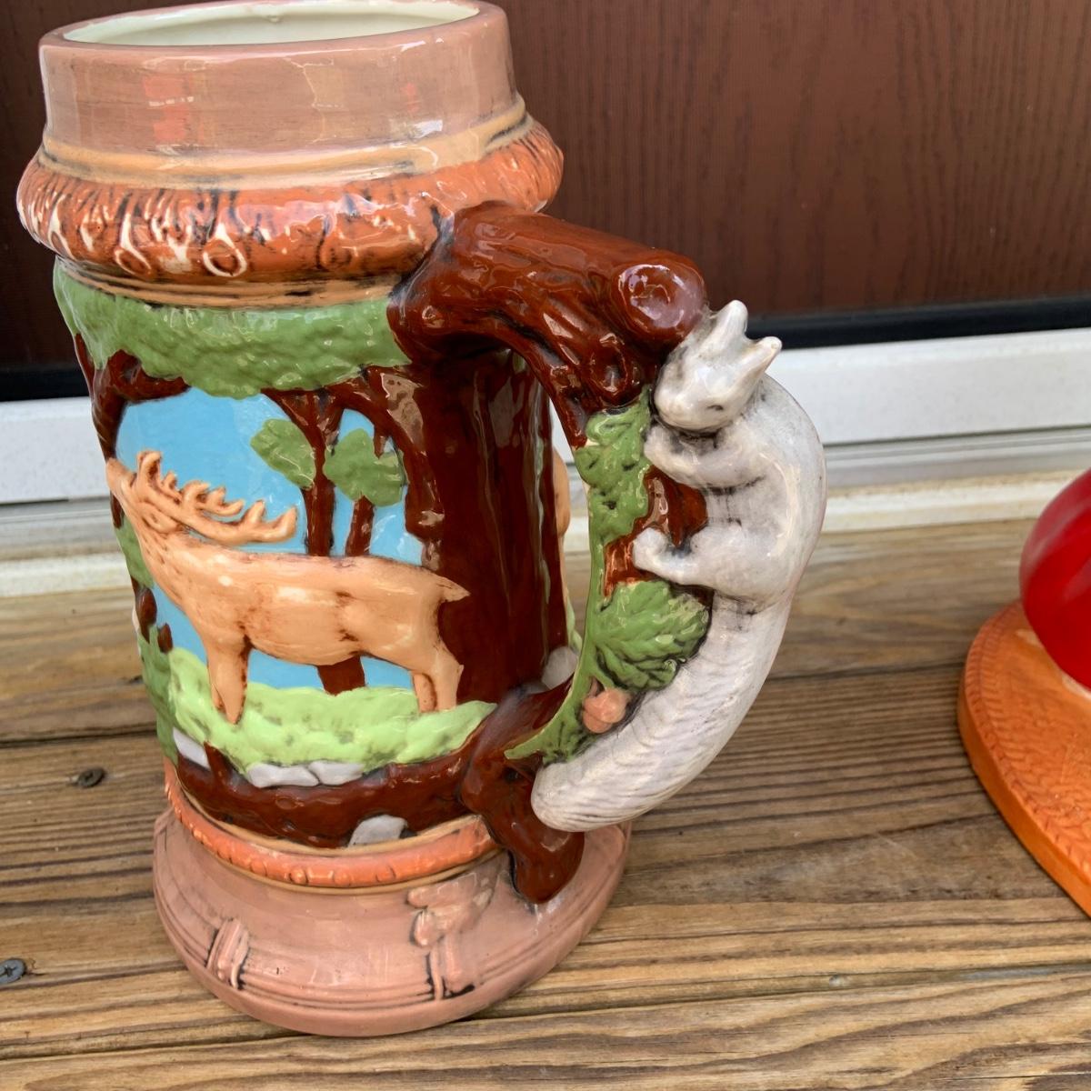 LOT:227: Vintage Chalkware Firefighter Wall Art, Large Ceramic Beer Stein, Ceramic Mold Working Clock with Girl and Cat, and Elephant Decanter