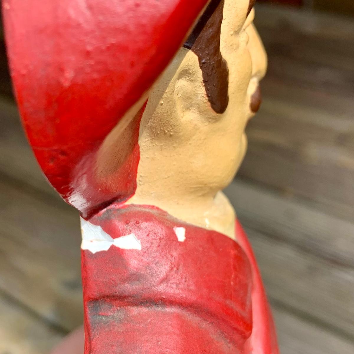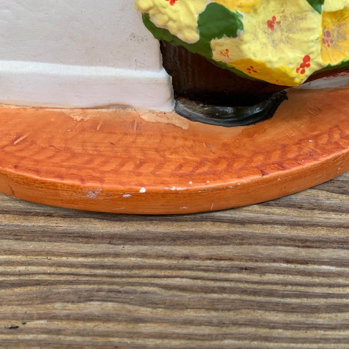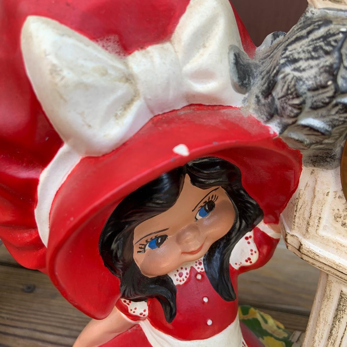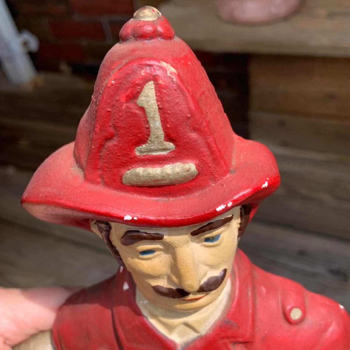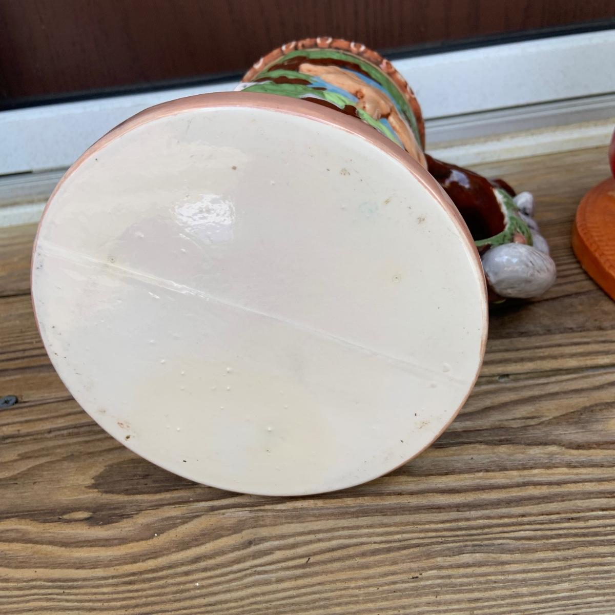 LOT:227: Vintage Chalkware Firefighter Wall Art, Large Ceramic Beer Stein, Ceramic Mold Working Clock with Girl and Cat, and Elephant Decanter
