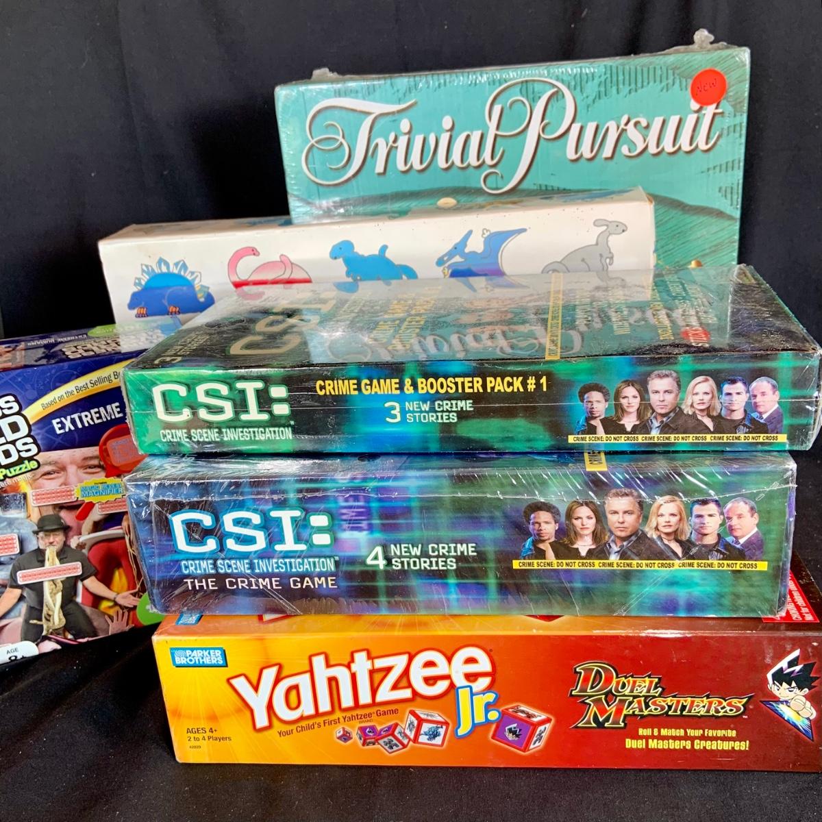 LOT:231: Assortment of Board Games, Puzzle and More Including Dual Master Yahtzee Jr., CSI Game, Trivial Pursuit and Guinness Puzzle Some are New