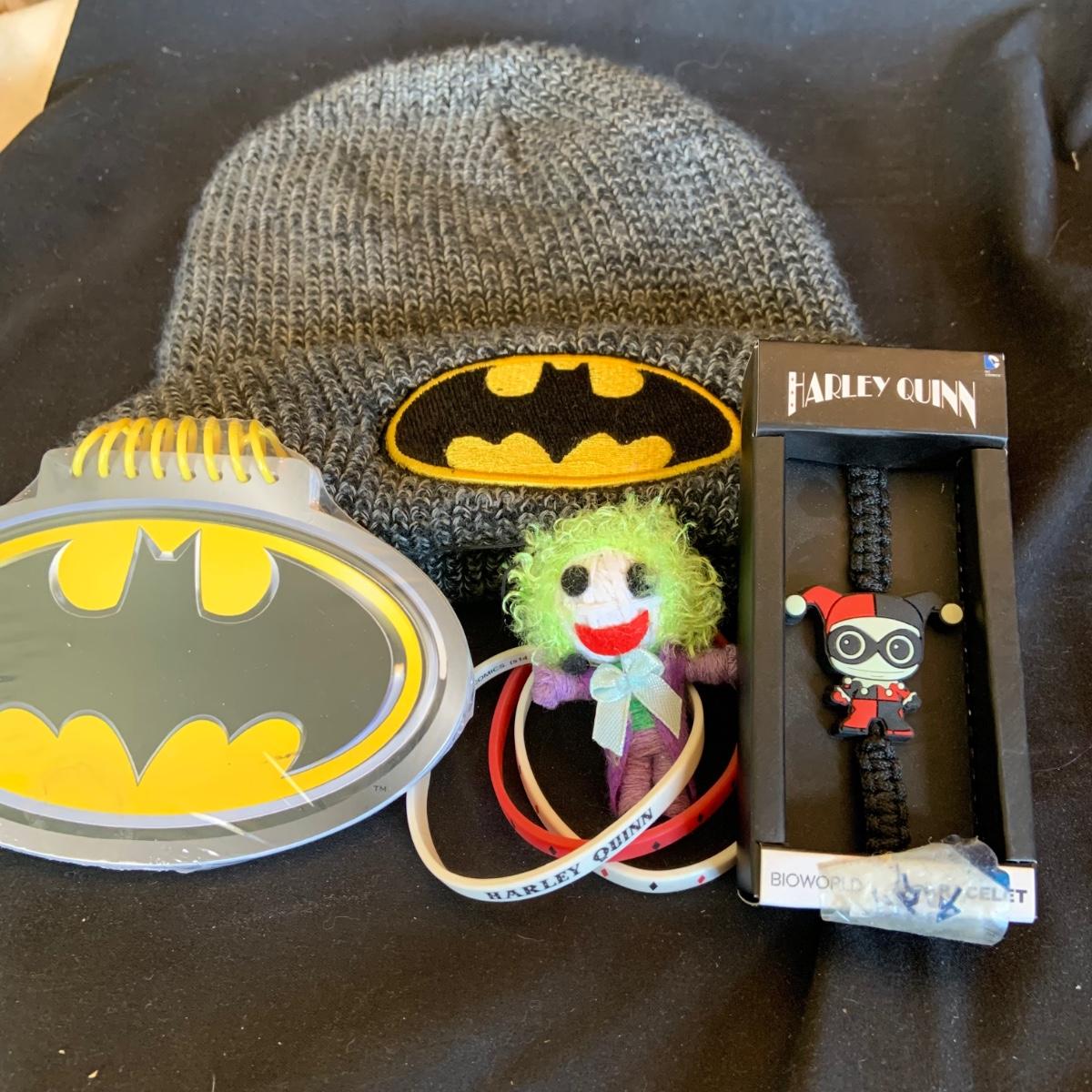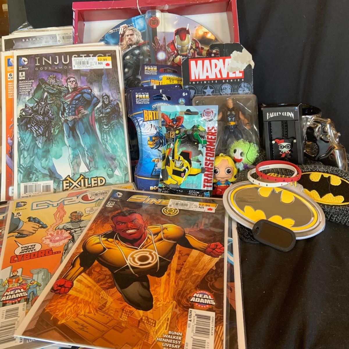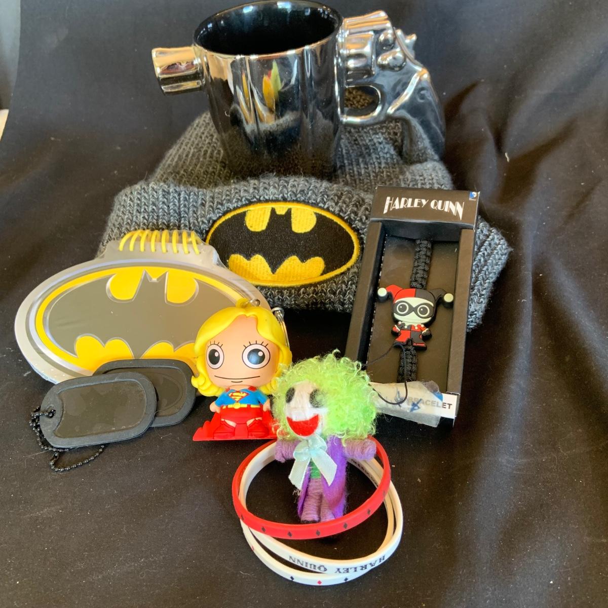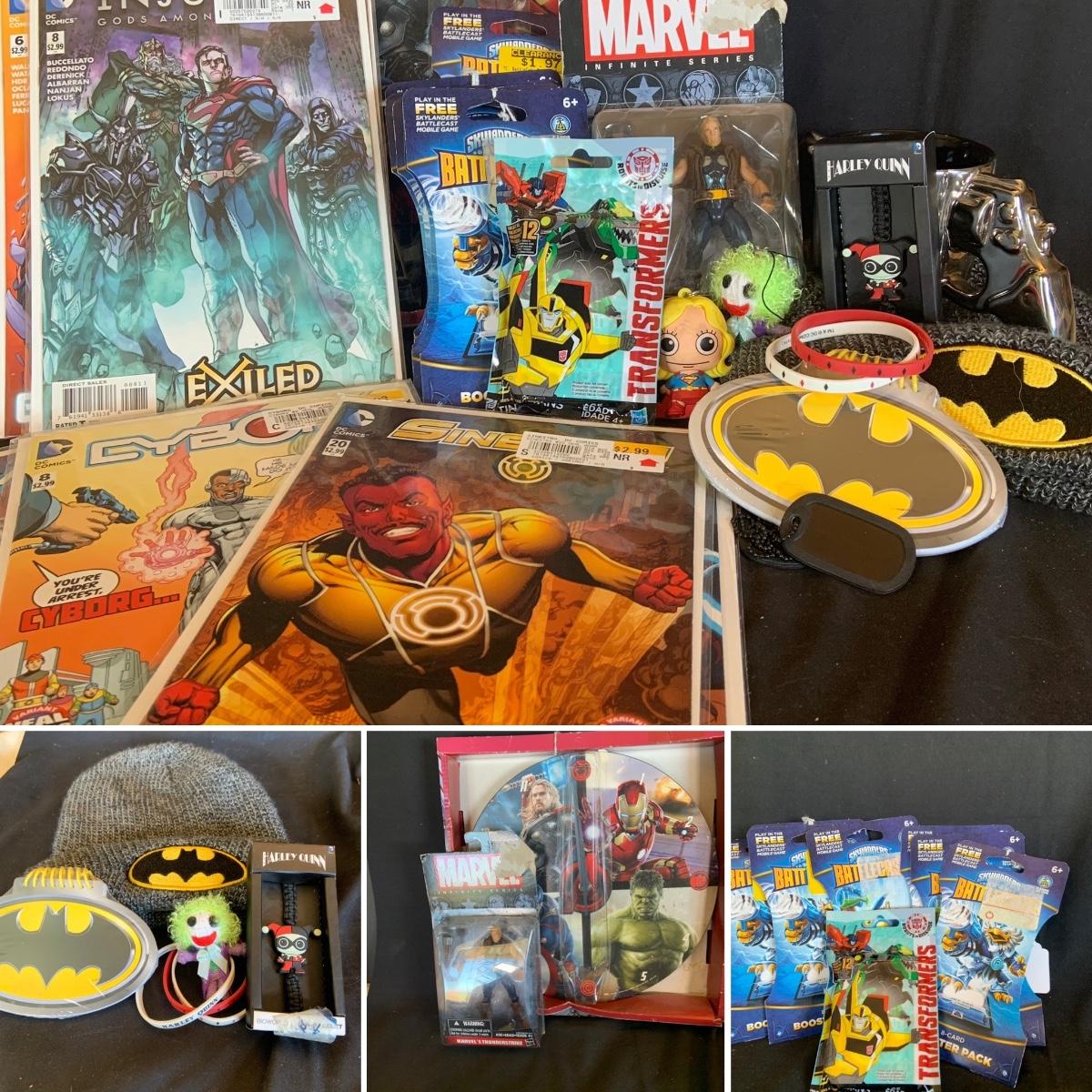 LOT:236: Marvel and DC Comic Collection Including Comics, Batman Hat and Dog Tags, Harley Quinn Braclets, Skylanders Battlecasters and More