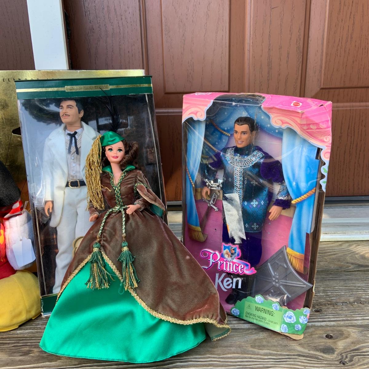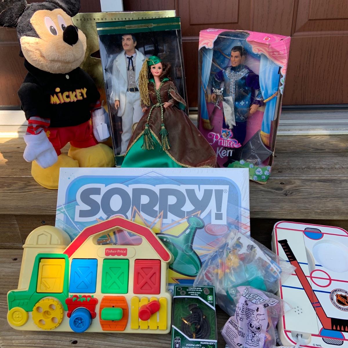 LOT:240: Assorted Collection of Toys, Games Dolls and More Including Going with the Wind Barbie, Prince Ken, Walking Mickey , Sorry Board Game, Fisher Price Busy Toy, Hockey Phone and More