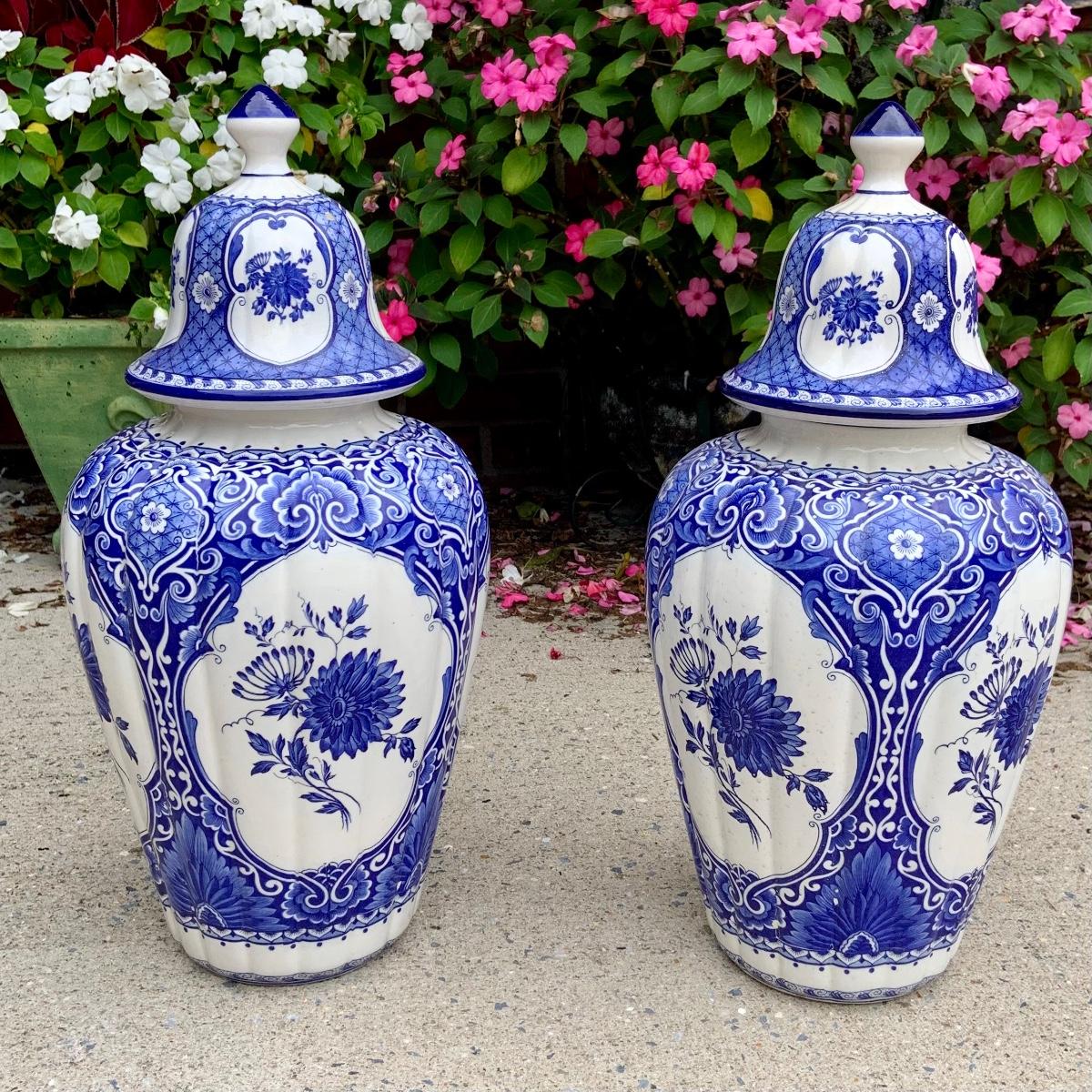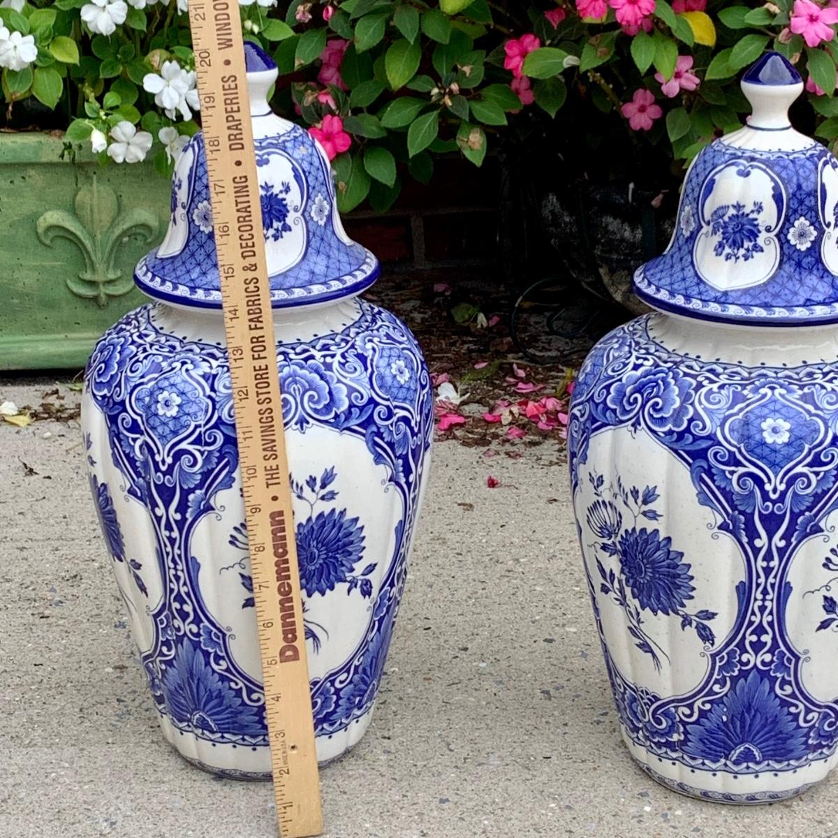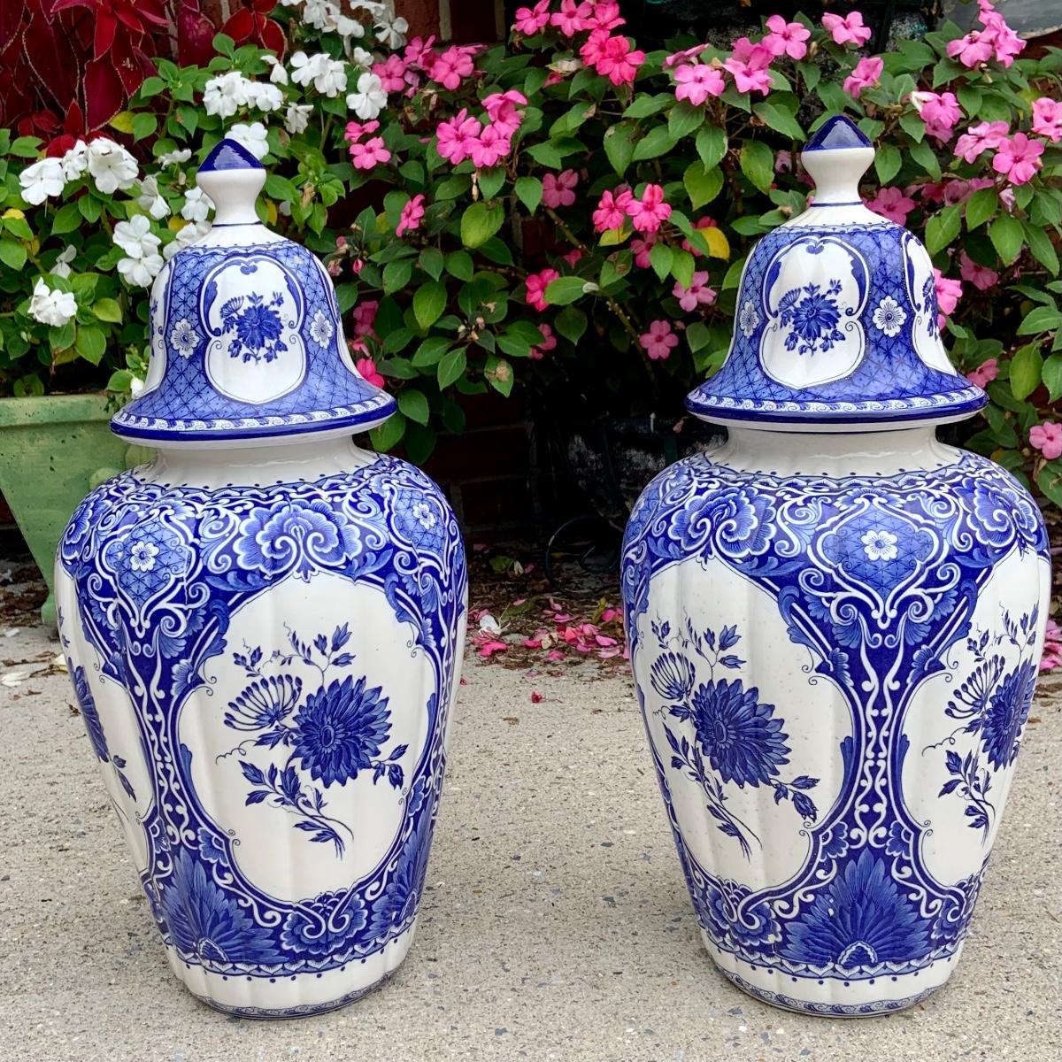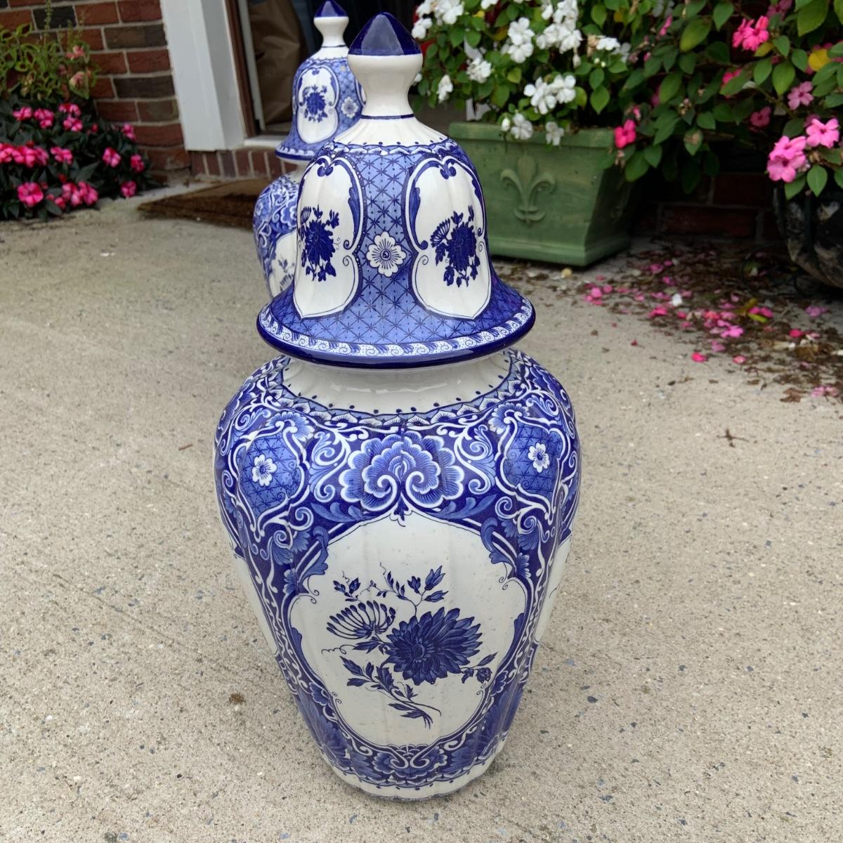 LOT:258: A Set of 2 Very Large and Beautiful Blue and White Lidded Vases / Urn In the Style of Delft but Only Marked Holland