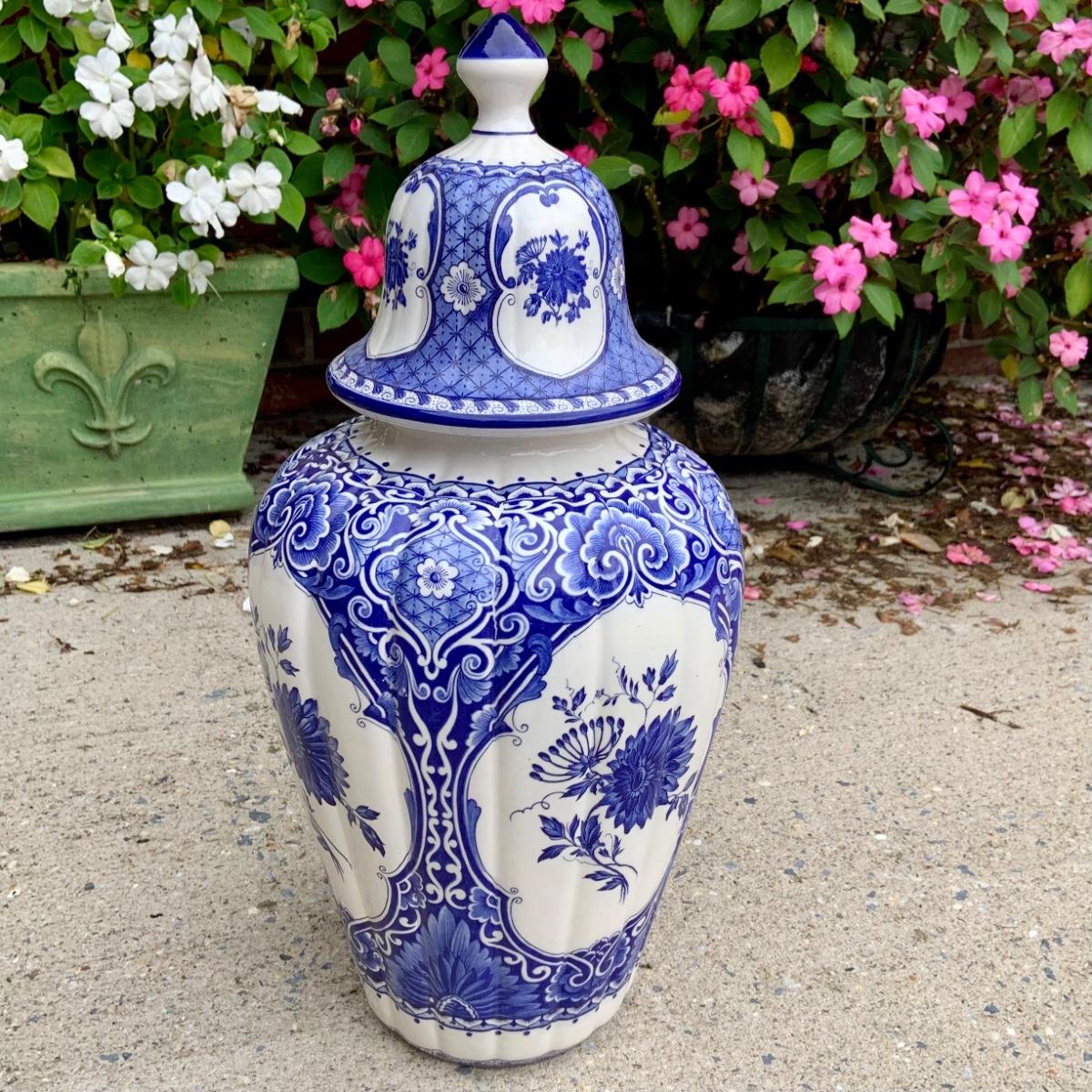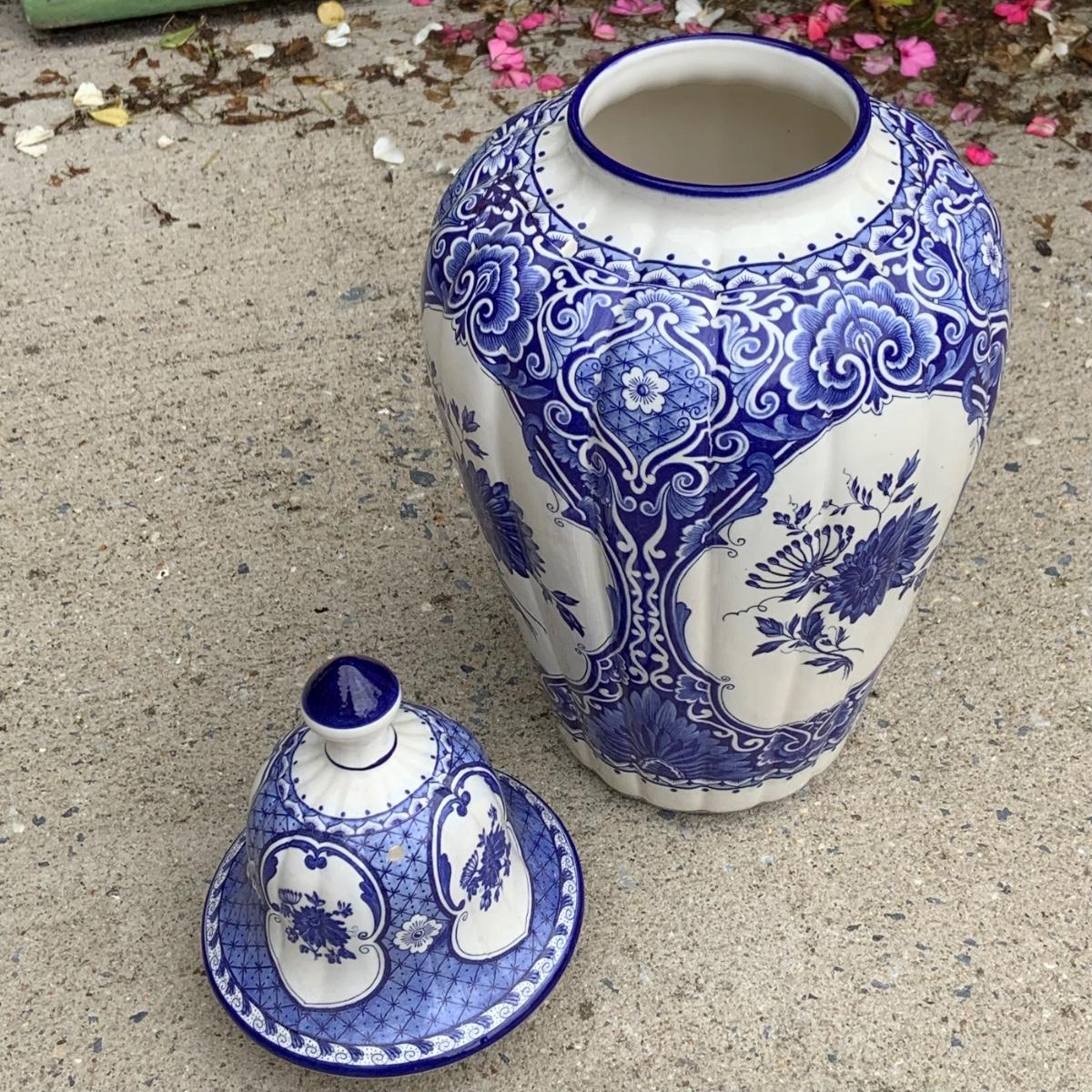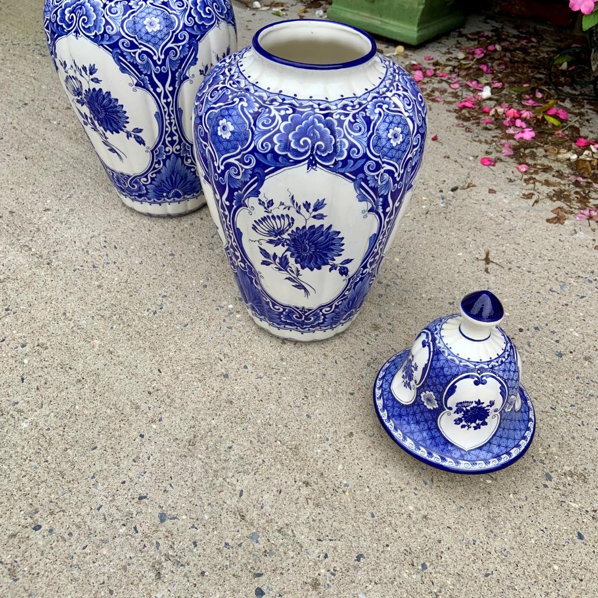 LOT:258: A Set of 2 Very Large and Beautiful Blue and White Lidded Vases / Urn In the Style of Delft but Only Marked Holland