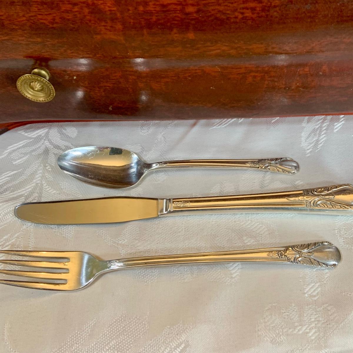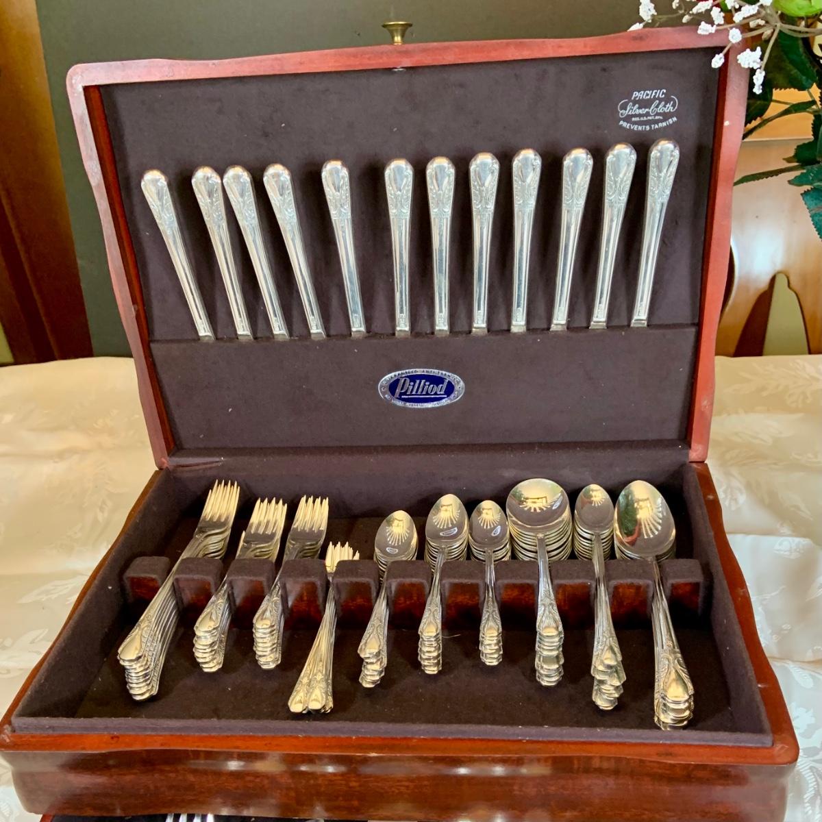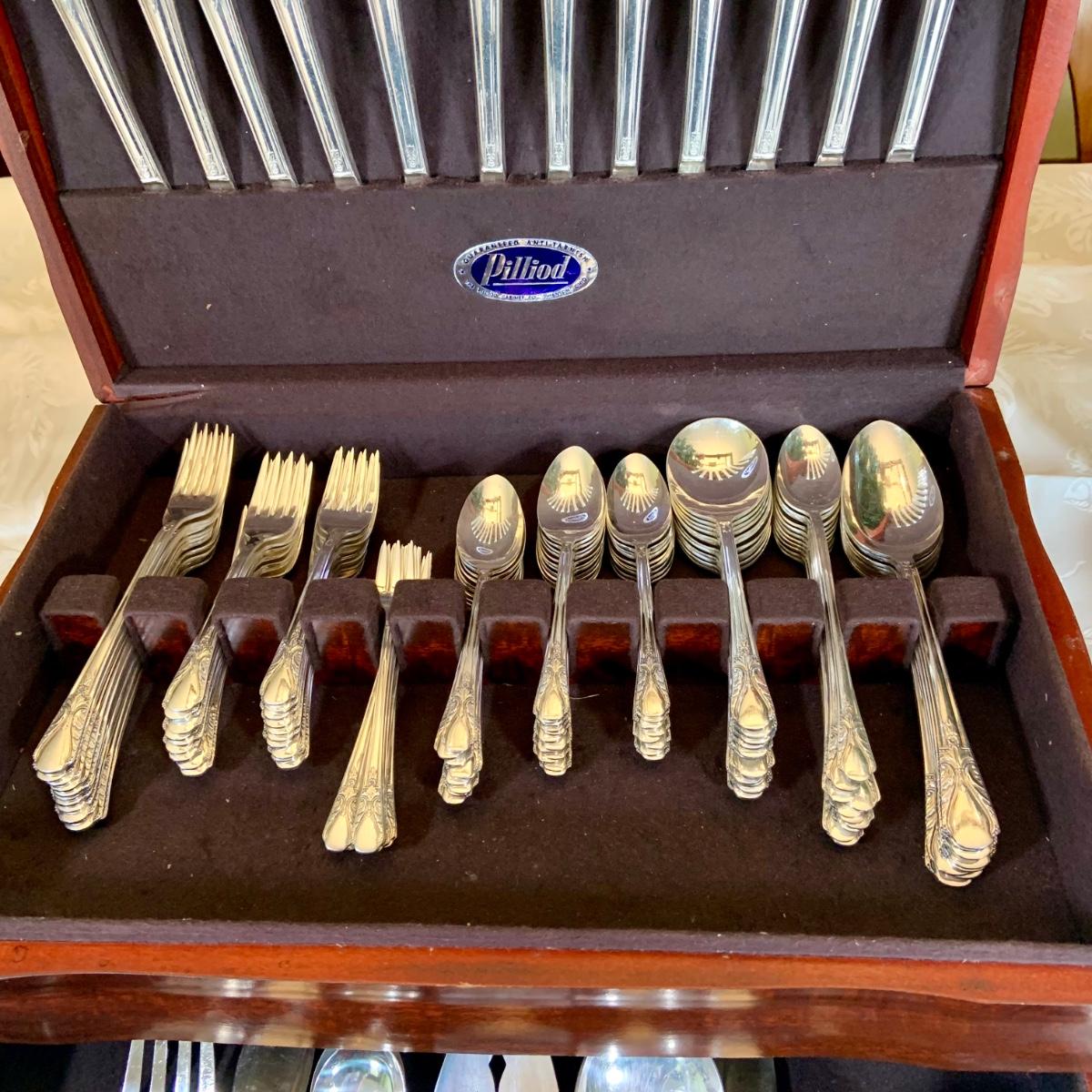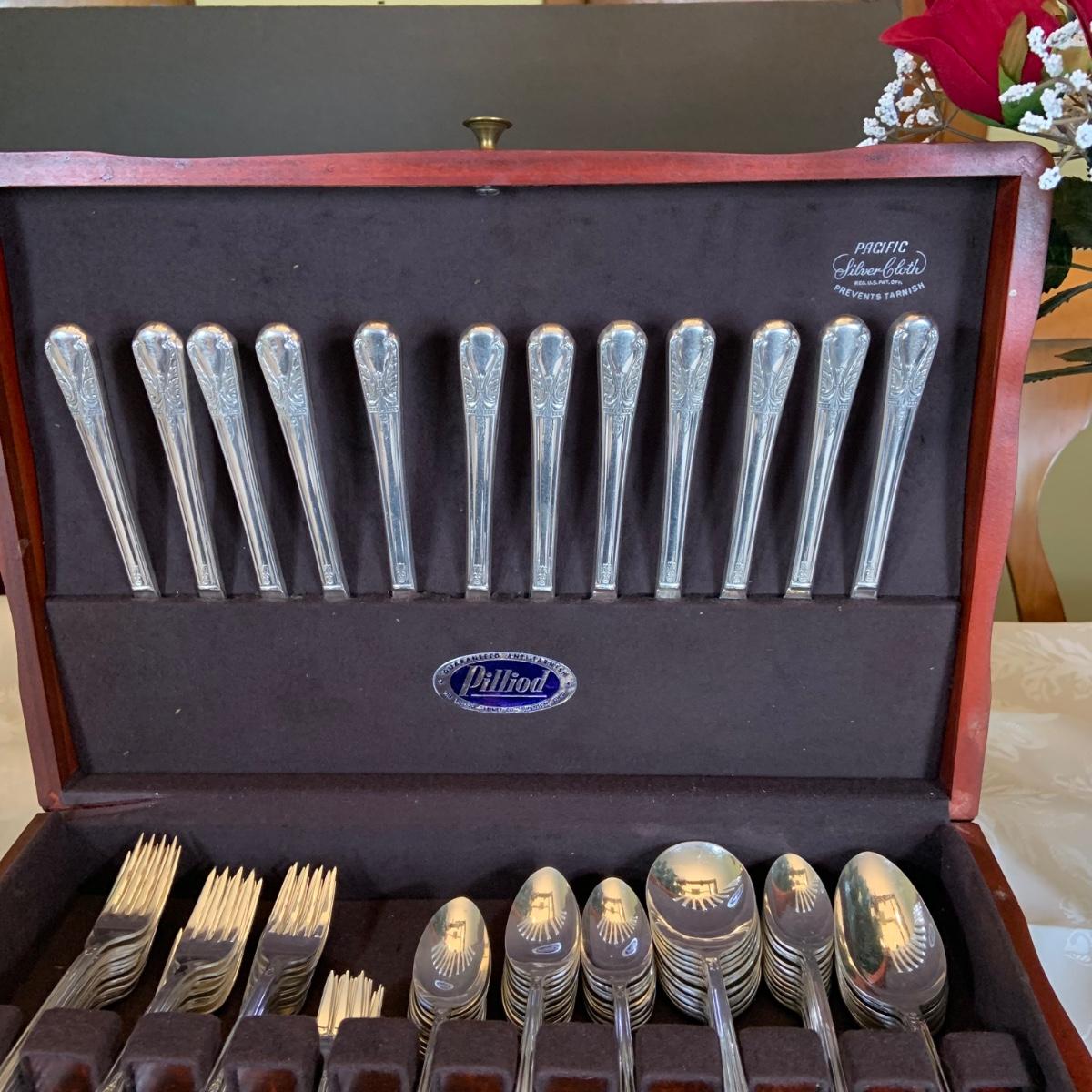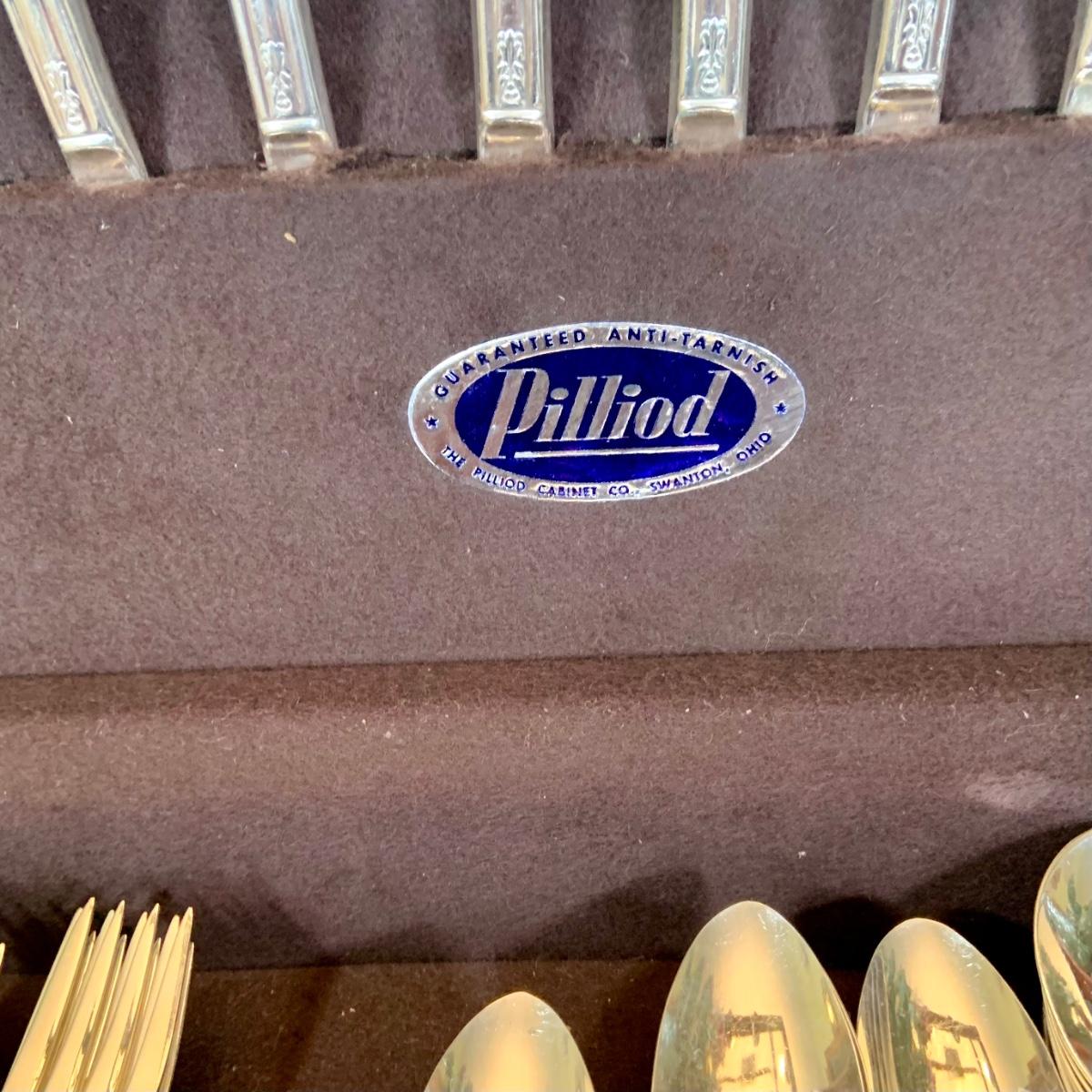 LOT:264: Vintage Pilliod Siverware Chest with Stainless WM Rogers Silver Flatware Set and Serving Set for a Total of 130 Pieces