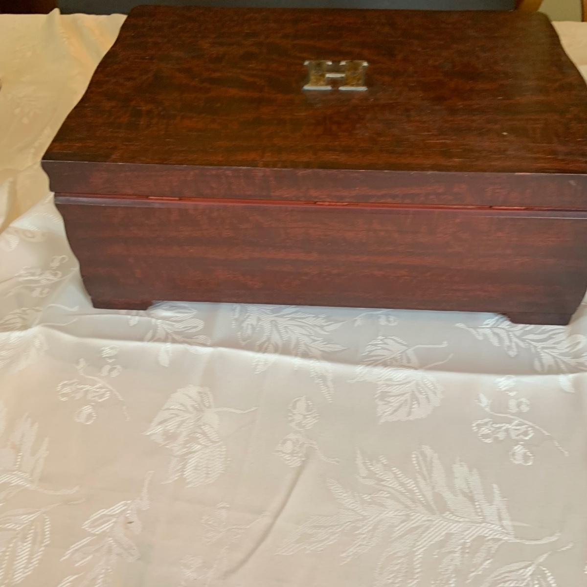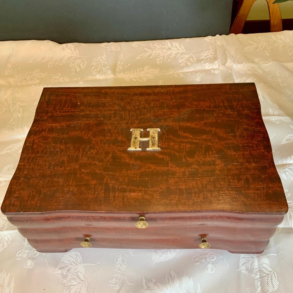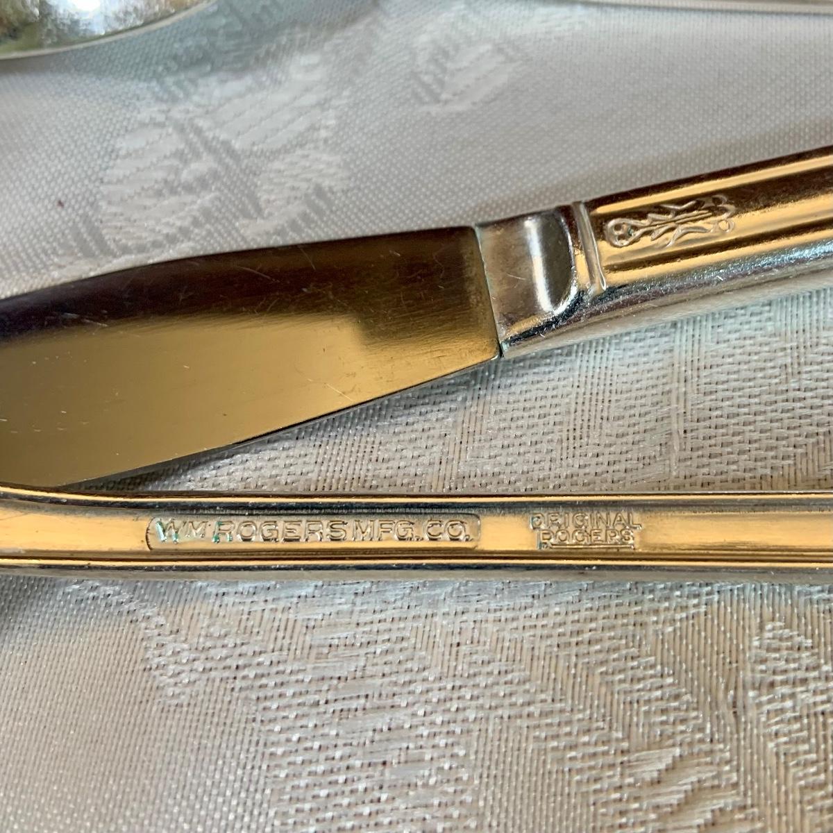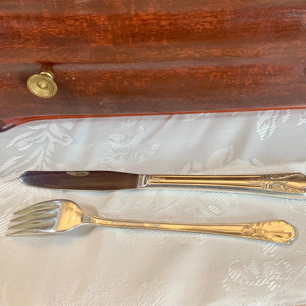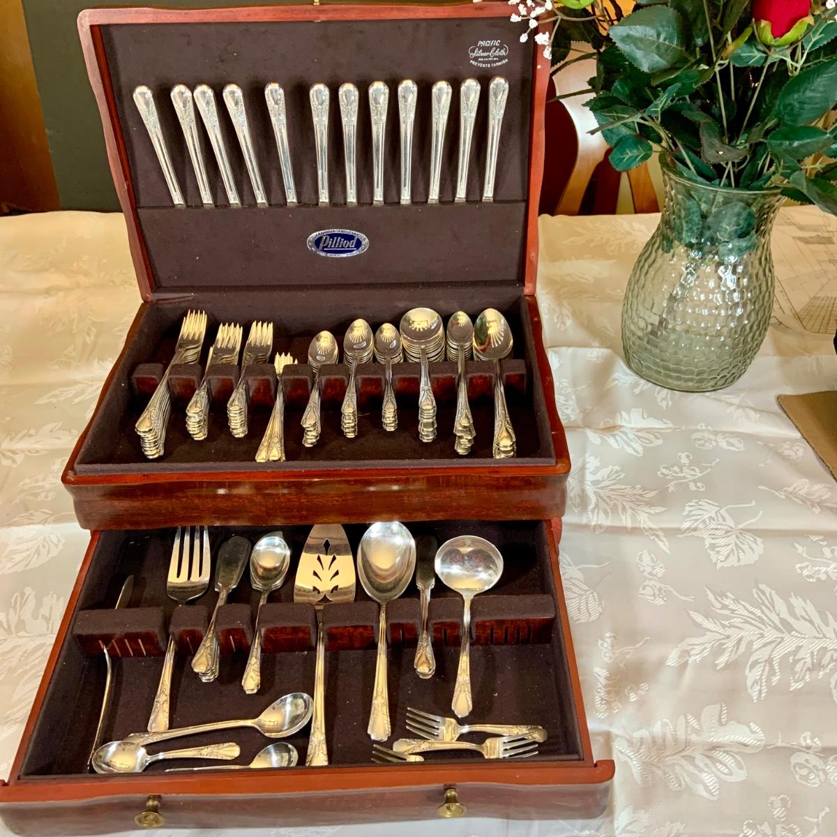 LOT:264: Vintage Pilliod Siverware Chest with Stainless WM Rogers Silver Flatware Set and Serving Set for a Total of 130 Pieces