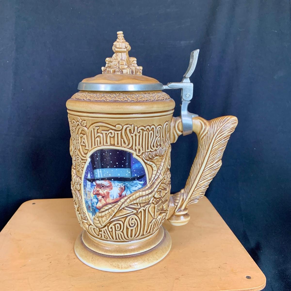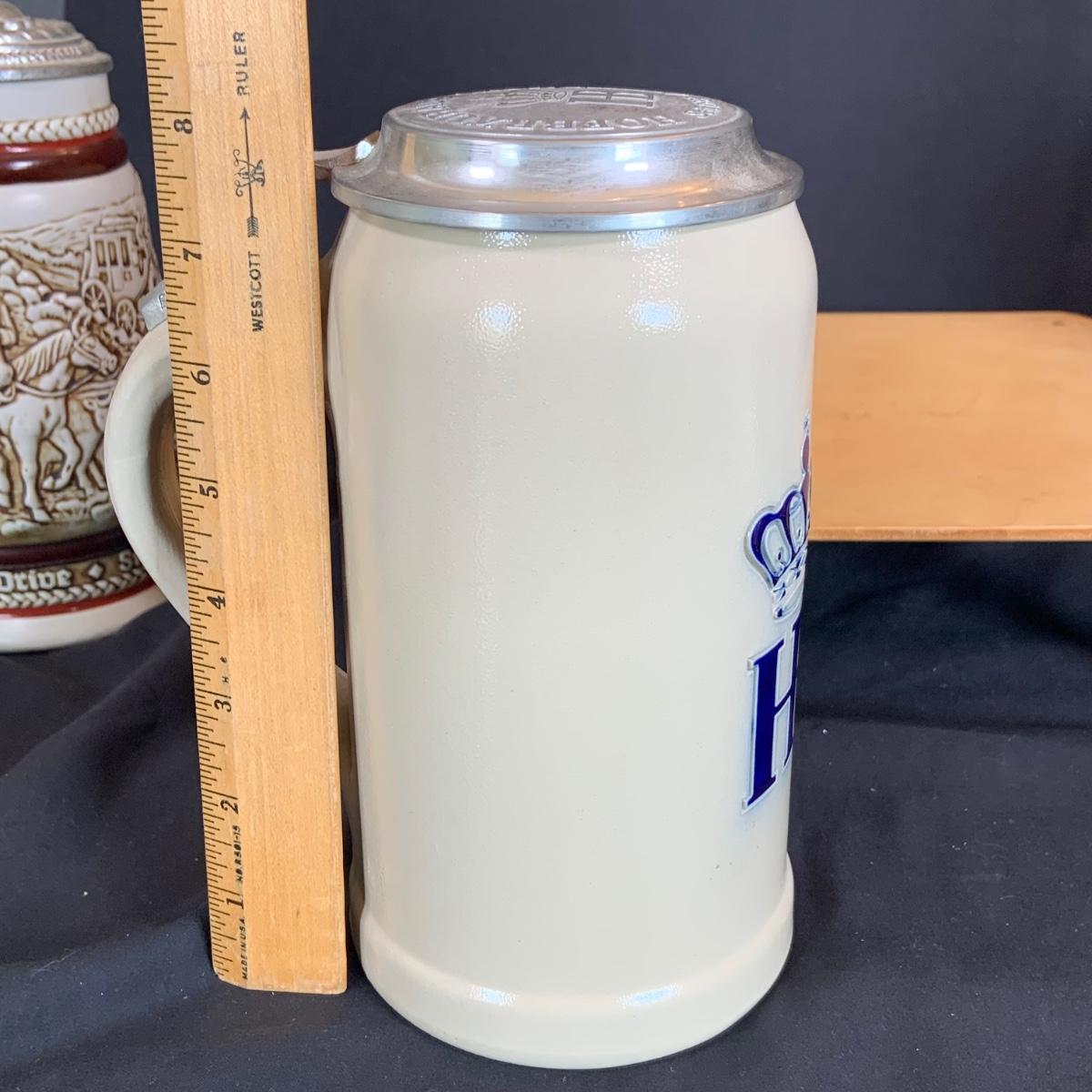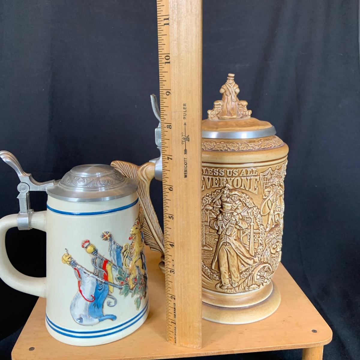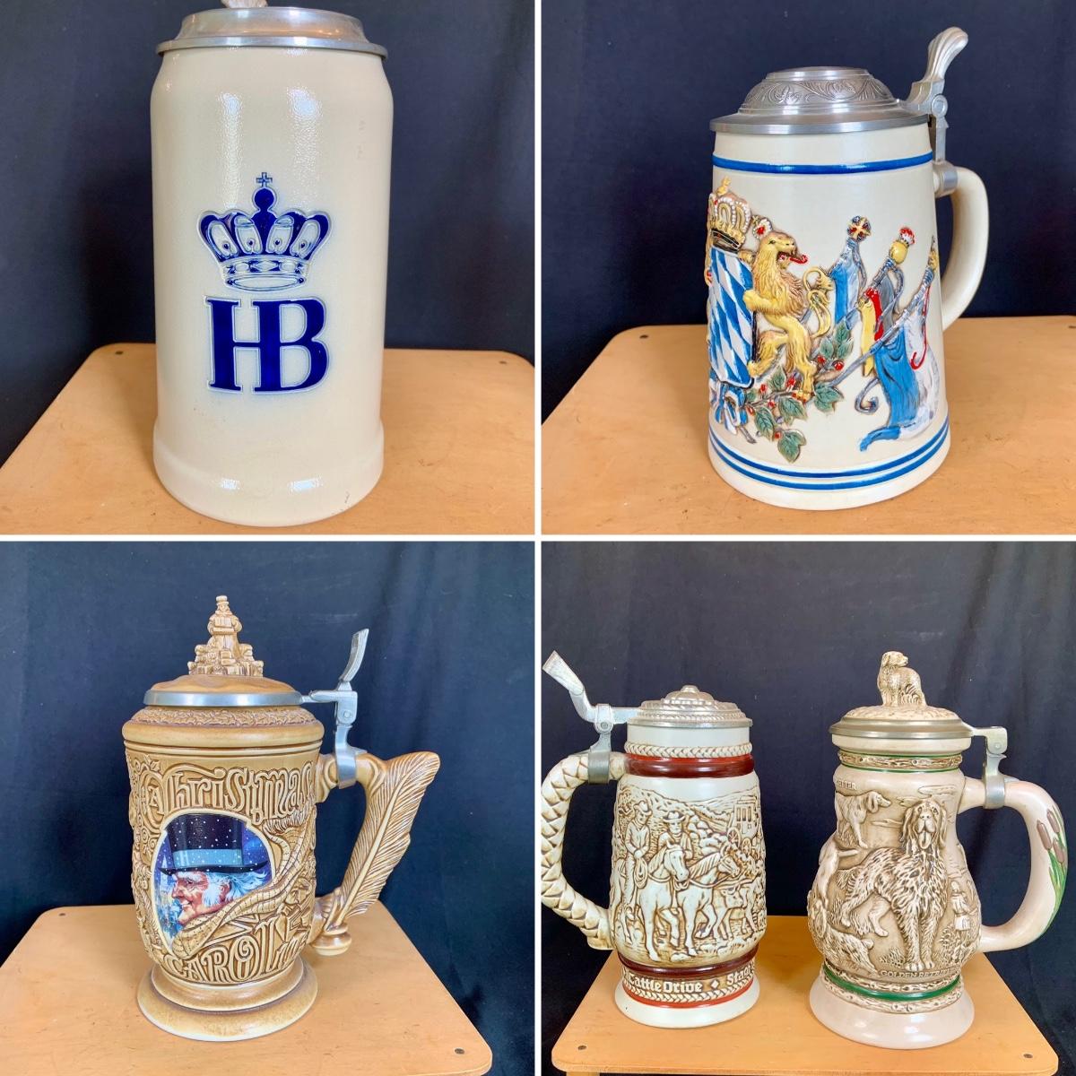 LOT:268: Collection of Vintage Ceramic Beer Including Hofbrauhaus German Stein, Bavarian Coat of Arms Stein and 3 Avon Steins Including Scrooge