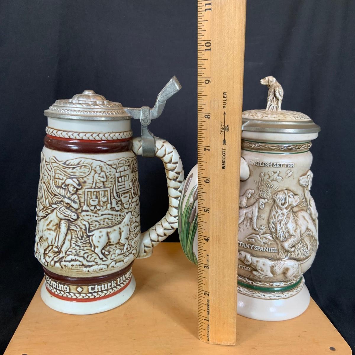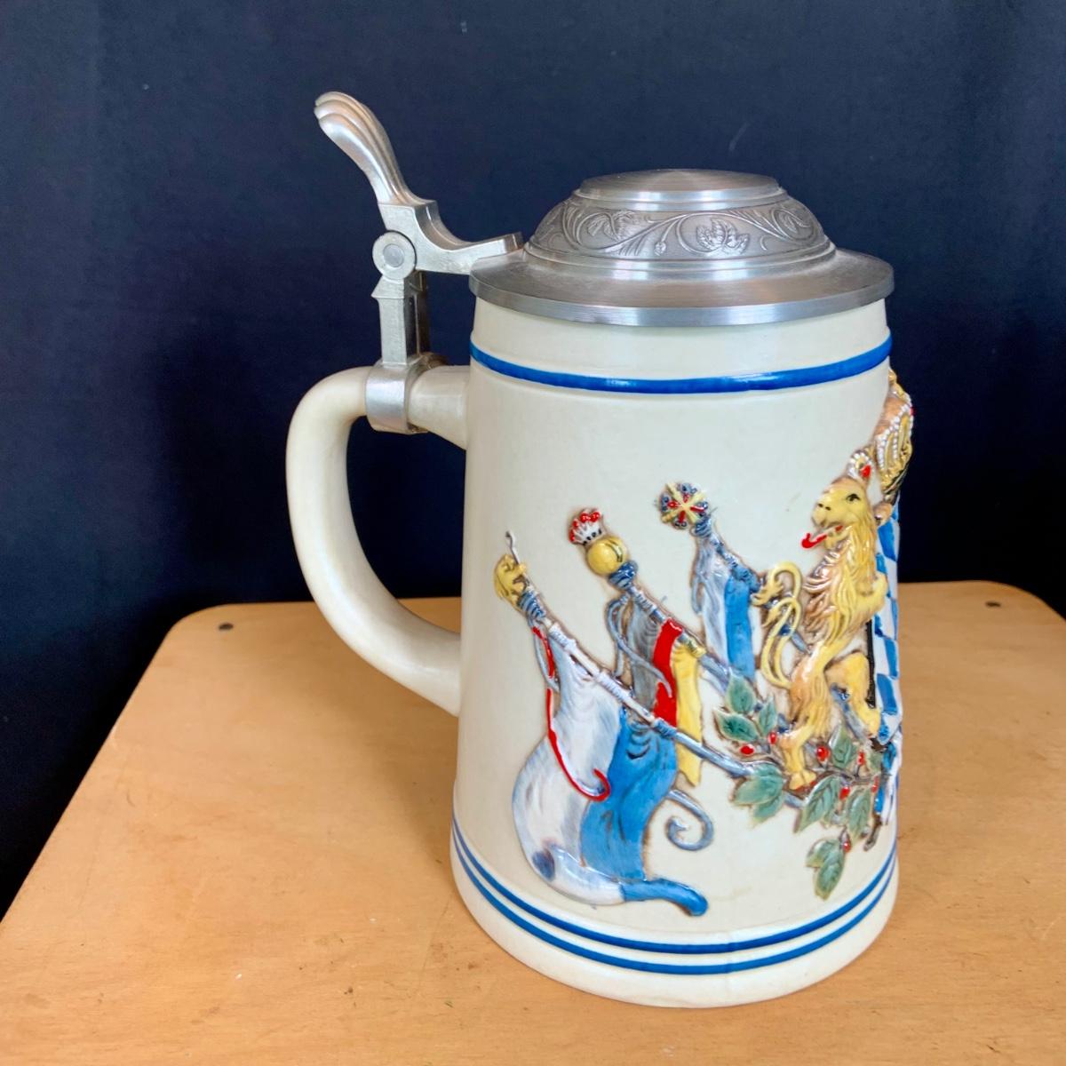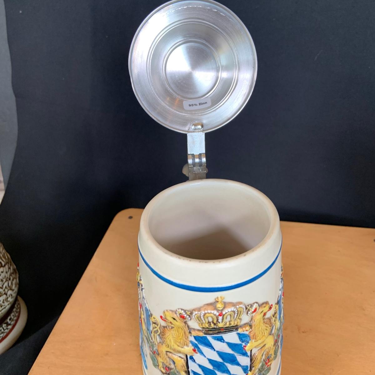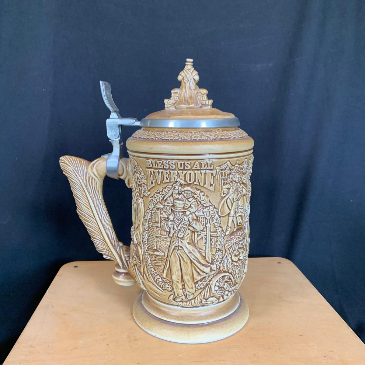 LOT:268: Collection of Vintage Ceramic Beer Including Hofbrauhaus German Stein, Bavarian Coat of Arms Stein and 3 Avon Steins Including Scrooge
