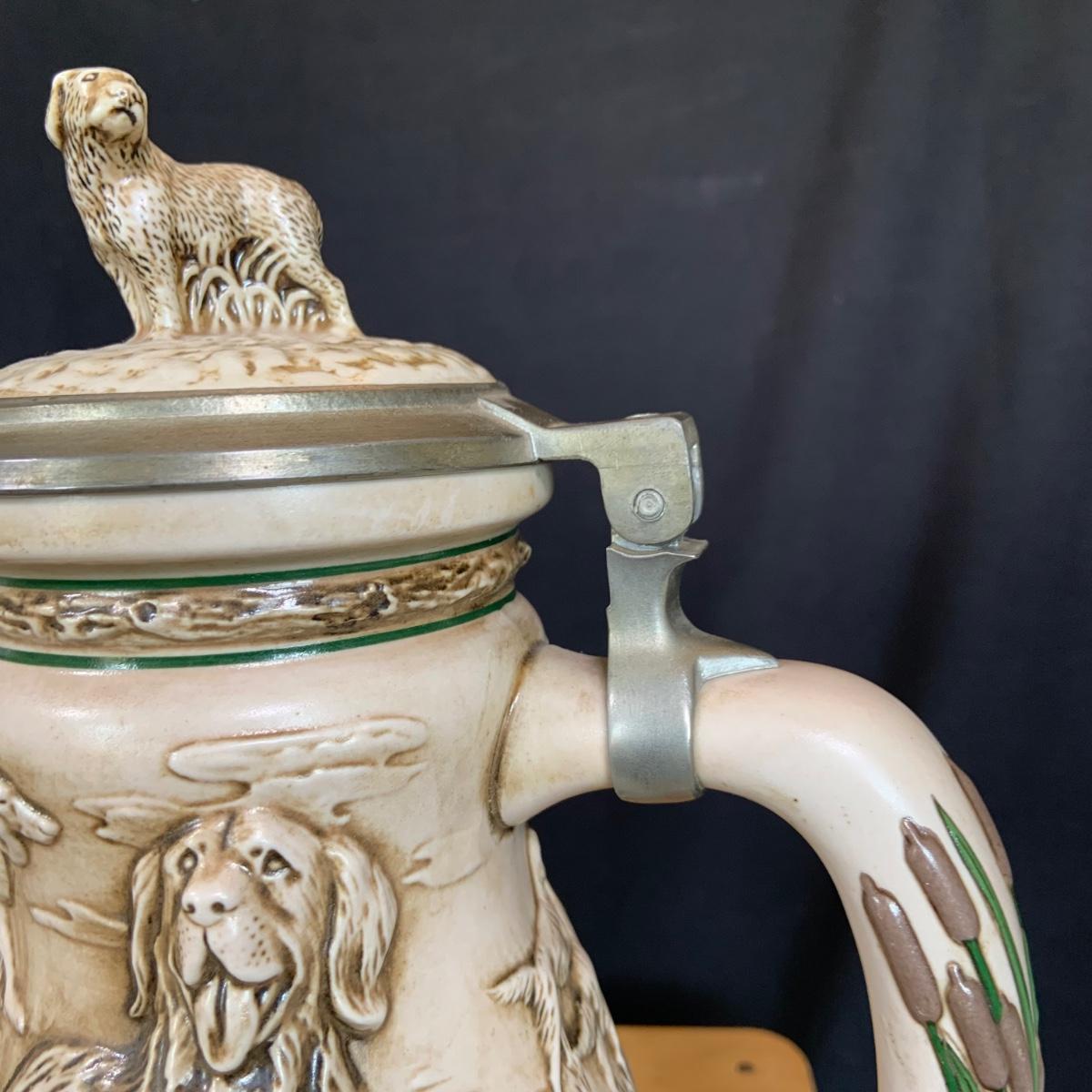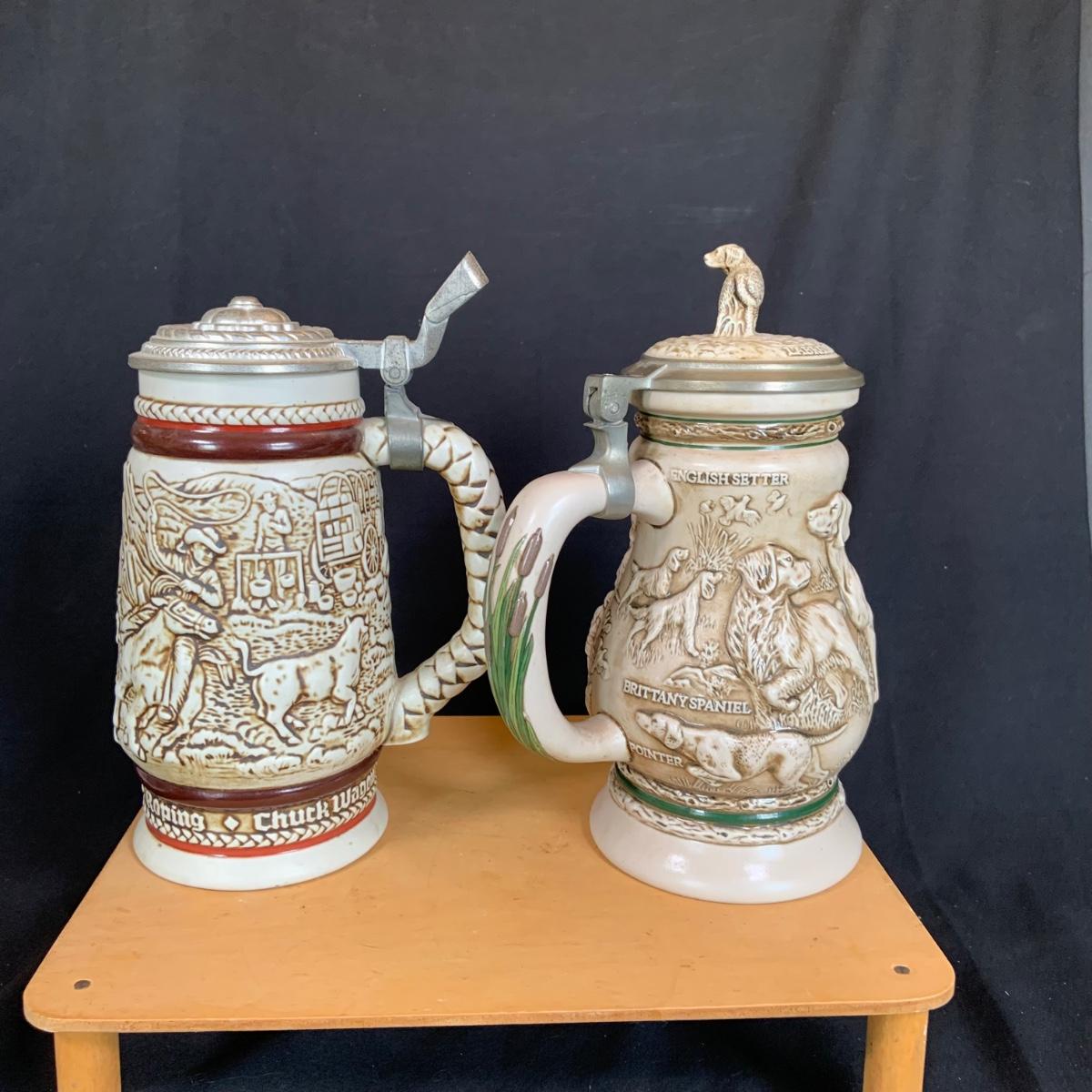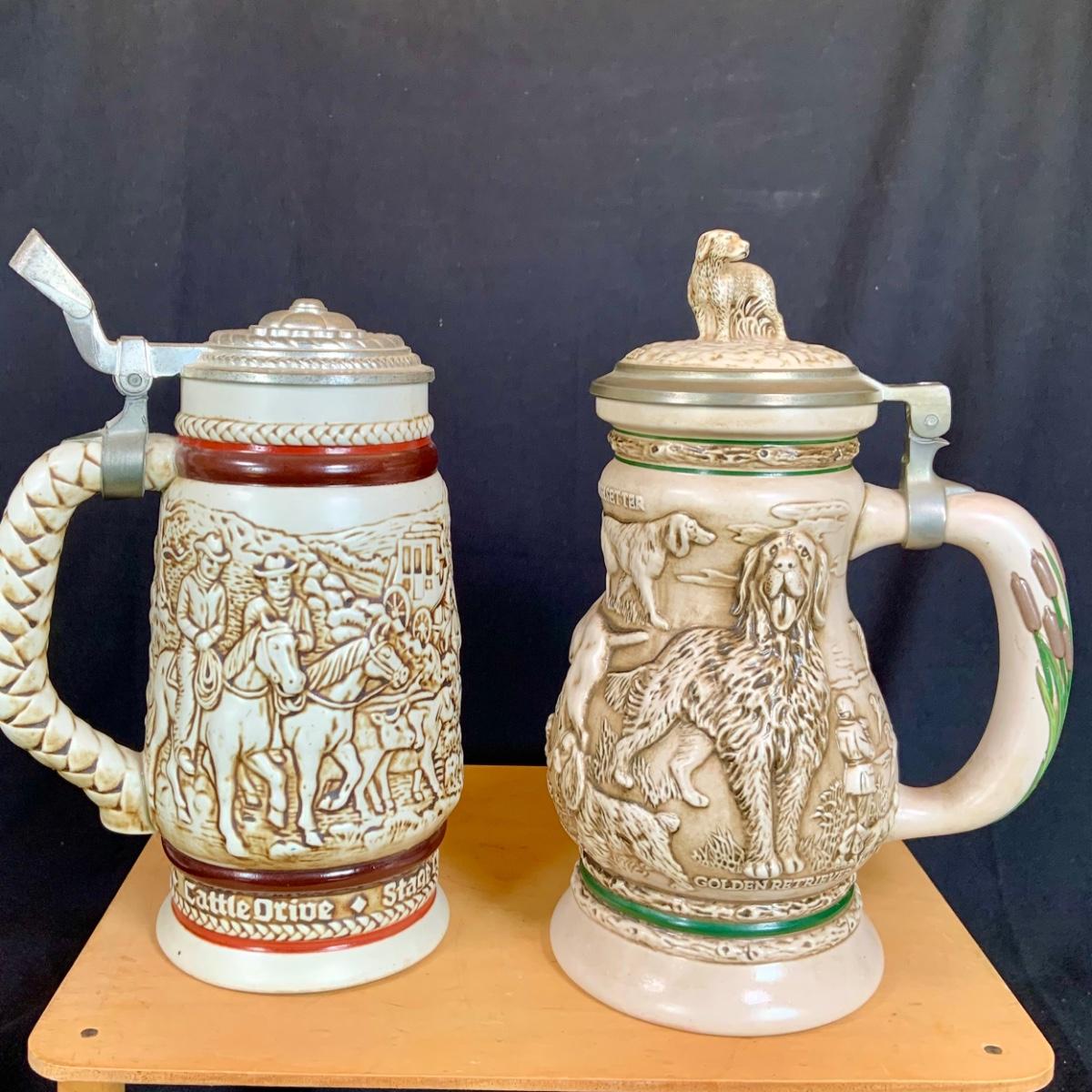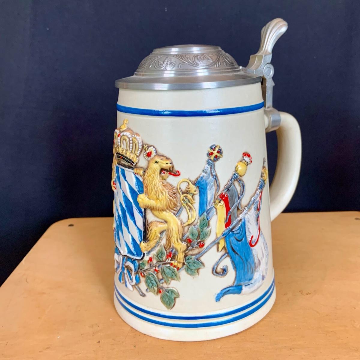 LOT:268: Collection of Vintage Ceramic Beer Including Hofbrauhaus German Stein, Bavarian Coat of Arms Stein and 3 Avon Steins Including Scrooge