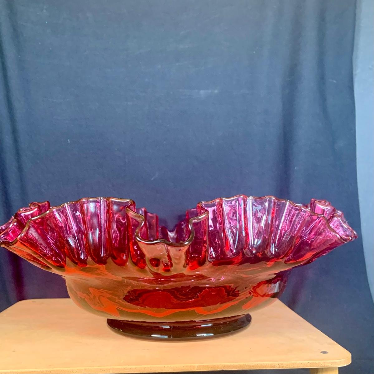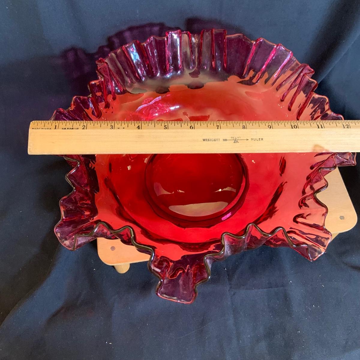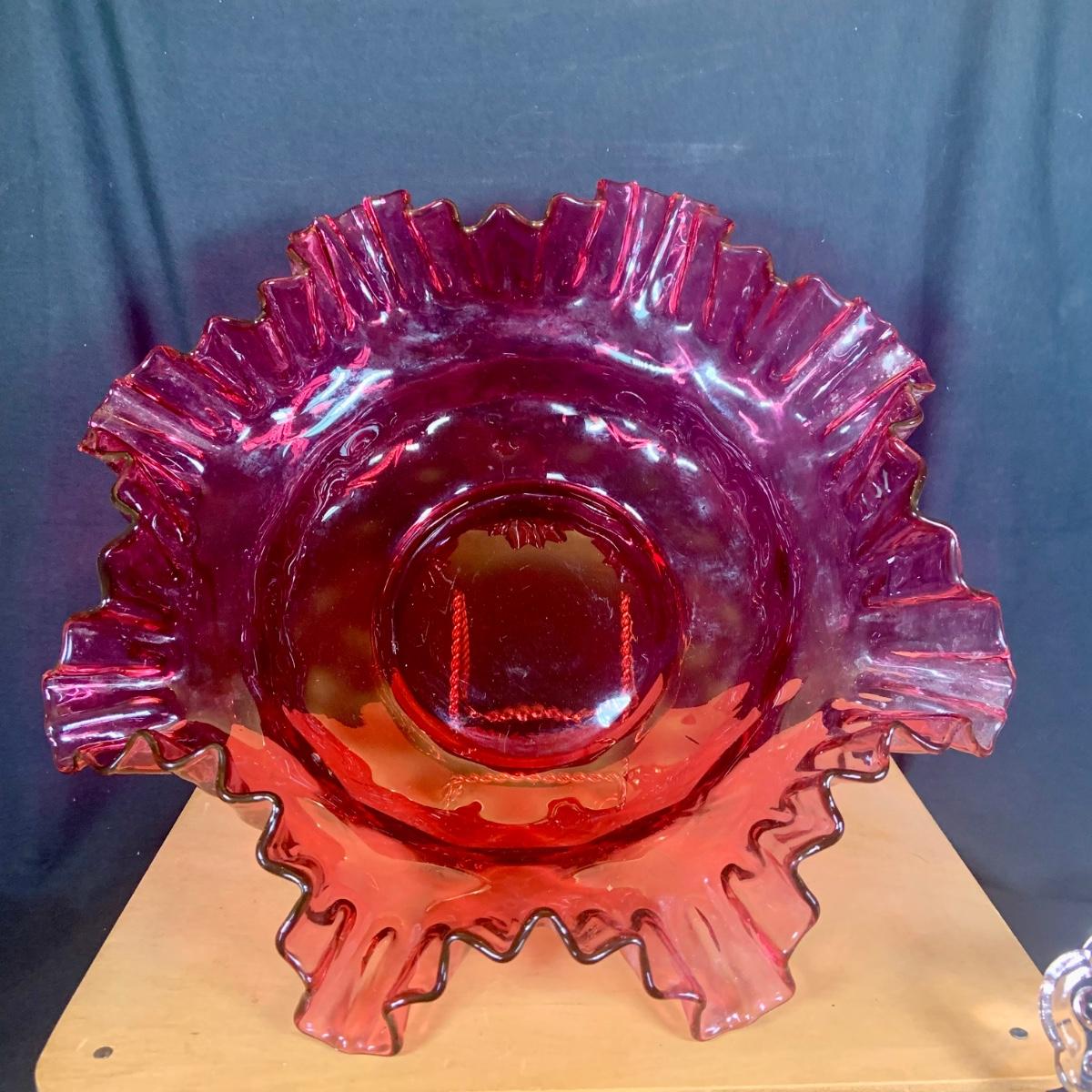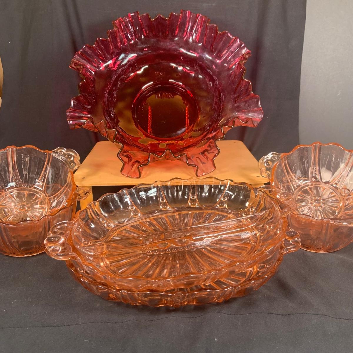 LOT:273: Fenton Cranberry Glass Bowl with Ruffles, Pink Depression Glass Bowls and Divided Serving Dish