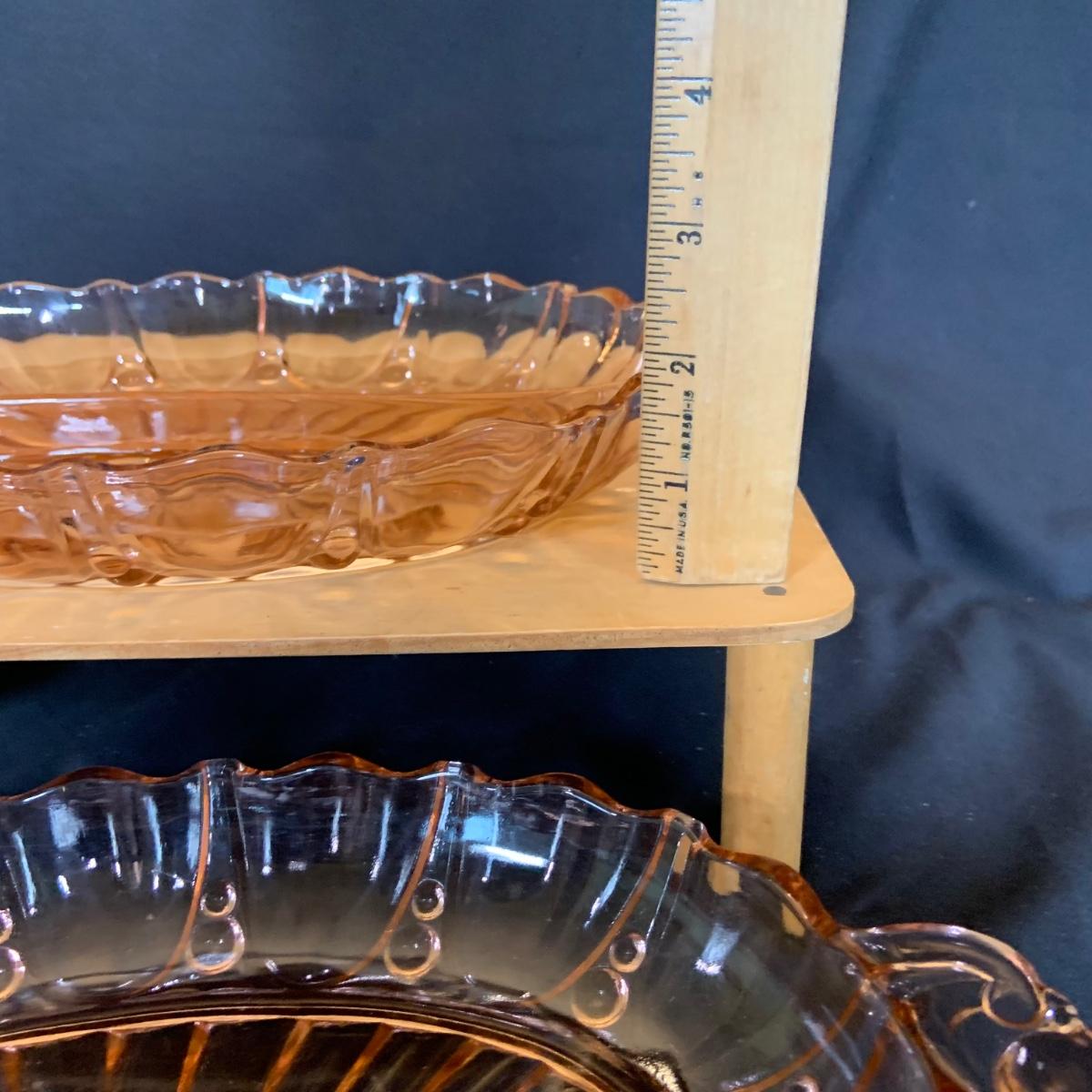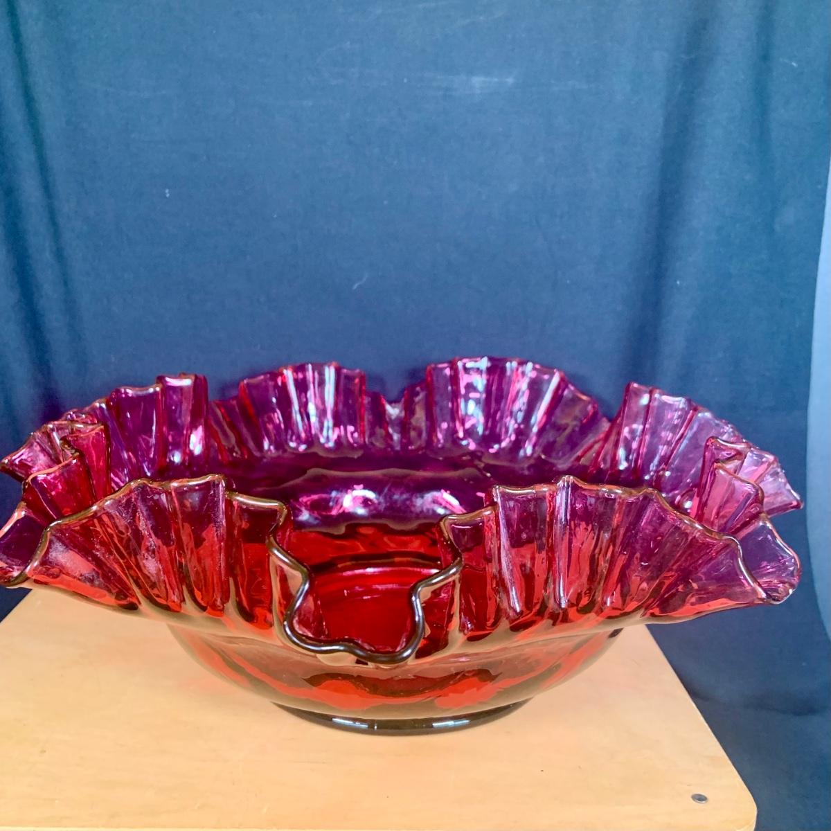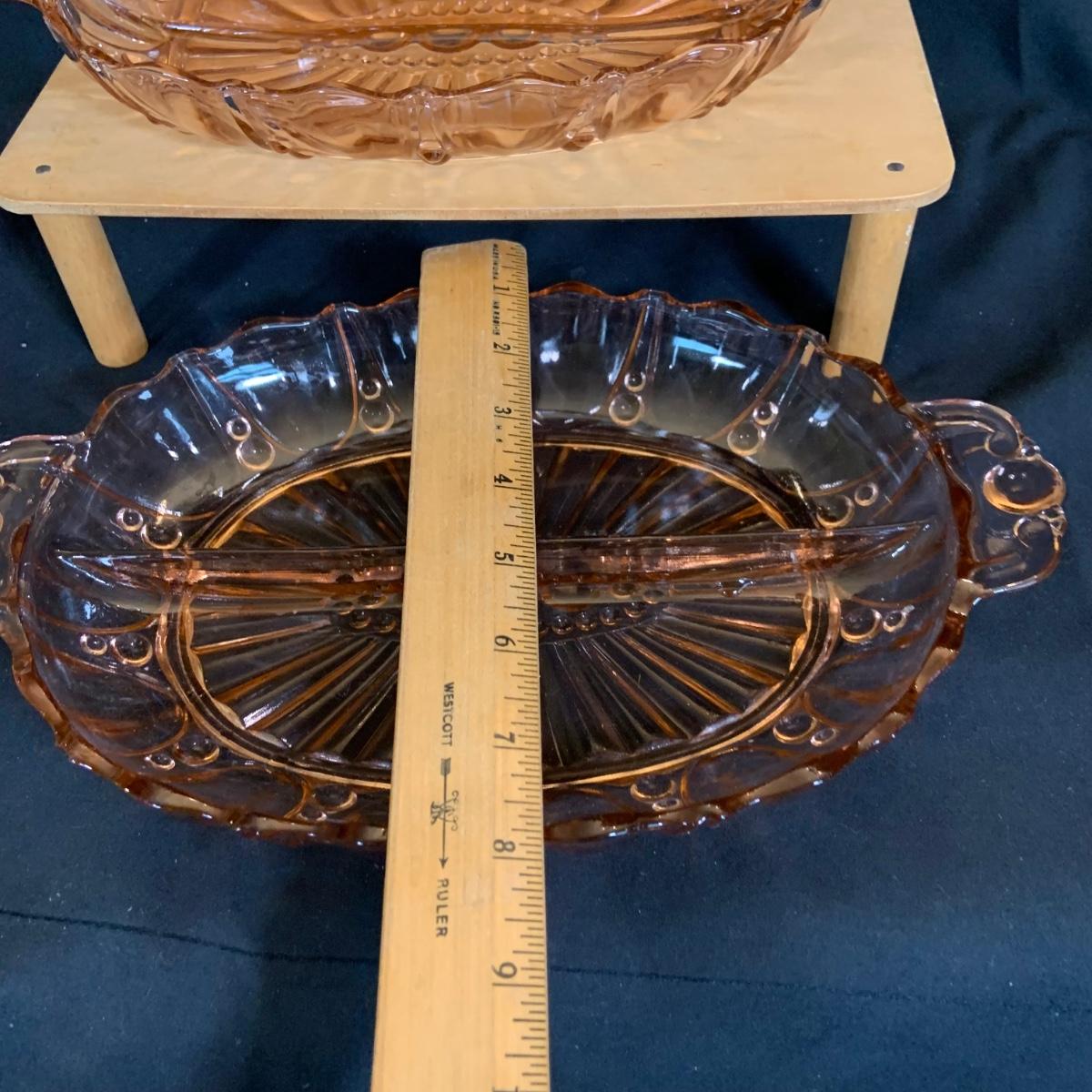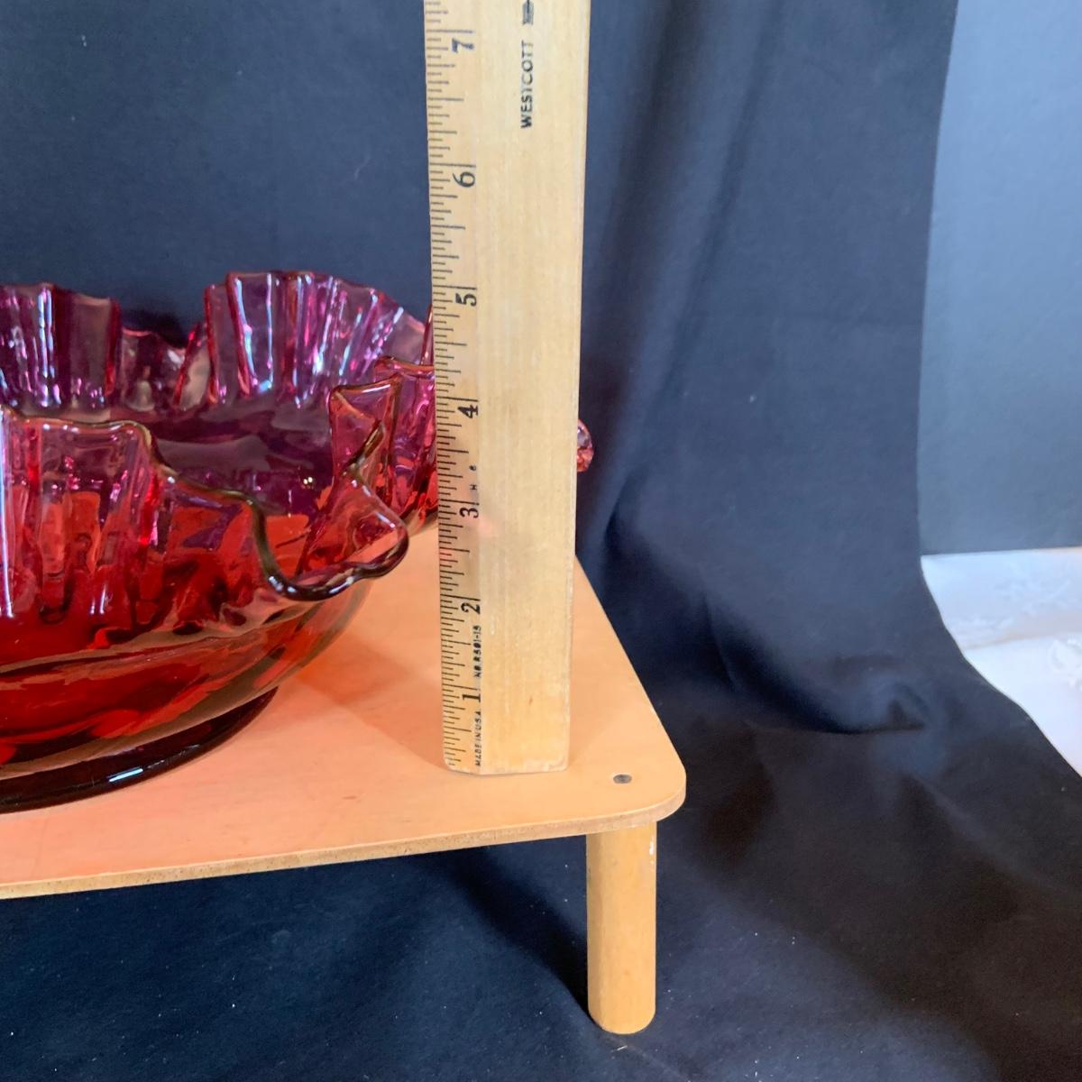 LOT:273: Fenton Cranberry Glass Bowl with Ruffles, Pink Depression Glass Bowls and Divided Serving Dish